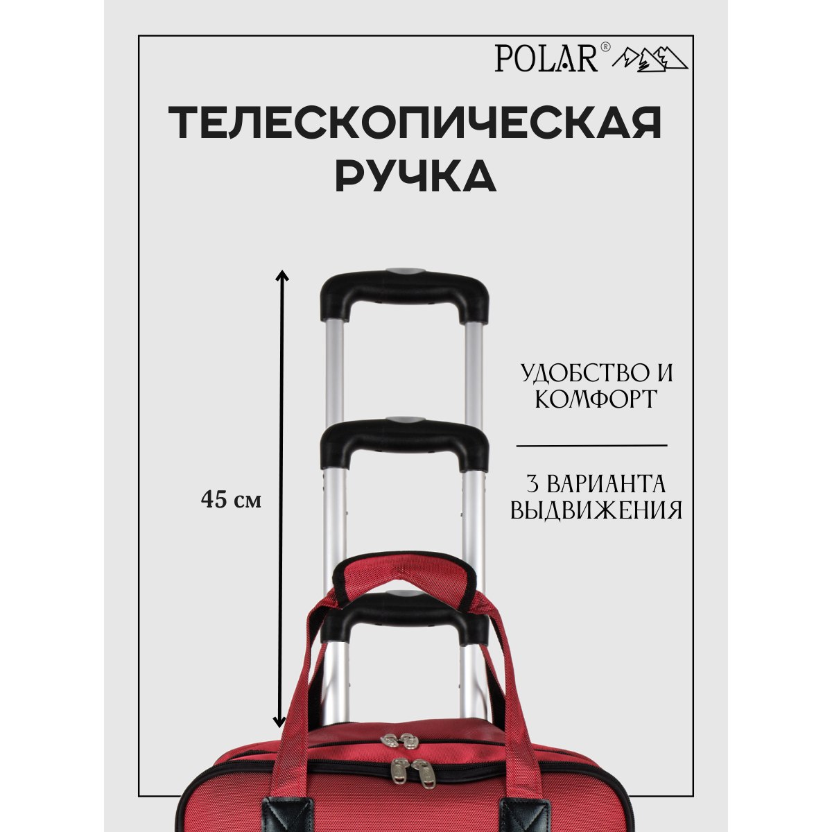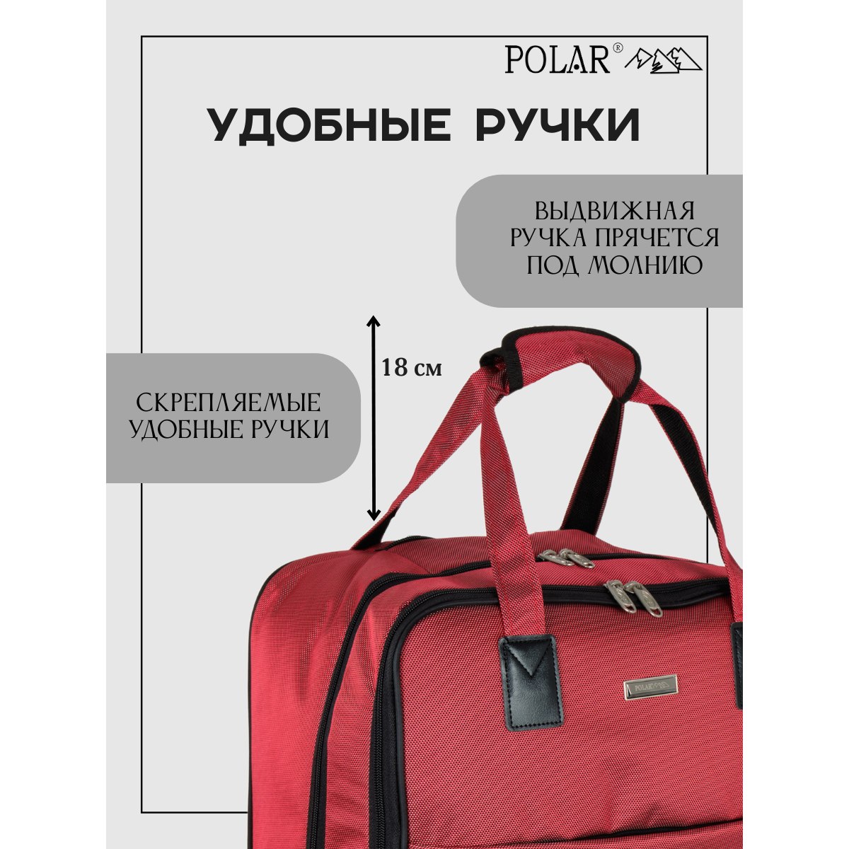 У модели есть две ручки для переноски, высота которых 18 см, и выдвижная металлическая ручка в три сложения высотой 45 см, которую можно убрать под молнию.