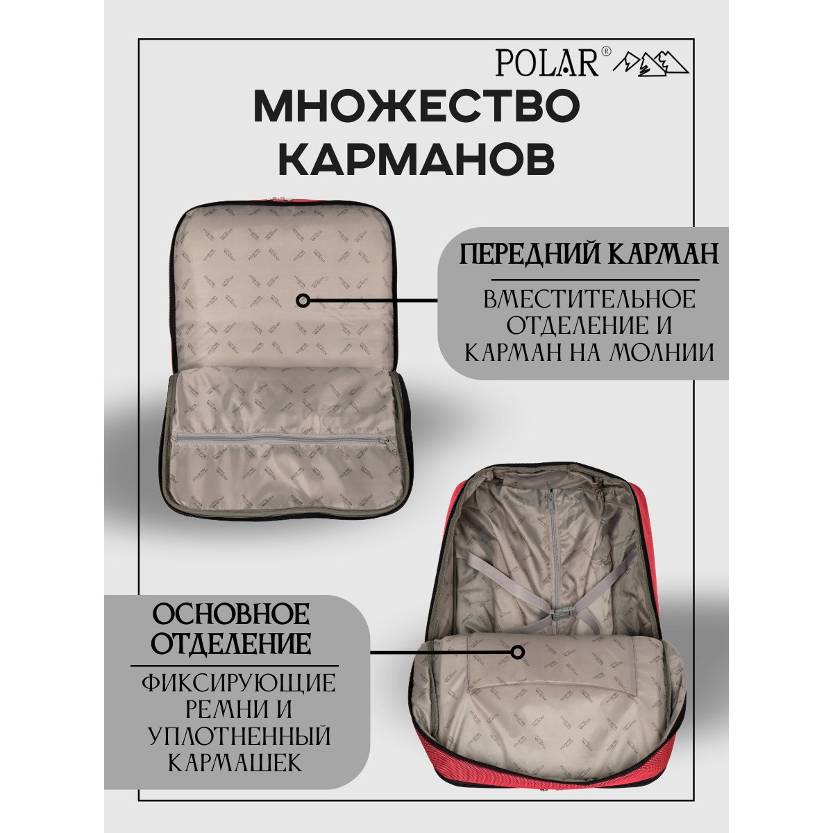 Эта модель дорожной сумки от компании POLAR отлично подойдет для краткосрочных путешествий или командировок. Сумка- чемодан состоит из двух независимых отделений, которые закрываются на двухсторонние молнии. Первое основное просторное отделение для ваших вещей, во втором отделении есть открытый уплотненный карман, в который можно положить документы или планшет, и карман на молнии. Также на передней стенке есть глубокий врезной карман на молнии и накладной карман на молнии, внутри которого два открытых сетчатых кармашка для мелочей.
