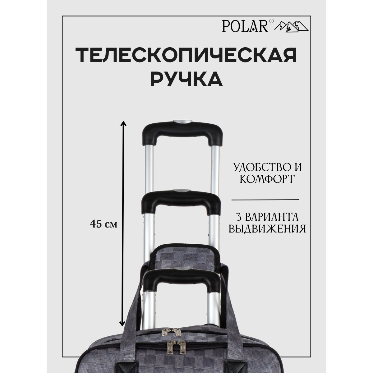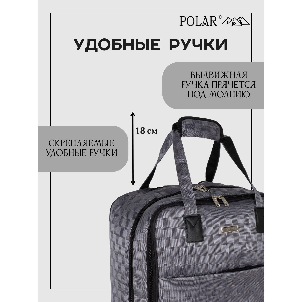 У модели есть две ручки для переноски, высота которых 18 см, и выдвижная металлическая ручка в три сложения высотой 45 см, которую можно убрать под молнию.