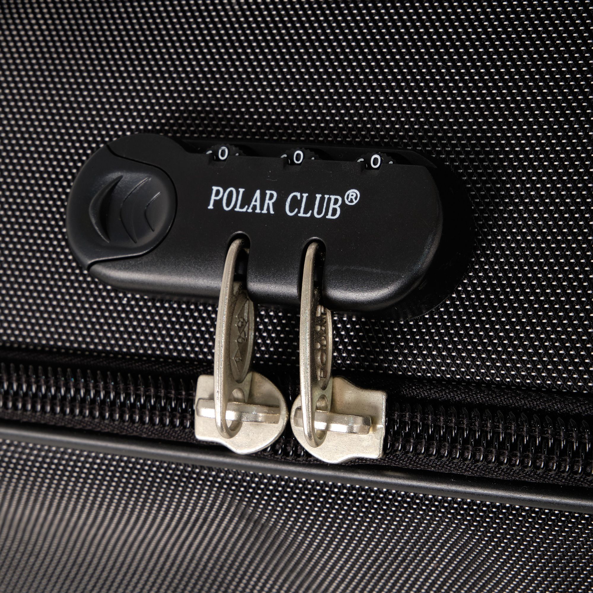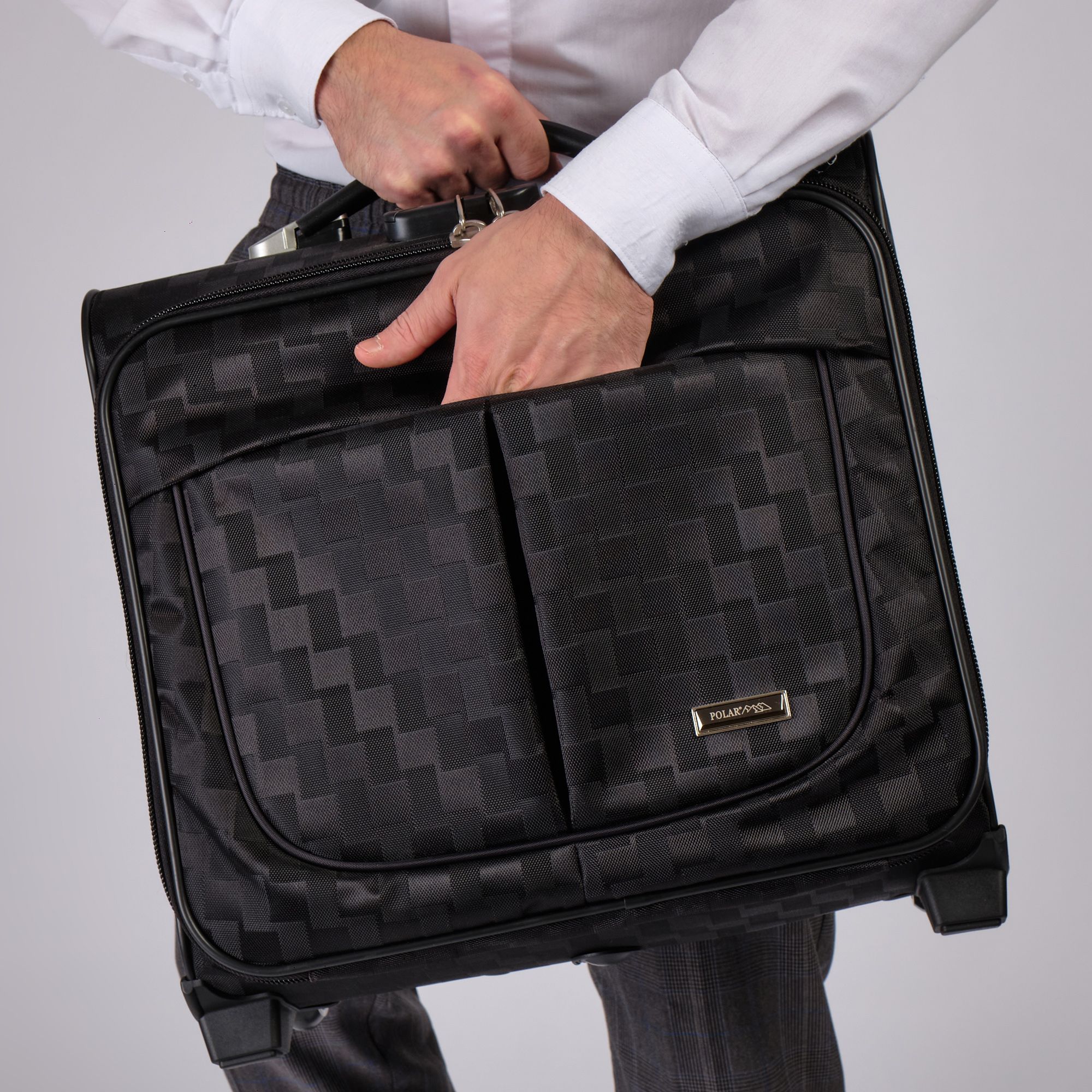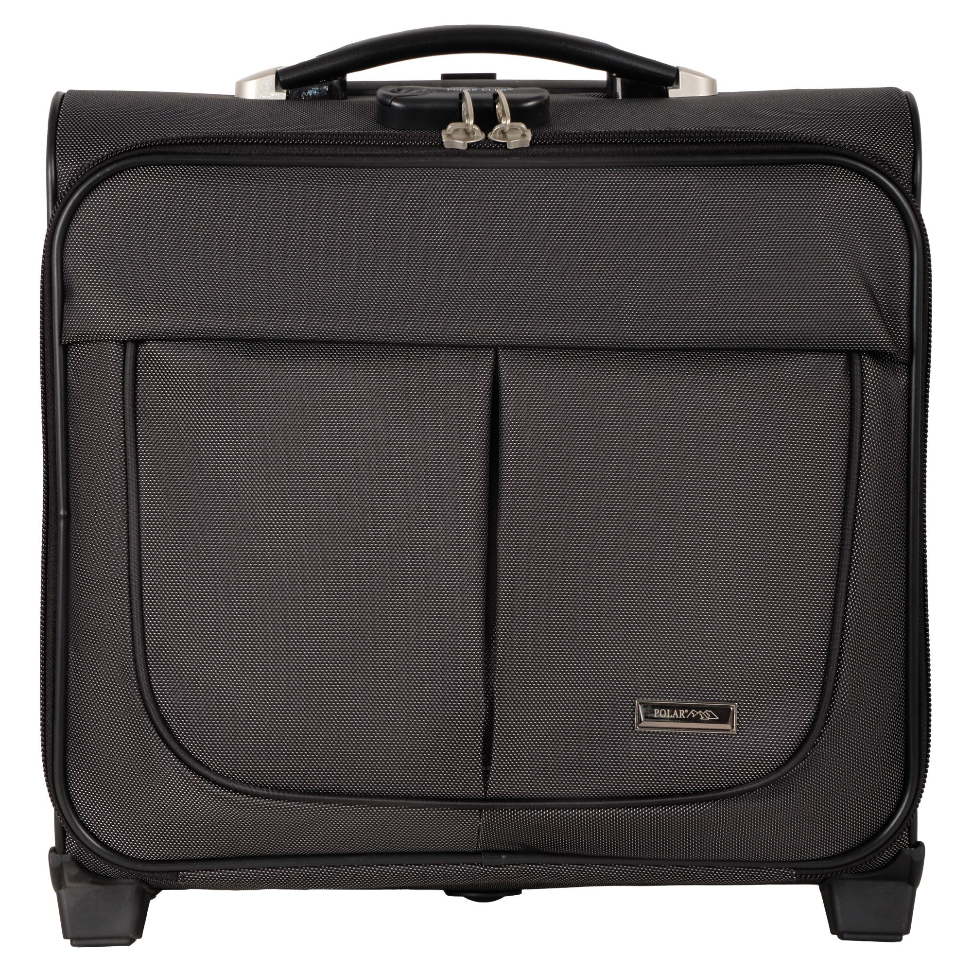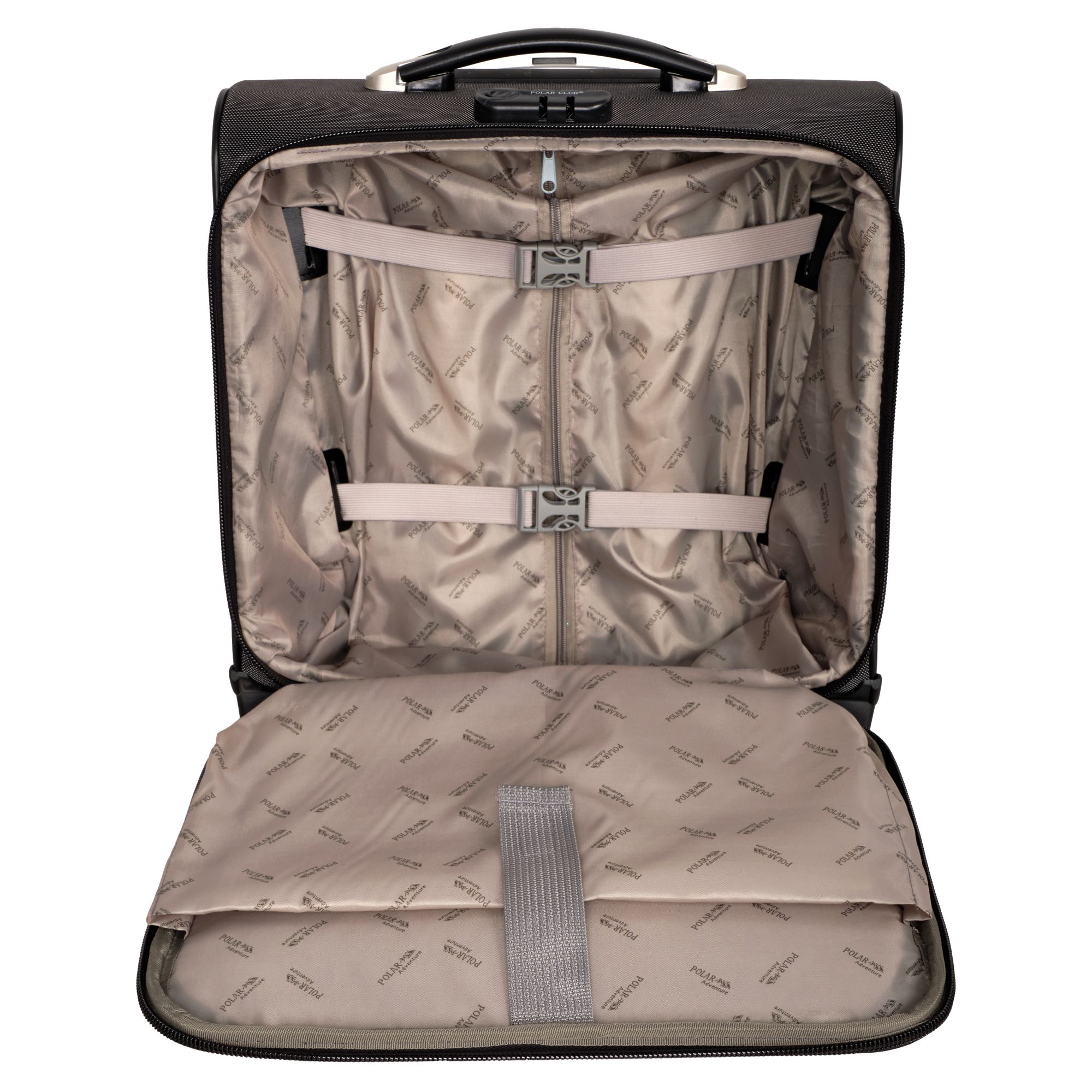 Чемодан от компании "Polar" на двух колёсах выполнен из прочного материала (нейлона и полиэстера). Подходит как ручная кладь. Чемодан закрывается на молнию, присутствует  также встроенный кодовый замок.Внутри есть одно большое отделение , в котором присутствуют ремни для фиксации вещей, отделение для ноутбука и маленький карман на молнии для документов. Снаружи расположен объёмный карман на молнии для мелких вещей. У чемодана есть небольшая ручка для переноски и металлическая ручка, которая выдвигается на 67 см..