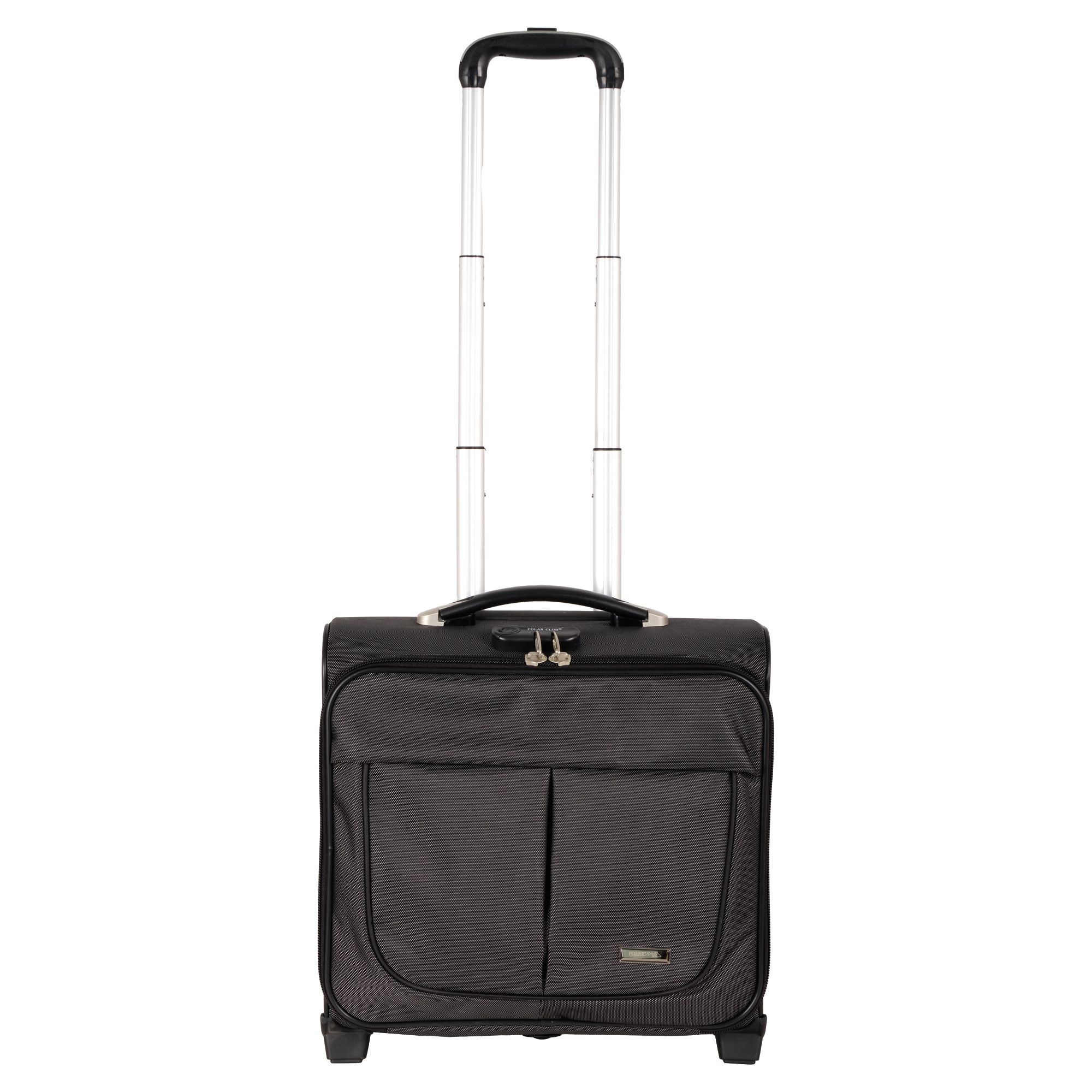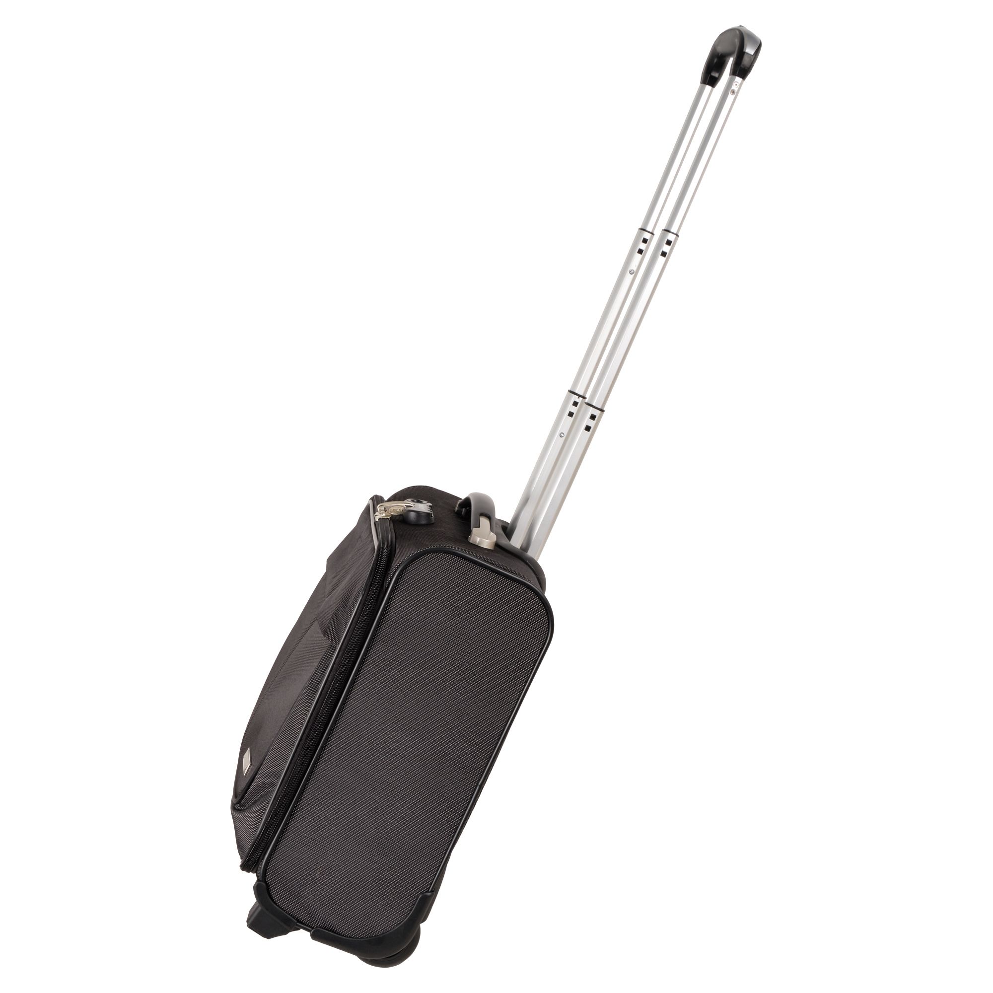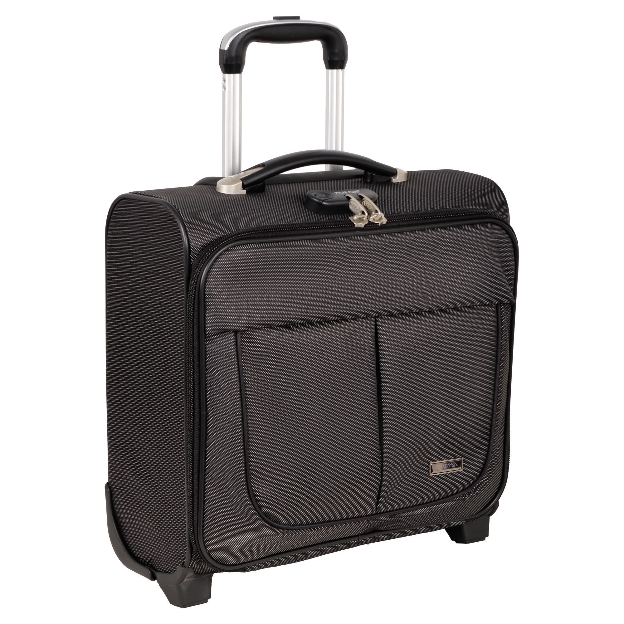 Чемодан от компании "Polar" на двух колёсах выполнен из прочного материала (нейлона и полиэстера). Подходит как ручная кладь. Чемодан закрывается на молнию, присутствует  также встроенный кодовый замок.Внутри есть одно большое отделение , в котором присутствуют ремни для фиксации вещей, отделение для ноутбука и маленький карман на молнии для документов. Снаружи расположен объёмный карман на молнии для мелких вещей. У чемодана есть небольшая ручка для переноски и металлическая ручка, которая выдвигается на 67 см..