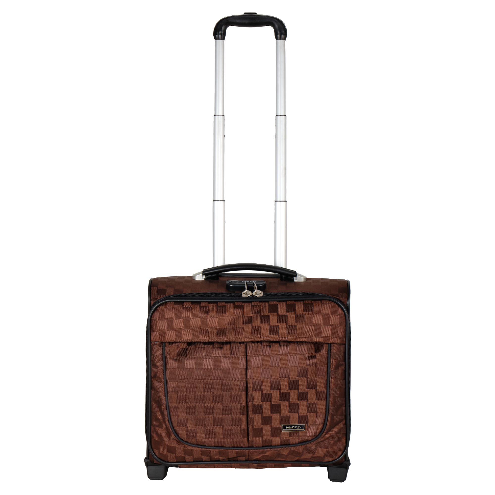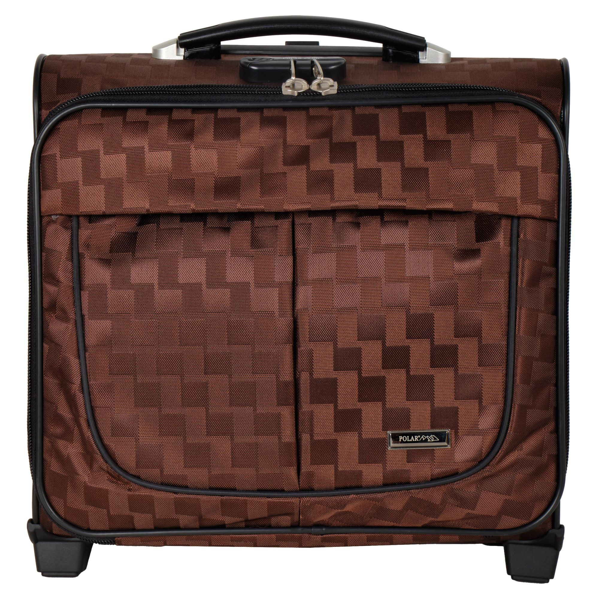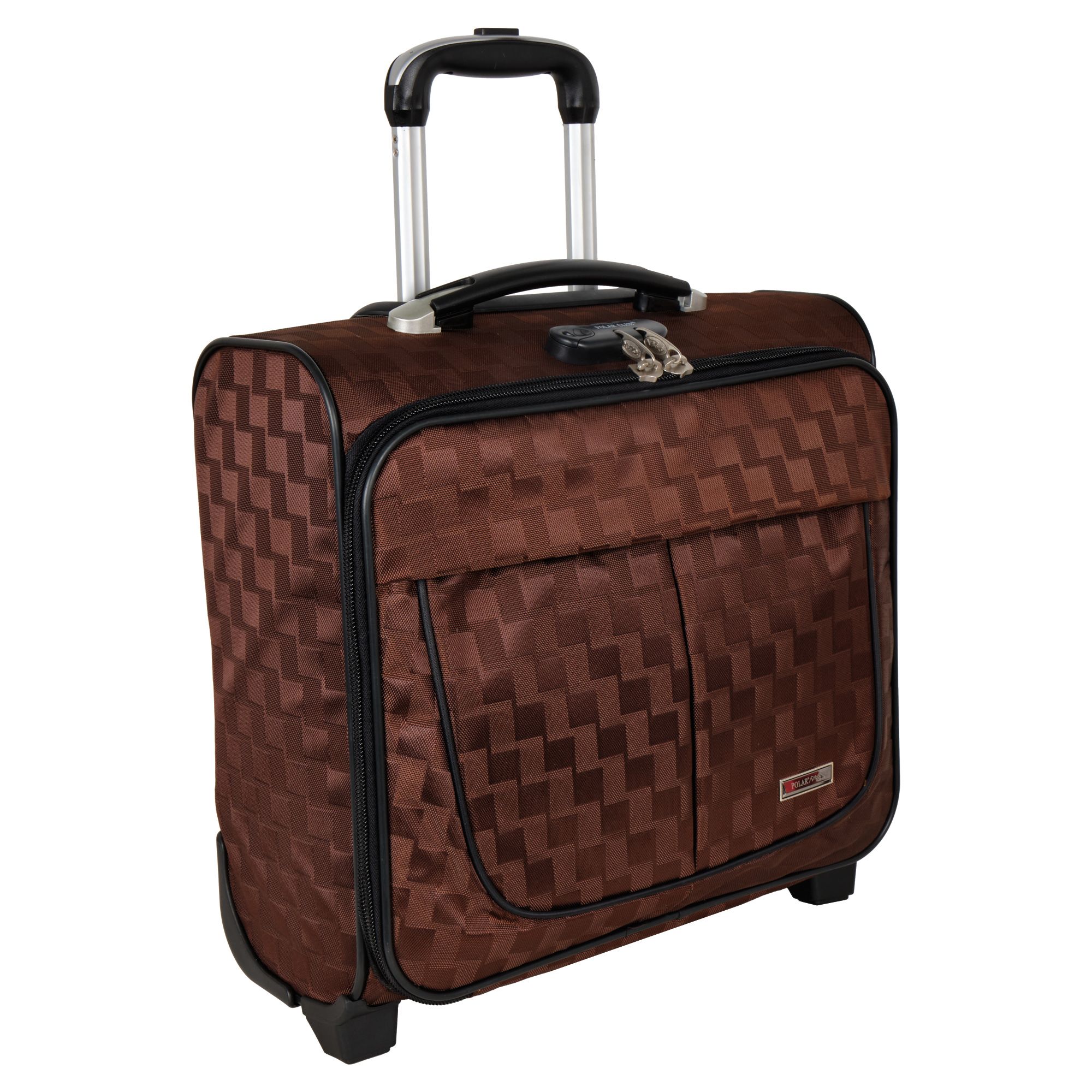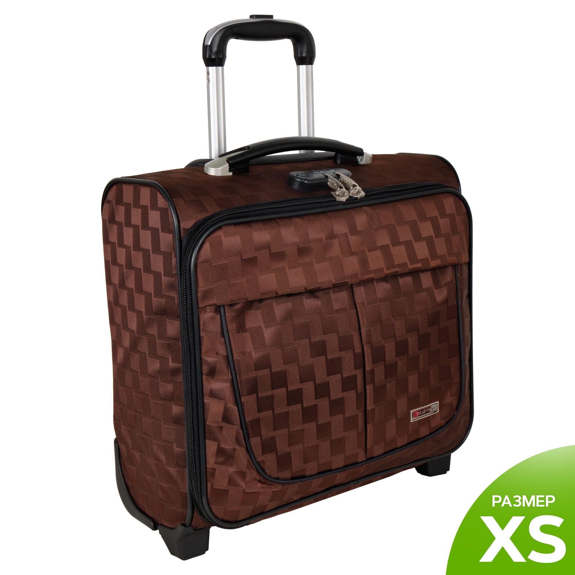 Чемодан от компании "Polar" на двух колёсах выполнен из прочного материала (нейлона и полиэстера). Подходит как ручная кладь. Чемодан закрывается на молнию, присутствует  также встроенный кодовый замок.Внутри есть одно большое отделение , в котором присутствуют ремни для фиксации вещей, отделение для ноутбука и маленький карман на молнии для документов. Снаружи расположен объёмный карман на молнии для мелких вещей. У чемодана есть небольшая ручка для переноски и металлическая ручка, которая выдвигается на 67 см..