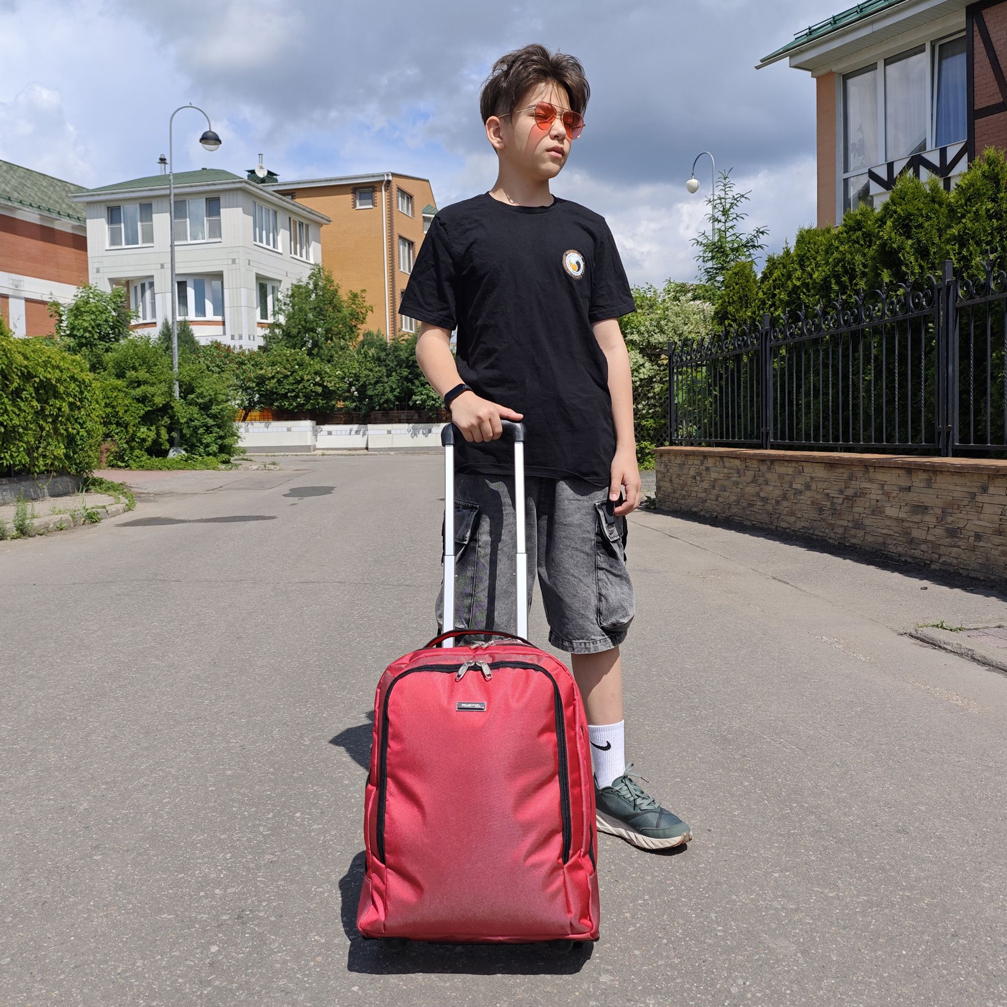 Внутри одно просторное отделение с фиксирующими ремнями для вещей и удобный карман. На передней стенке чемодана есть удобный карман на молнии, внутри которого сетчатый карман для мелочей. Ручка – тележка выдвигается на 50 см, и ее также можно убрать под молнию. Также есть удобная ручка для переноски. Колеса прорезиненные, дно дополнительно защищено от истирания.