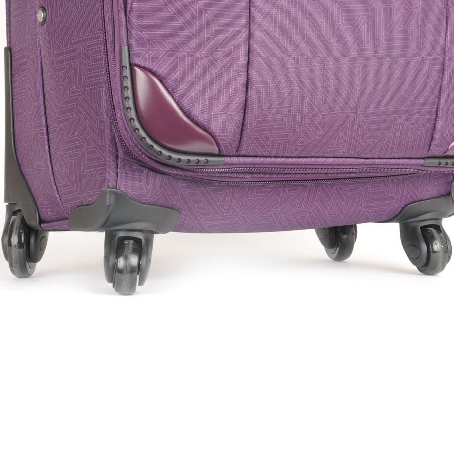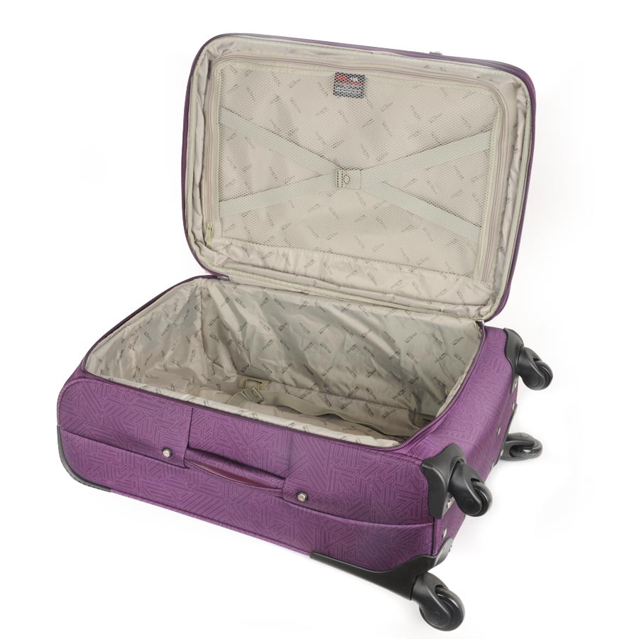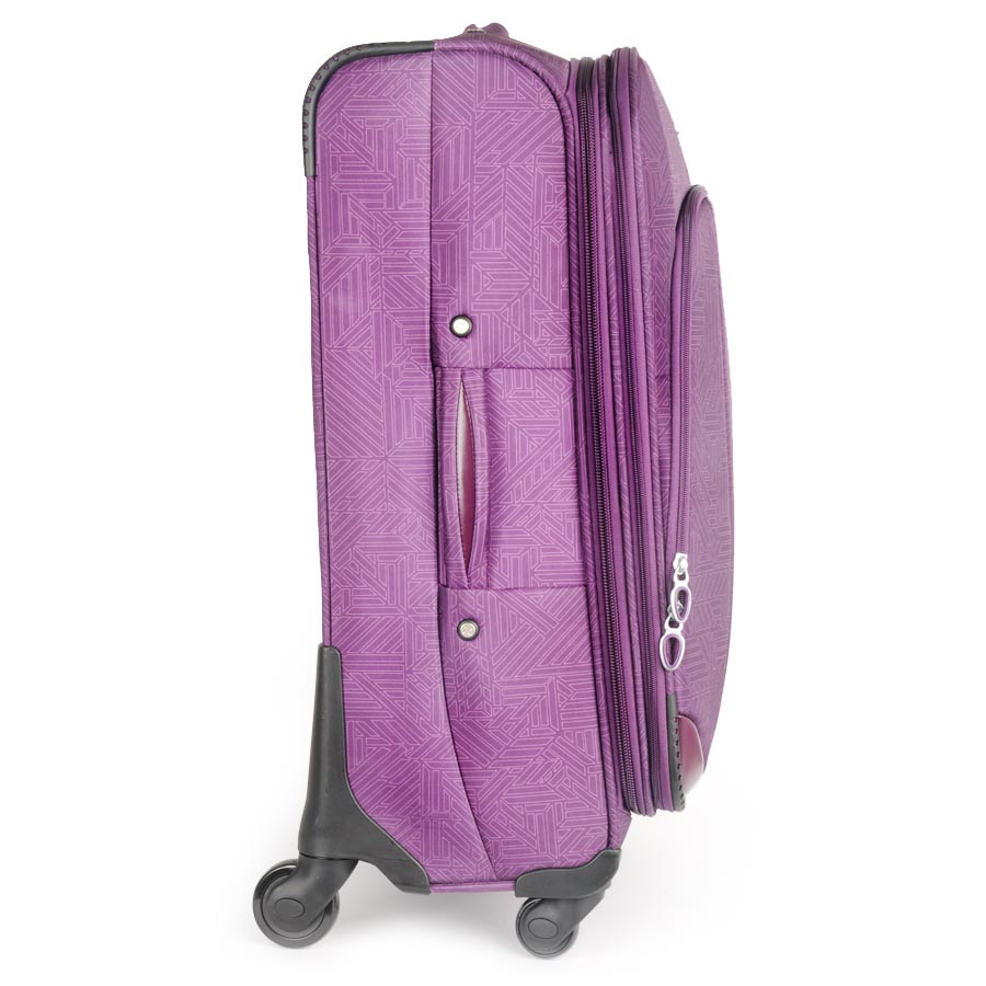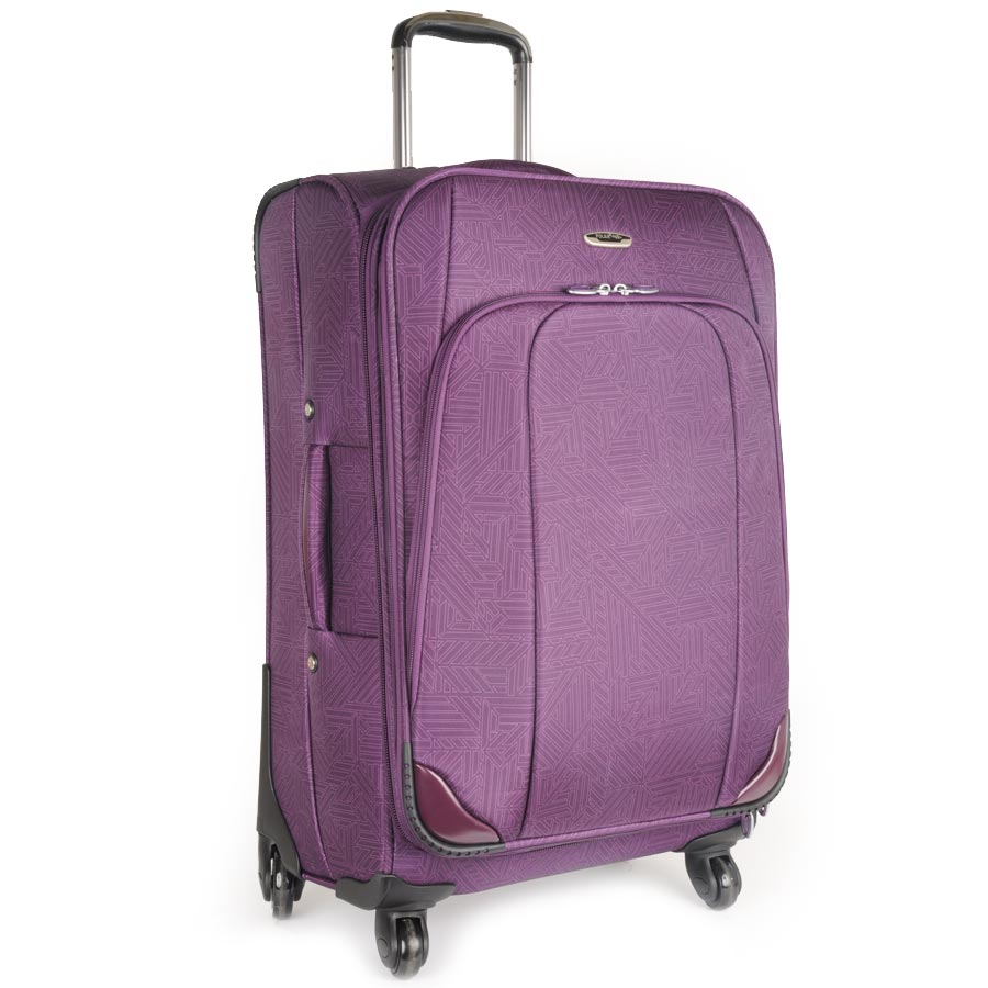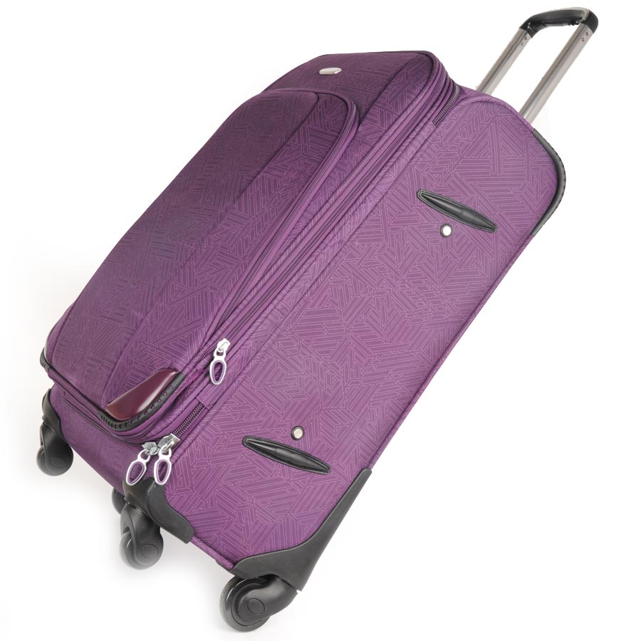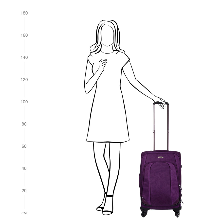 Чемодан на колесах с выдвигающейся ручкой. Основное отделение на подкладке из нейлона с фиксирующими ремнями. Внутри отделение под ноутбук. Объем основного отделения можно увеличить, расстегнув молнию, при этом чемодан увеличивается в толщину на 5см. Снаружи есть карман на молнии для вещей необходимых в дороге. Есть кодовый замок.