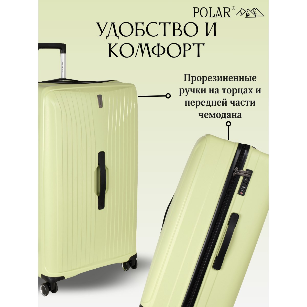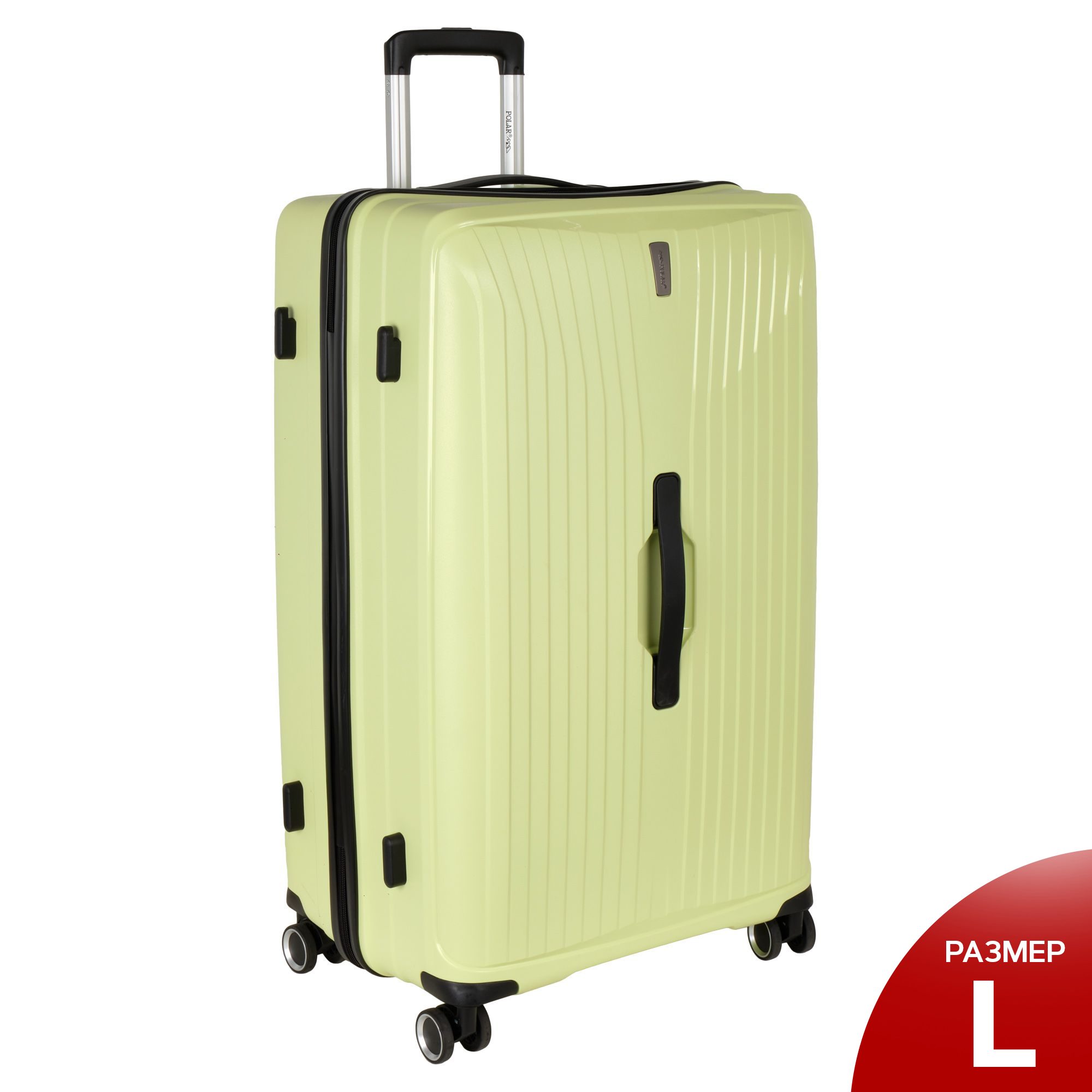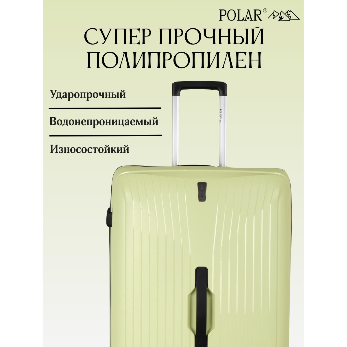 Чемодан малый фирмы POLAR, размер L, выполнен из PP (полипропилен). Основное отделение разделено на две части. Одно имеет фиксирующие ремни, второе на молнии. Выдвигающаяся ручка расположена внутри корпуса чемодана, что способствует большей прочности и защите от ударов при разгрузке/погрузке чемодана. Выдвигающаяся ручка фиксируется в трех положениях. Есть кодовый замок. Надежные 4 колеса.