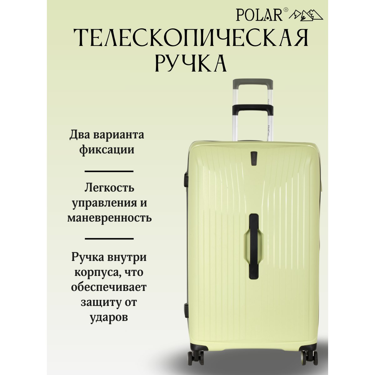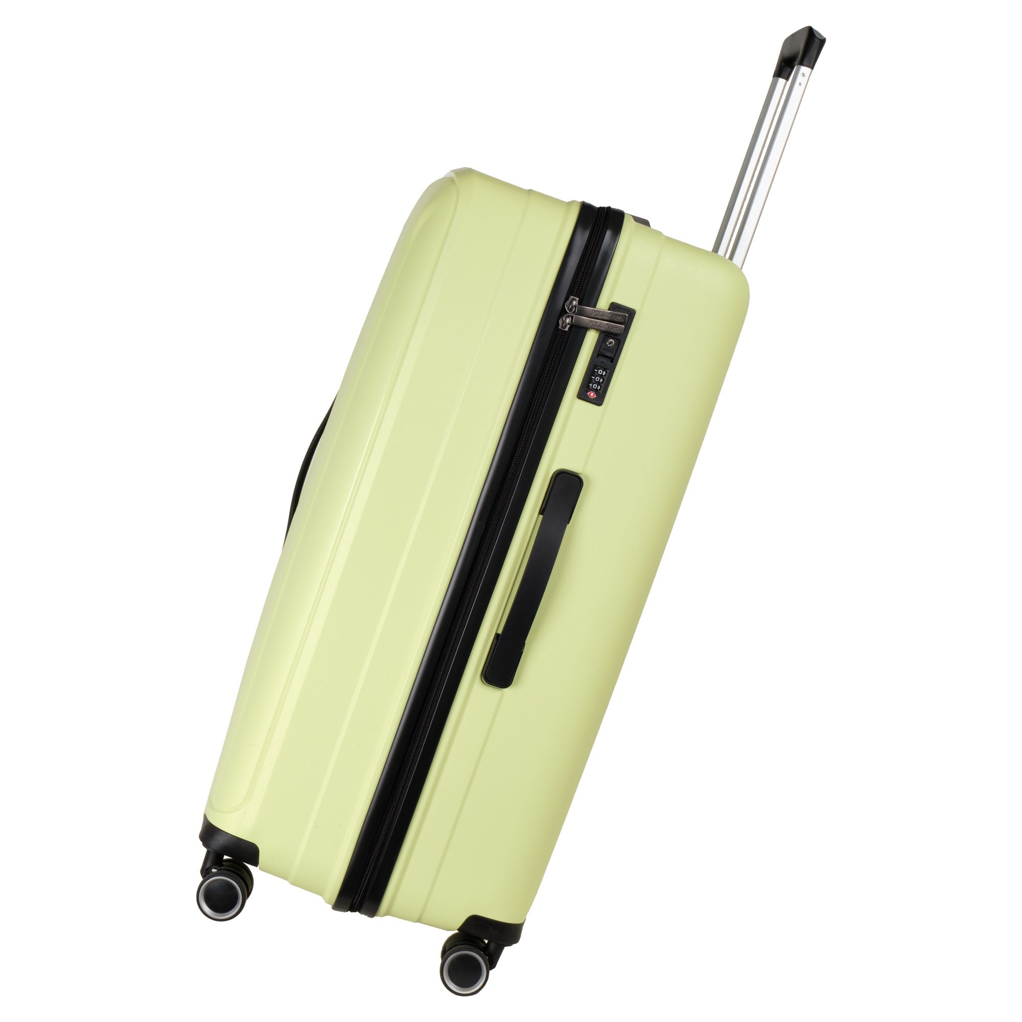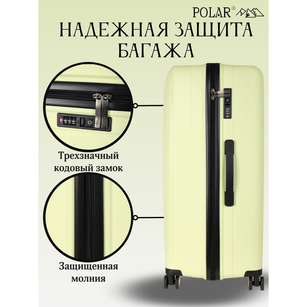 Чемодан малый фирмы POLAR, размер L, выполнен из PP (полипропилен). Основное отделение разделено на две части. Одно имеет фиксирующие ремни, второе на молнии. Выдвигающаяся ручка расположена внутри корпуса чемодана, что способствует большей прочности и защите от ударов при разгрузке/погрузке чемодана. Выдвигающаяся ручка фиксируется в трех положениях. Есть кодовый замок. Надежные 4 колеса.