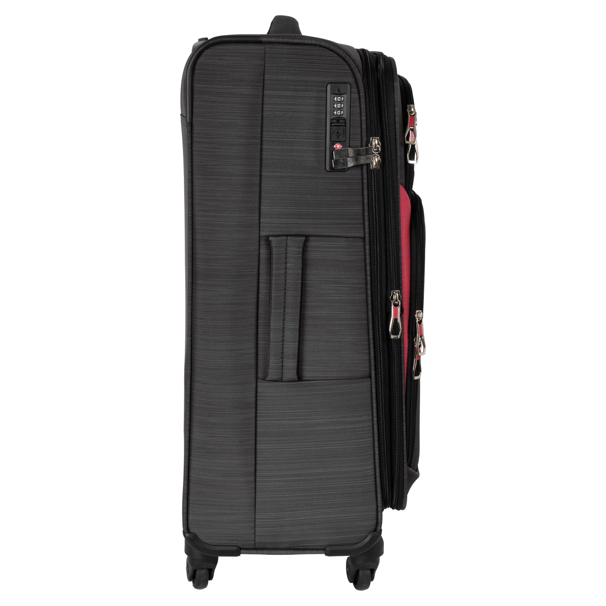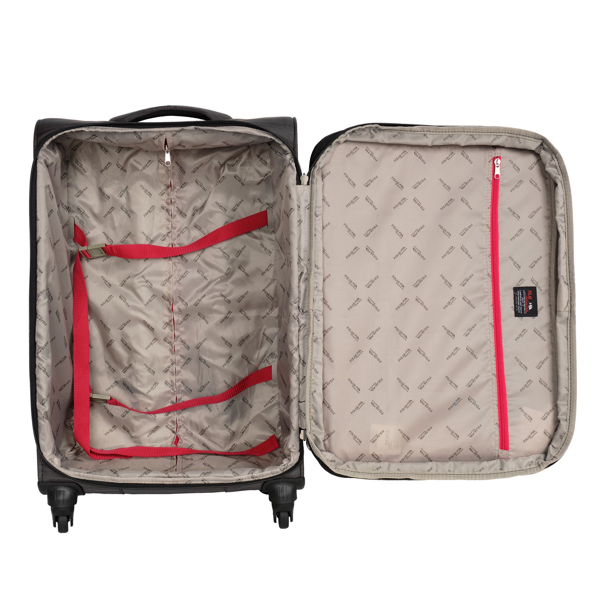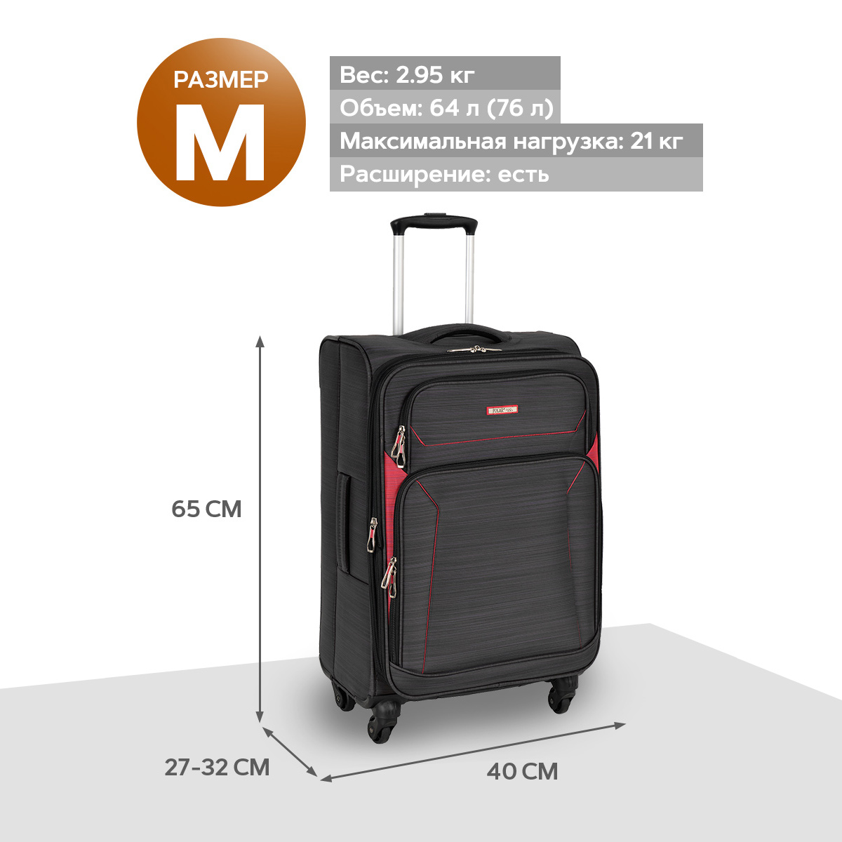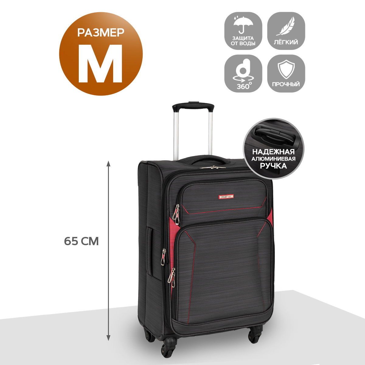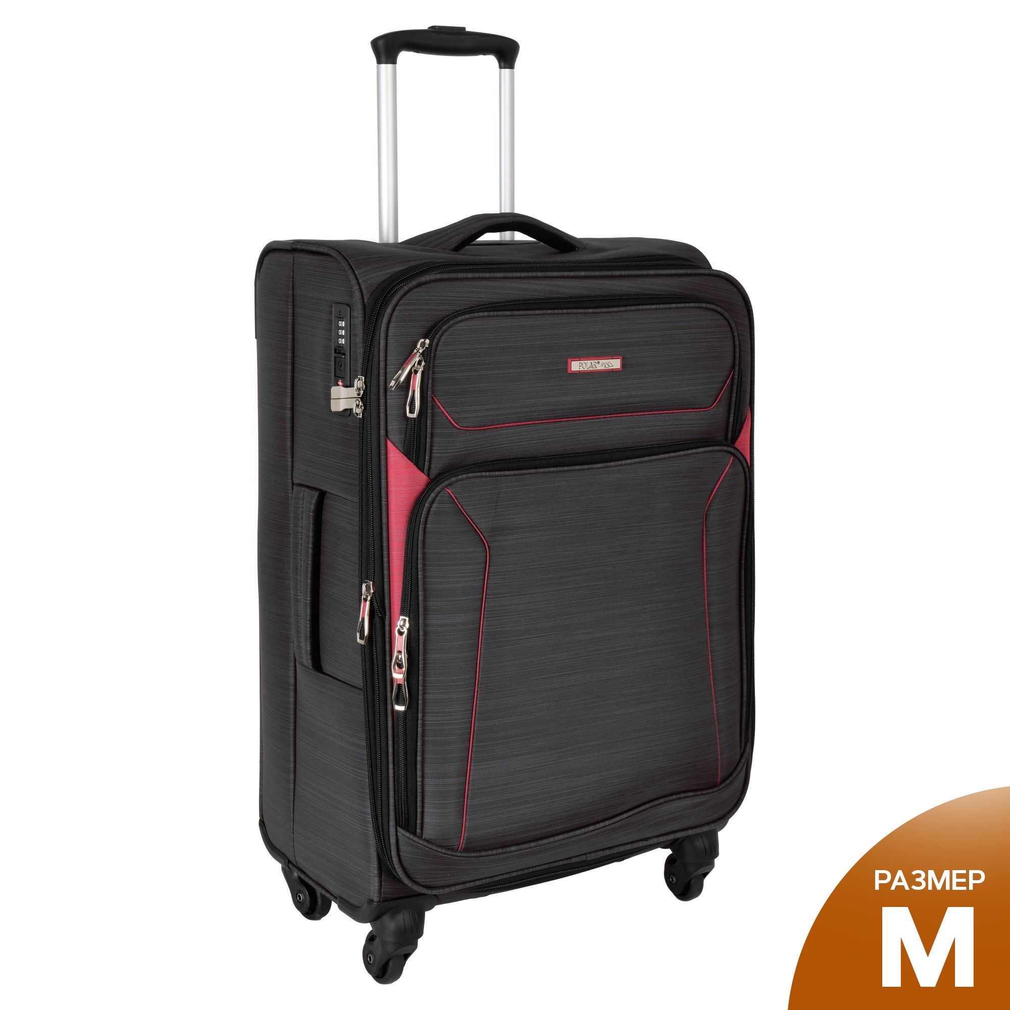 Суперлегкий четырёхколёсный чемодан POLAR. Основное отделение чемодана закрывается на молнию. Впереди два кармана и боковой карман на молнии. Чемодан раздвигается на 5 см. Максимальный объем при увеличении 76.5 л.. Четырёхколёсный чемодан более маневренный и удобный по сравнению с двухколёсным - 4 колеса вращаются на 360 градусов.