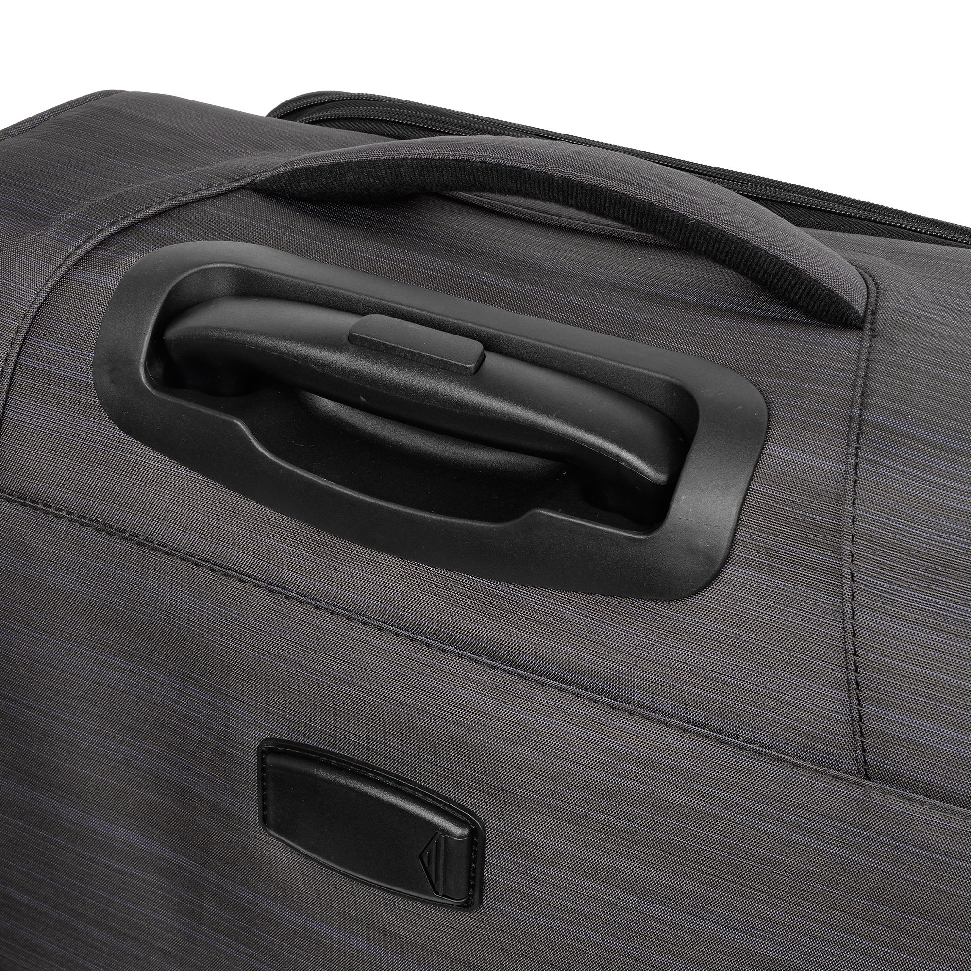 Стильный чемодан модной расцветки имеет в наличии две ручки для переноски сбоку и сверху чемодана, а также выдвижную ручку, максимальная высота которой составляет 40 см. Кодовый замок в комплект не входит.