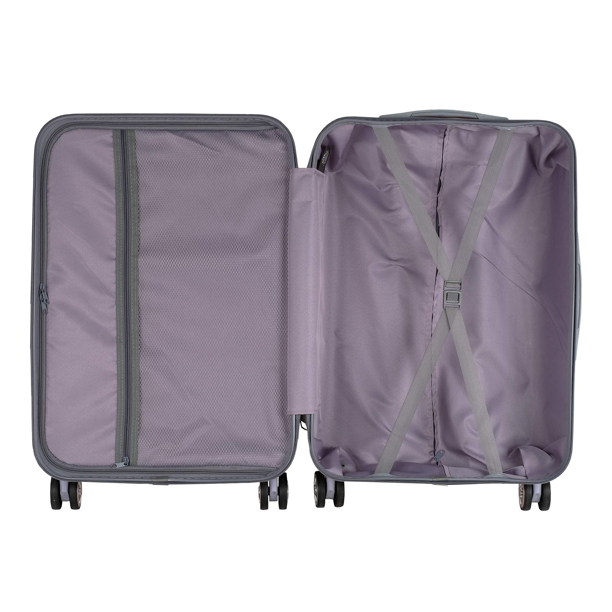 Одна секция чемодана с креплением резинками для одежды. Вторая секция застегивается на молнию для удобства упаковки вещей.