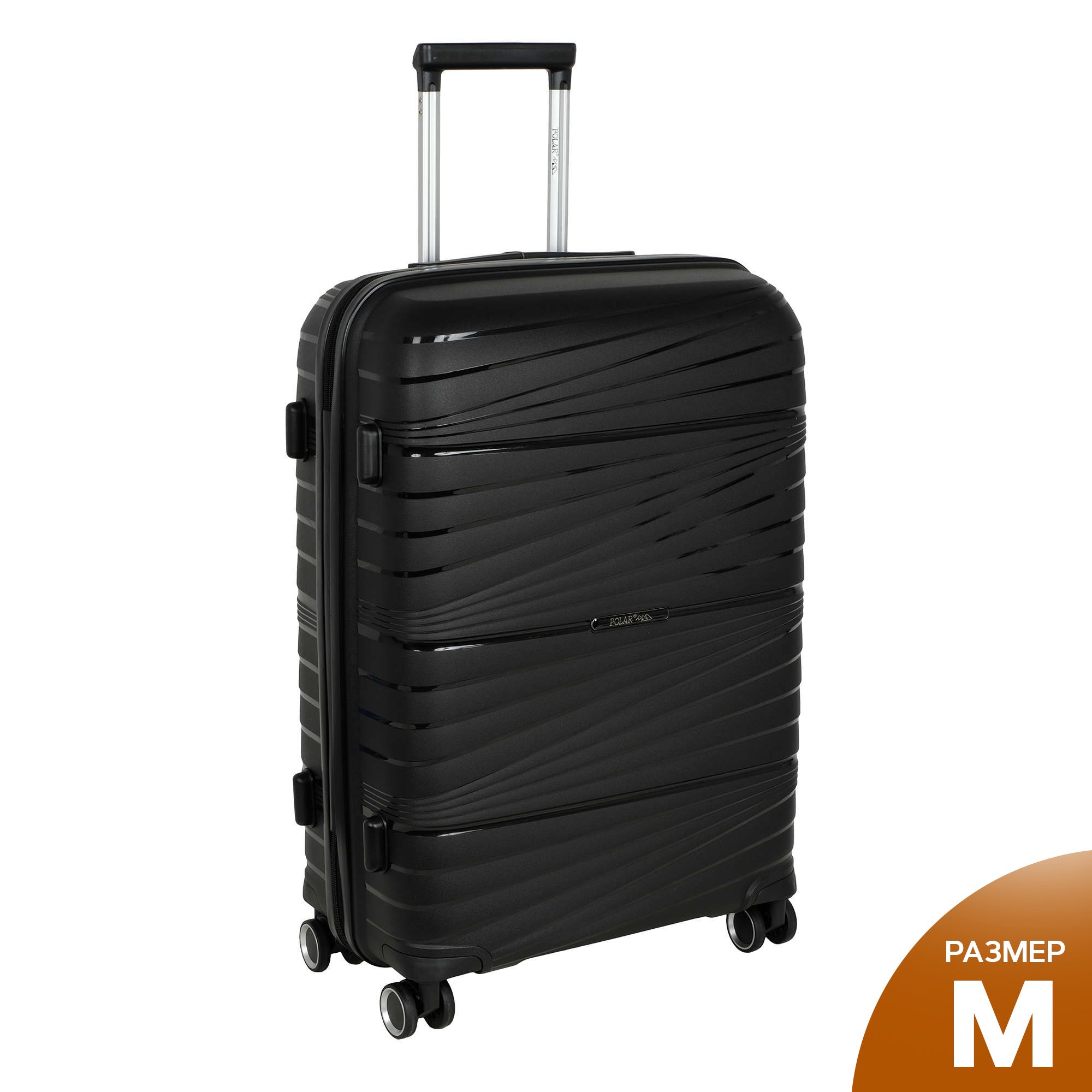 Чемодан фирмы POLAR, размер М, выполнен из PP (полипропилен). Основное отделение разделено на две части. Одно имеет фиксирующие ремни, второе на молнии. Выдвигающаяся ручка расположена внутри корпуса чемодана, что способствует большей прочности и защите от ударов при разгрузке/погрузке чемодана. Выдвигающаяся ручка фиксируется в двух положениях. Есть кодовый замок. Надежные 4 колеса.