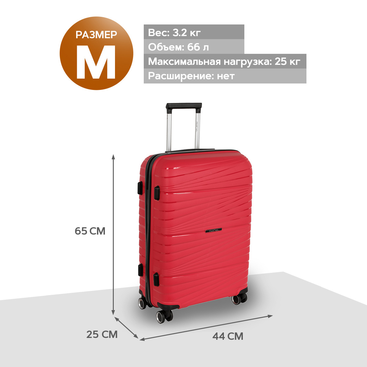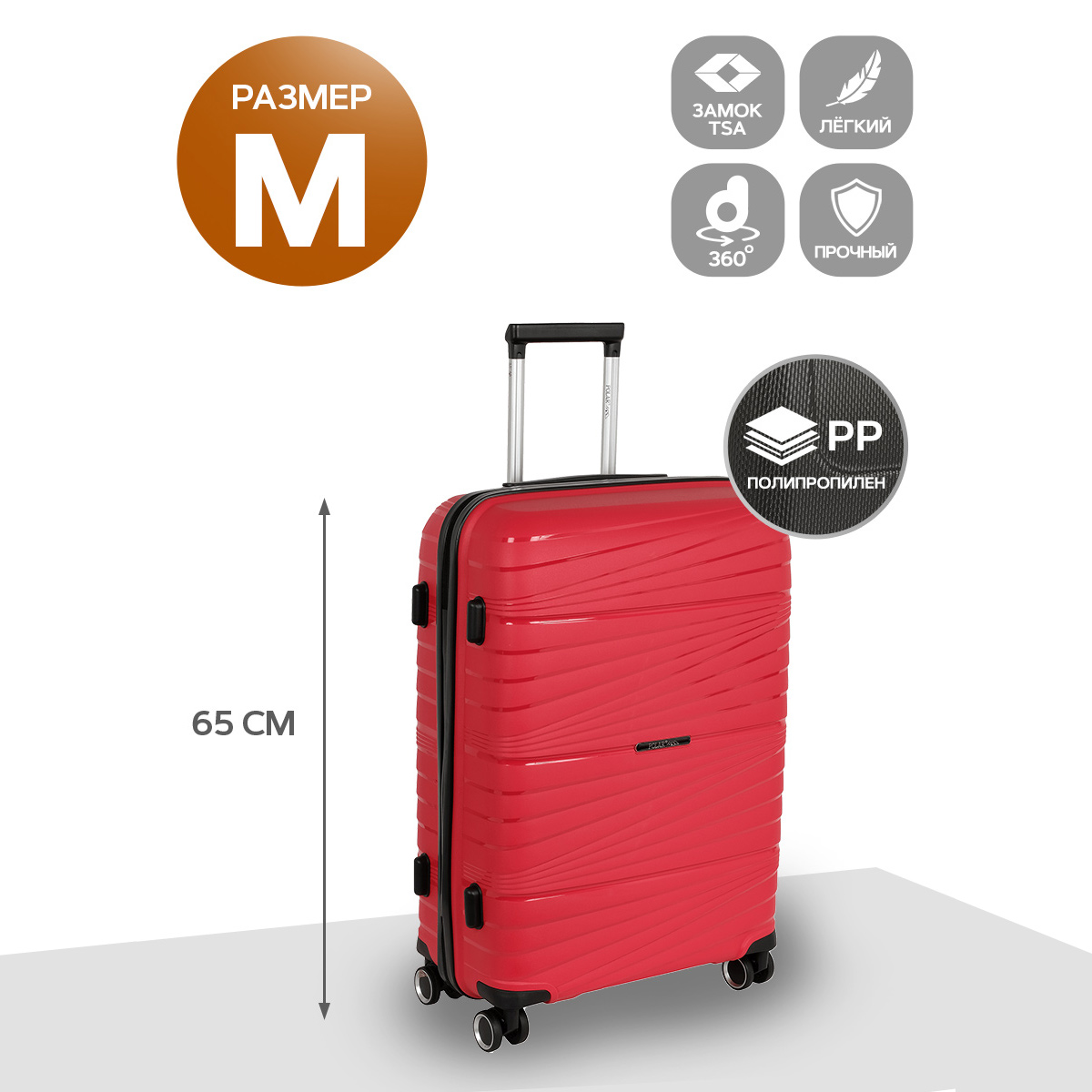 Чемодан фирмы POLAR, размер М, выполнен из PP (полипропилен). Основное отделение разделено на две части. Одно имеет фиксирующие ремни, второе на молнии. Выдвигающаяся ручка расположена внутри корпуса чемодана, что способствует большей прочности и защите от ударов при разгрузке/погрузке чемодана. Выдвигающаяся ручка фиксируется в двух положениях. Есть кодовый замок. Надежные 4 колеса.