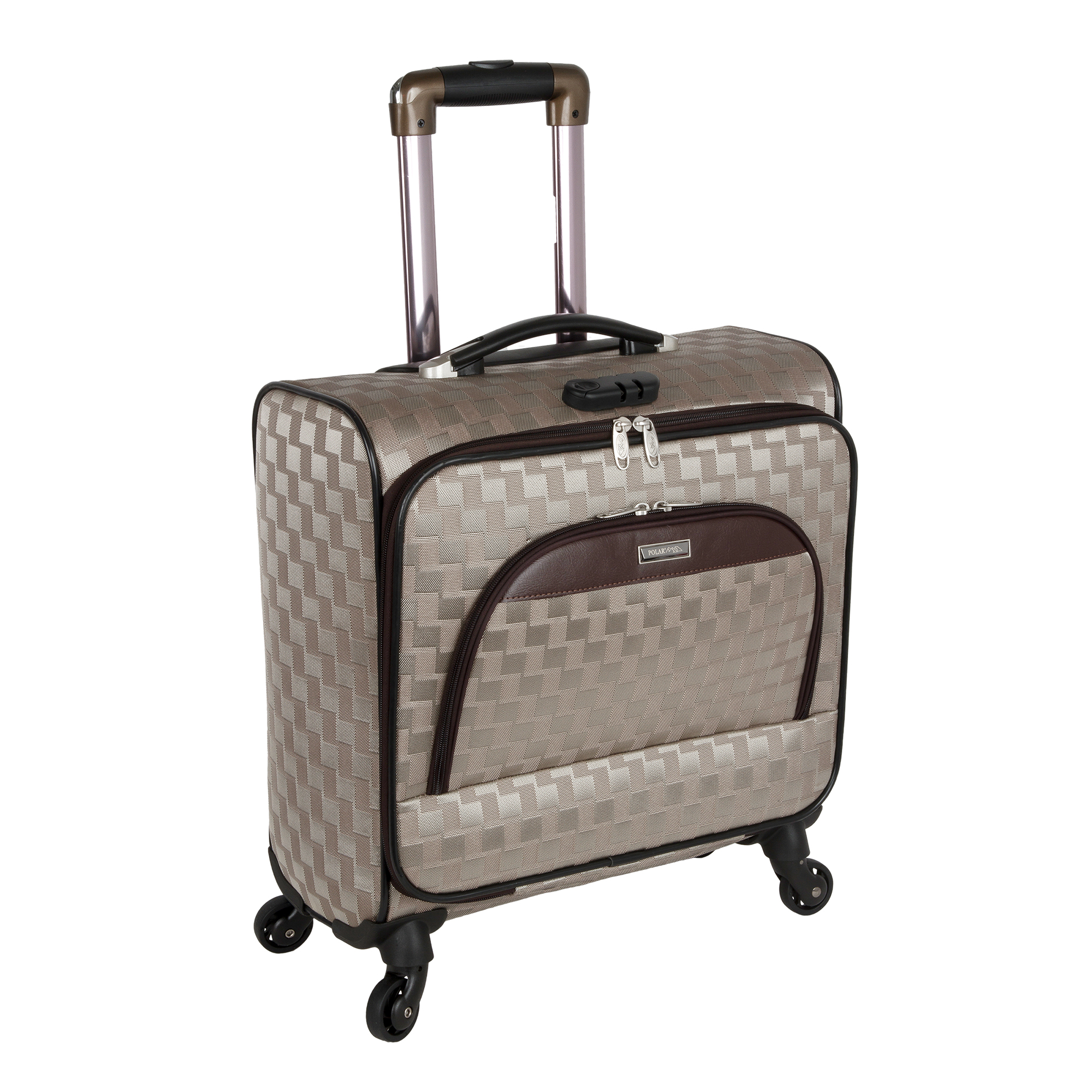 Кейс-пилот от компании "Polar" на четырёх колёсах выполнен из прочного материала (нейлона и полиэстера). Чемодан закрывается на молнию, присутствует также встроенный кодовый замок.Внутри есть одно большое отделение , в котором присутствуют ремни для фиксации вещей и маленький карман на молнии для документов. Снаружи расположен объёмный карман на молнии для мелких вещей. У чемодана есть небольшая ручка для переноски и металлическая ручка, которая выдвигается на 30см.