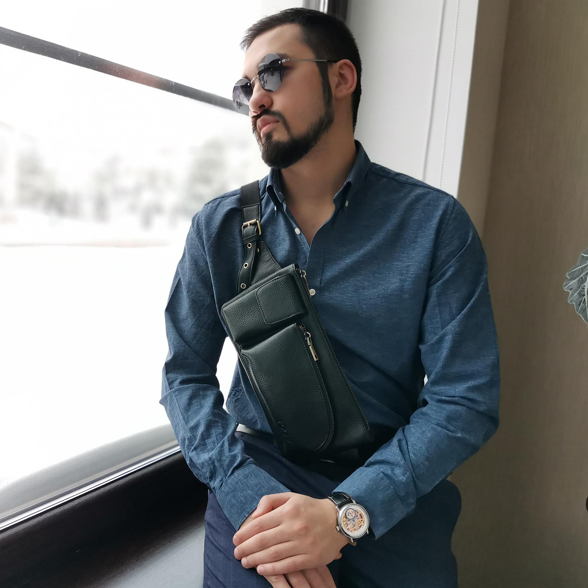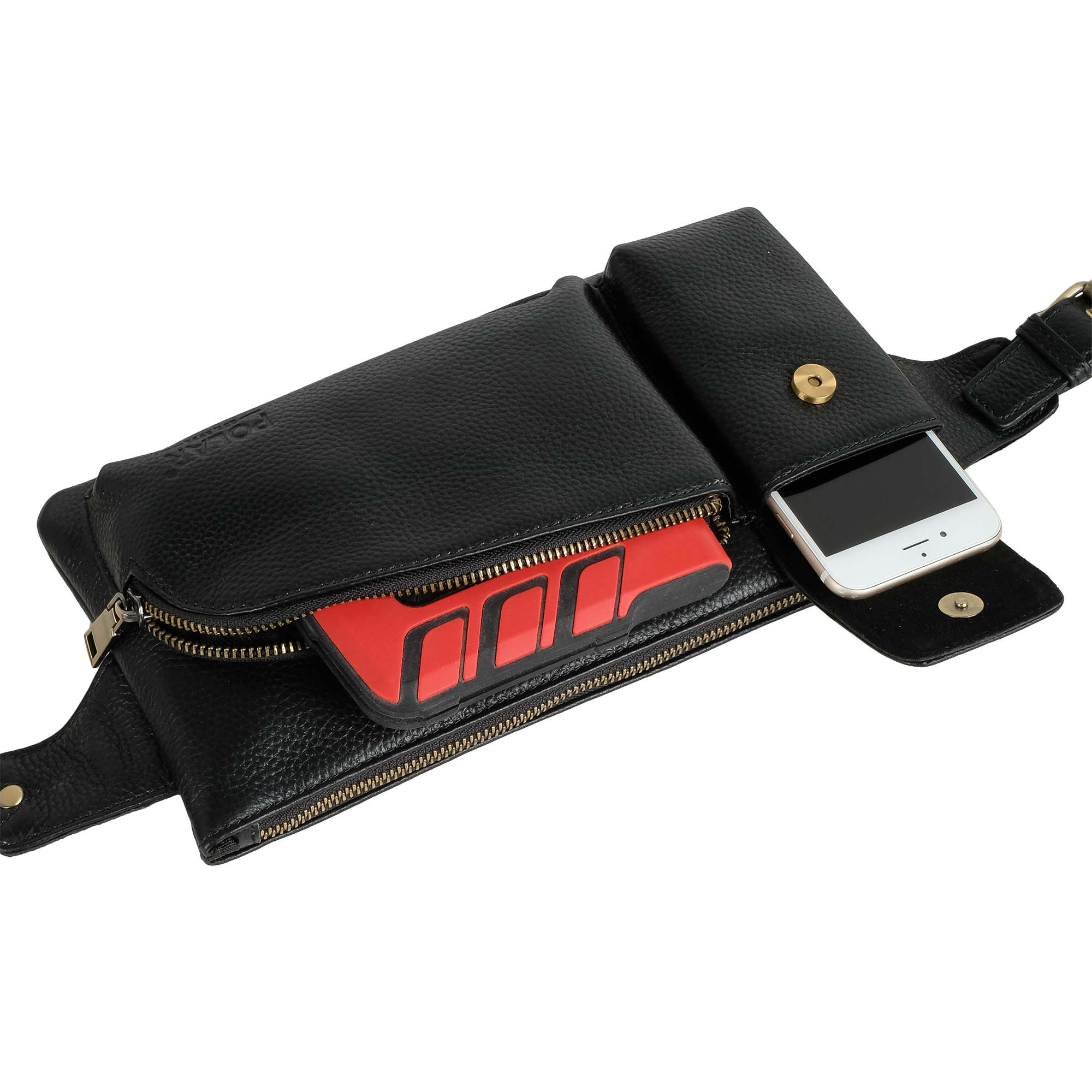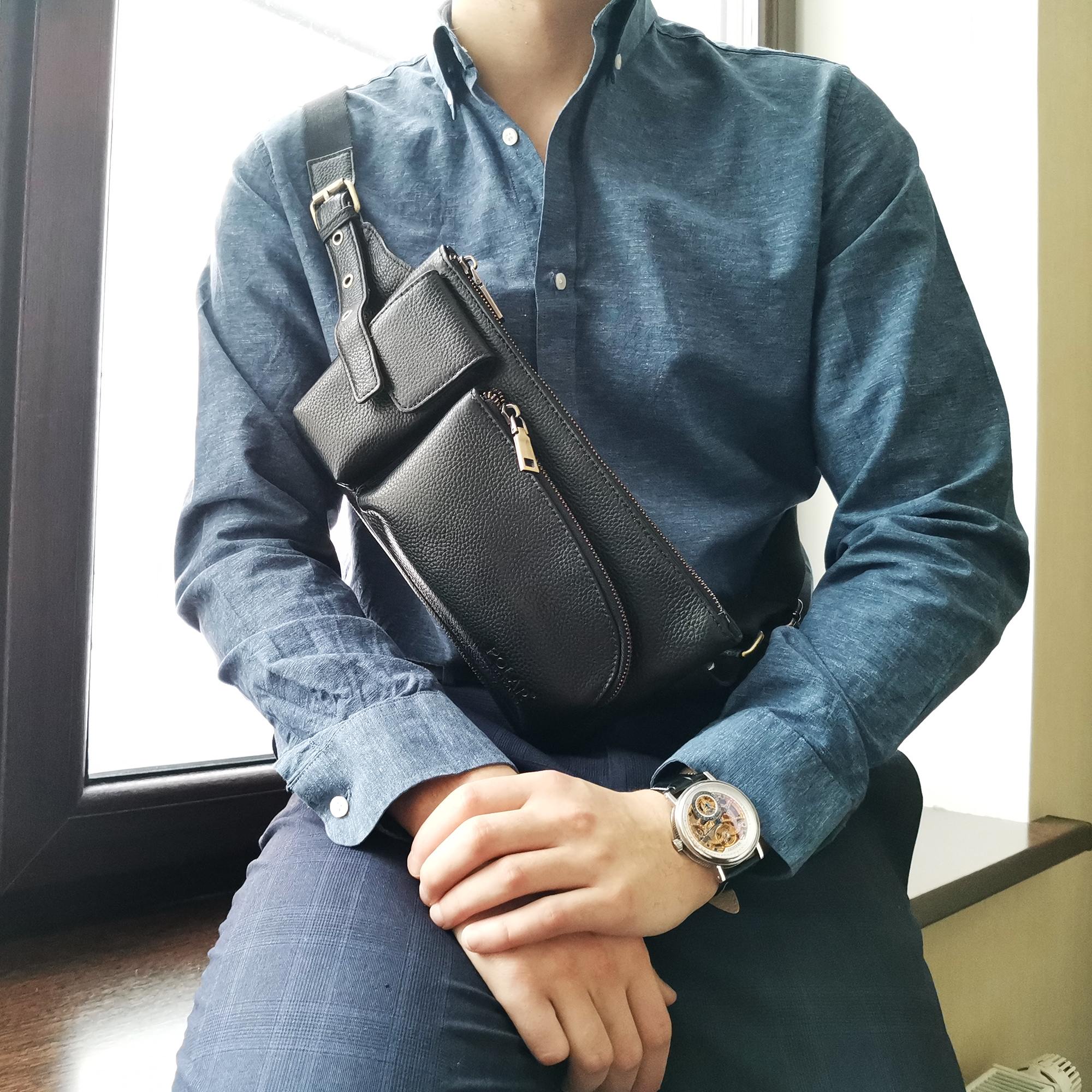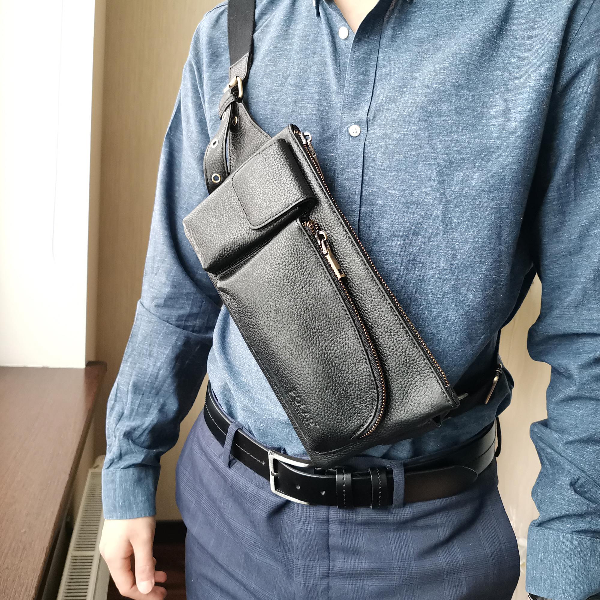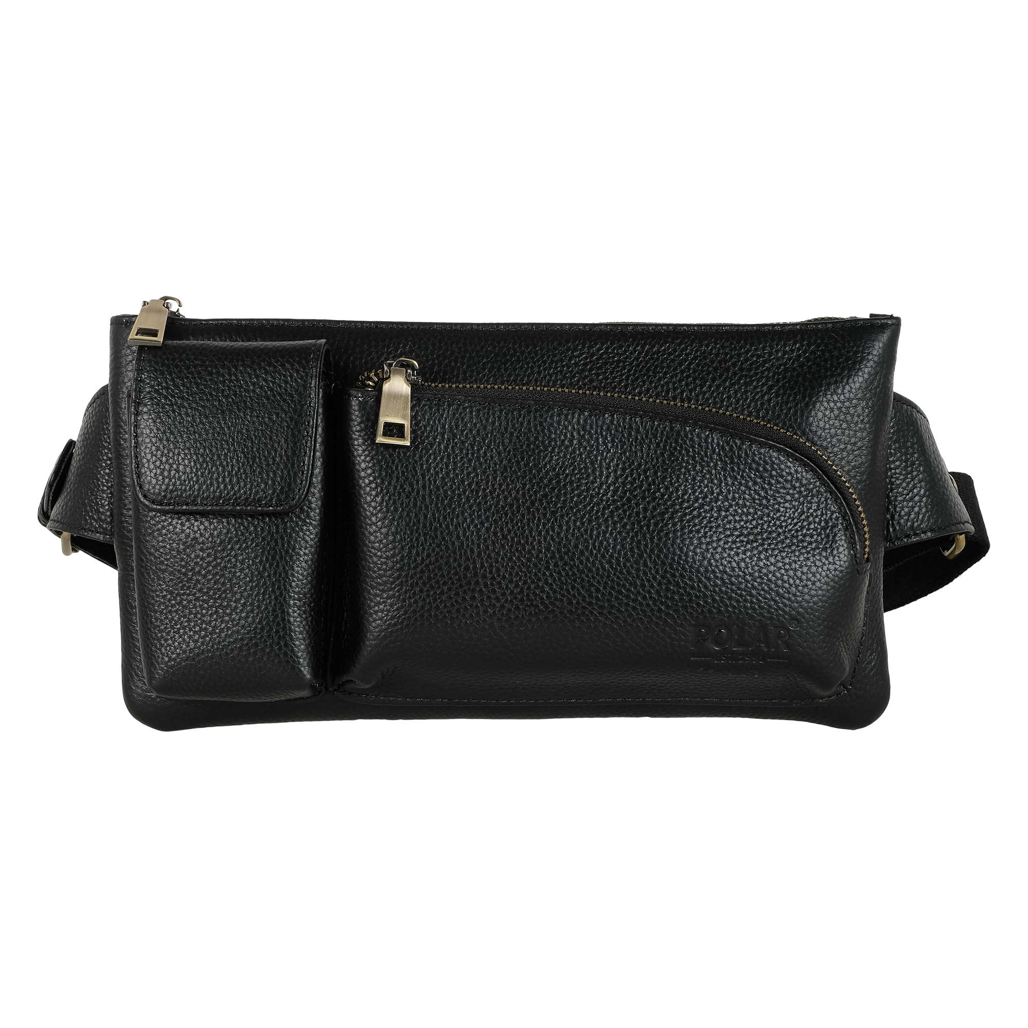 Кожаная мужская сумка Polar на пояс. Состоит из одного отделения на молнии. Внутри — один карман на молнии и два открытых кармана. Снаружи — дополнительный карман на молнии сзади сумки и два накладных кармана спереди сумки. Пояс регулируется, максимальный объем 140 см .