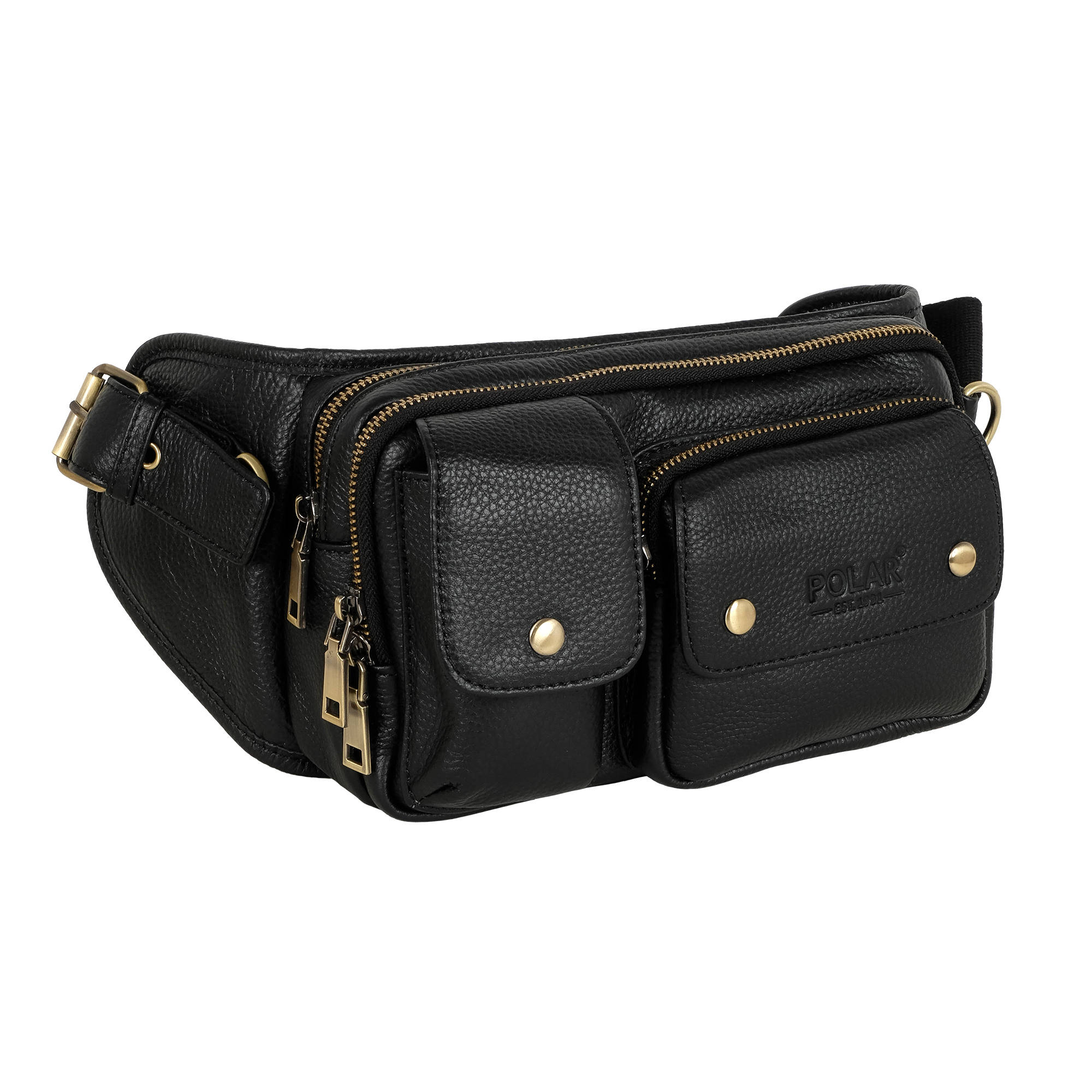 Кожаная мужская сумка Polar на пояс. Состоит из двух отделений на молнии. Внутри — один карман на молнии и два открытых кармана. Снаружи — дополнительный карман на молнии сзади сумки и два кармана спереди сумки. Пояс регулируется, максимальный объем 140 см.