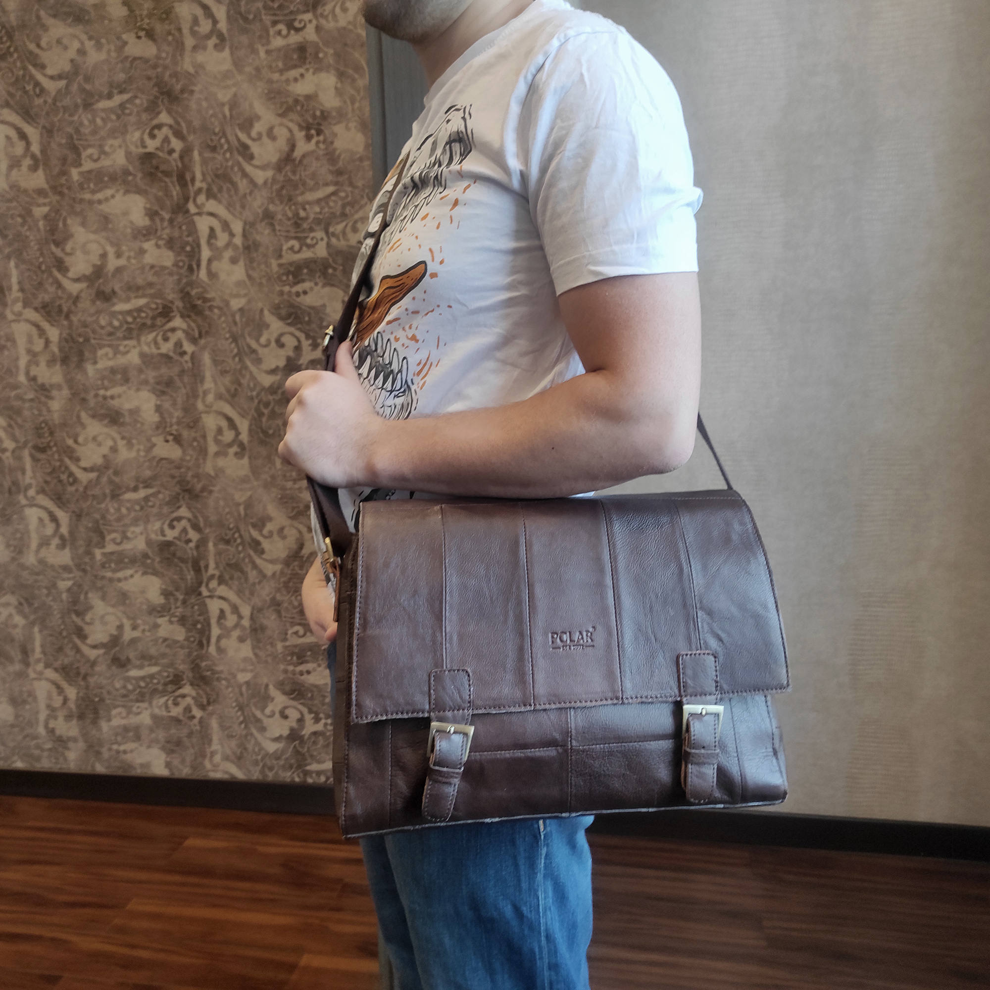 Кожаный планшет для документов фирмы Polar вмещает формат А4. Отлично подойдет для повседневного использования. Основное отделение закрывается магнитными кнопками и на молнию. На передней стенке портфеля одно дополнительное отделение на магнитной кнопке. Внутри два отделения, разделенные между собой карманом- перегородкой и потайной карман на молнии. Плечевой ремень максимальная длина 136см.