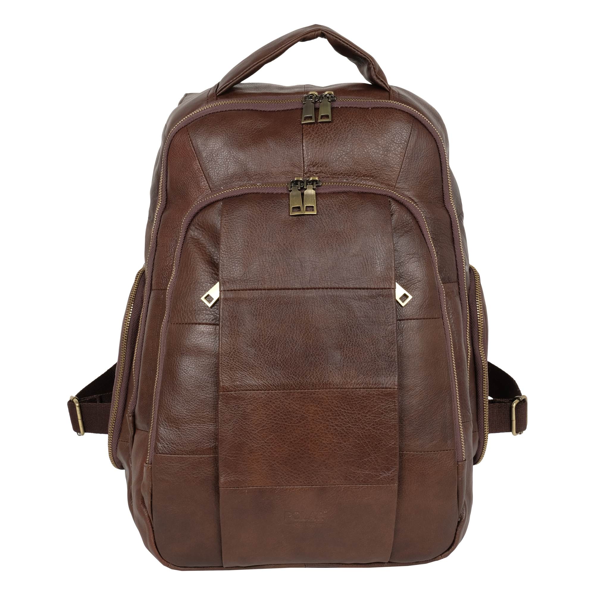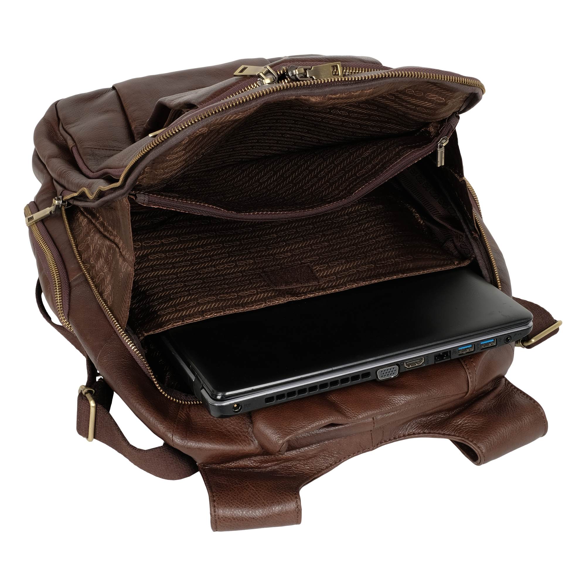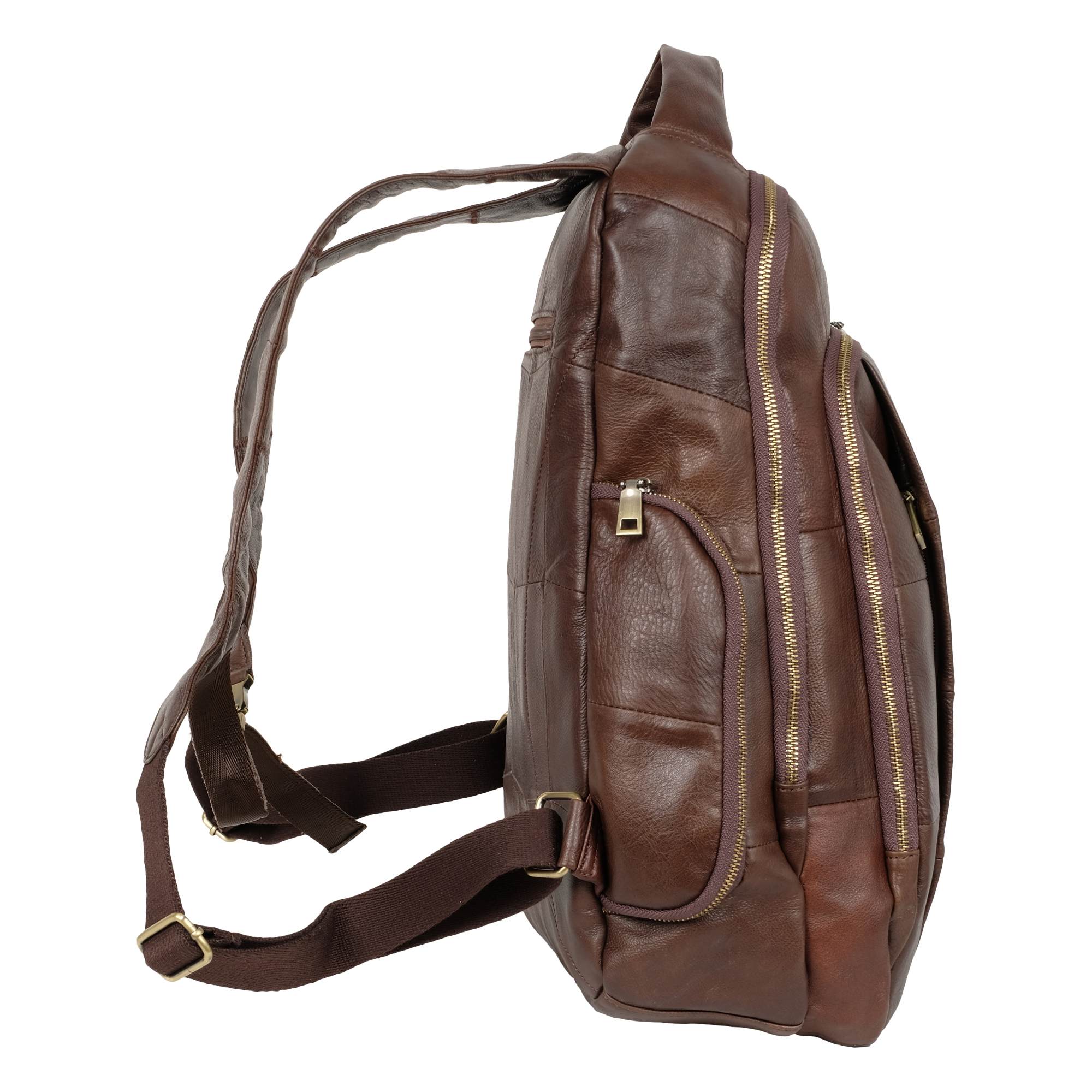 Стильный городской рюкзак с отделением для ноутбука 14 дюймов выполнен из натуральной кожи. Модель состоит из двух отделений на молнии. Внутри – карман на молнии, открытый карман и органайзер. Снаружи на задней стенке есть один карман на молнии. Два кармана спереди сумки на молнии. По бокам рюкзака расположены карманы на молнии. Лямки, шириной - 60 мм регулируются по длине