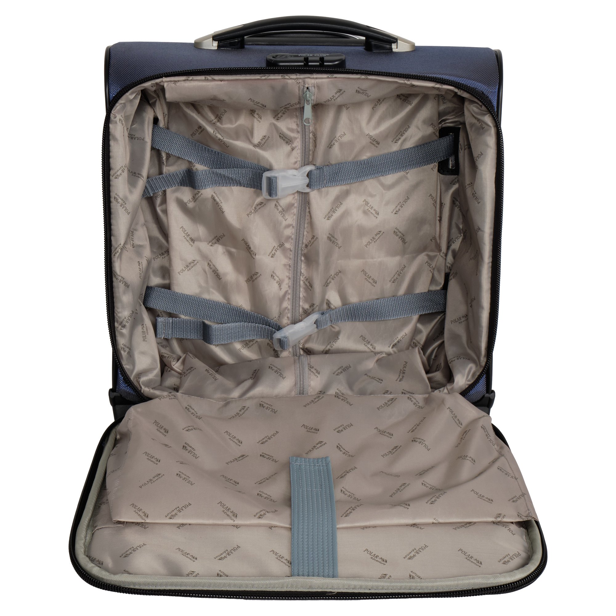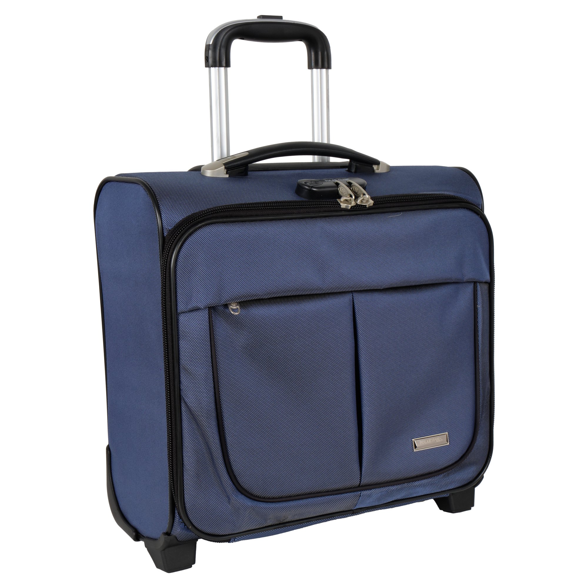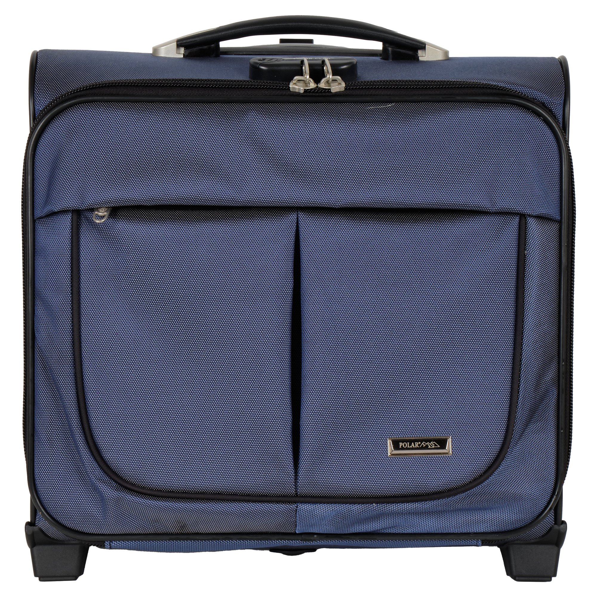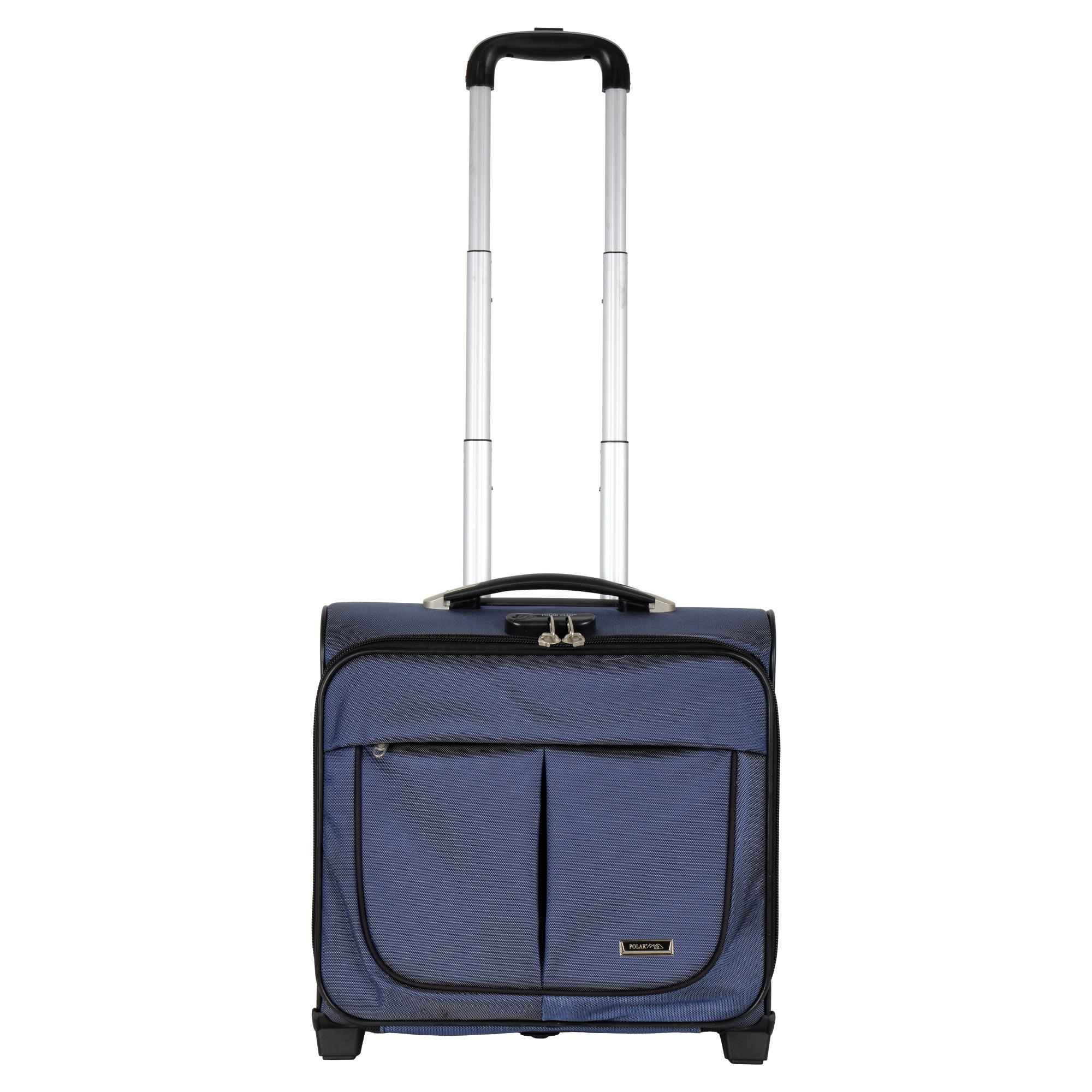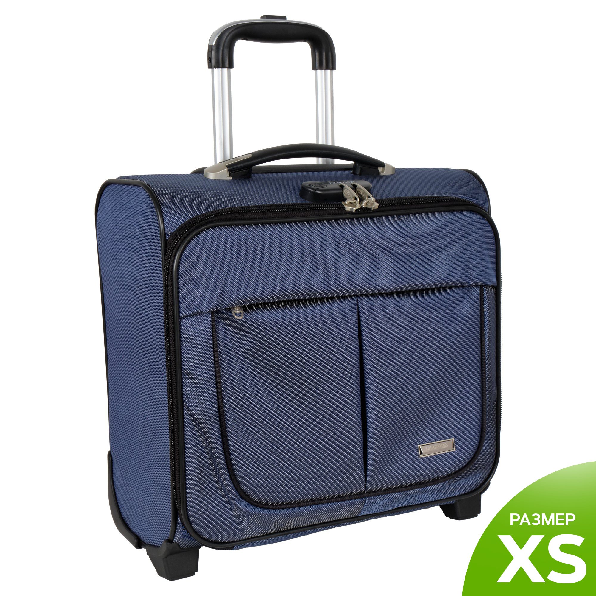 Чемодан от компании "Polar" на двух колёсах выполнен из прочного материала (нейлона и полиэстера). Подходит как ручная кладь. Чемодан закрывается на молнию, присутствует  также встроенный кодовый замок.Внутри есть одно большое отделение , в котором присутствуют ремни для фиксации вещей, отделение для ноутбука и маленький карман на молнии для документов. Снаружи расположен объёмный карман на молнии для мелких вещей. У чемодана есть небольшая ручка для переноски и металлическая ручка, которая выдвигается на 67 см..