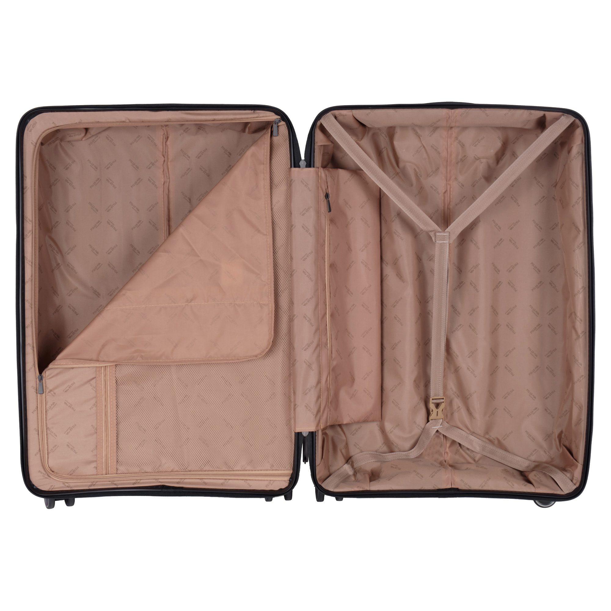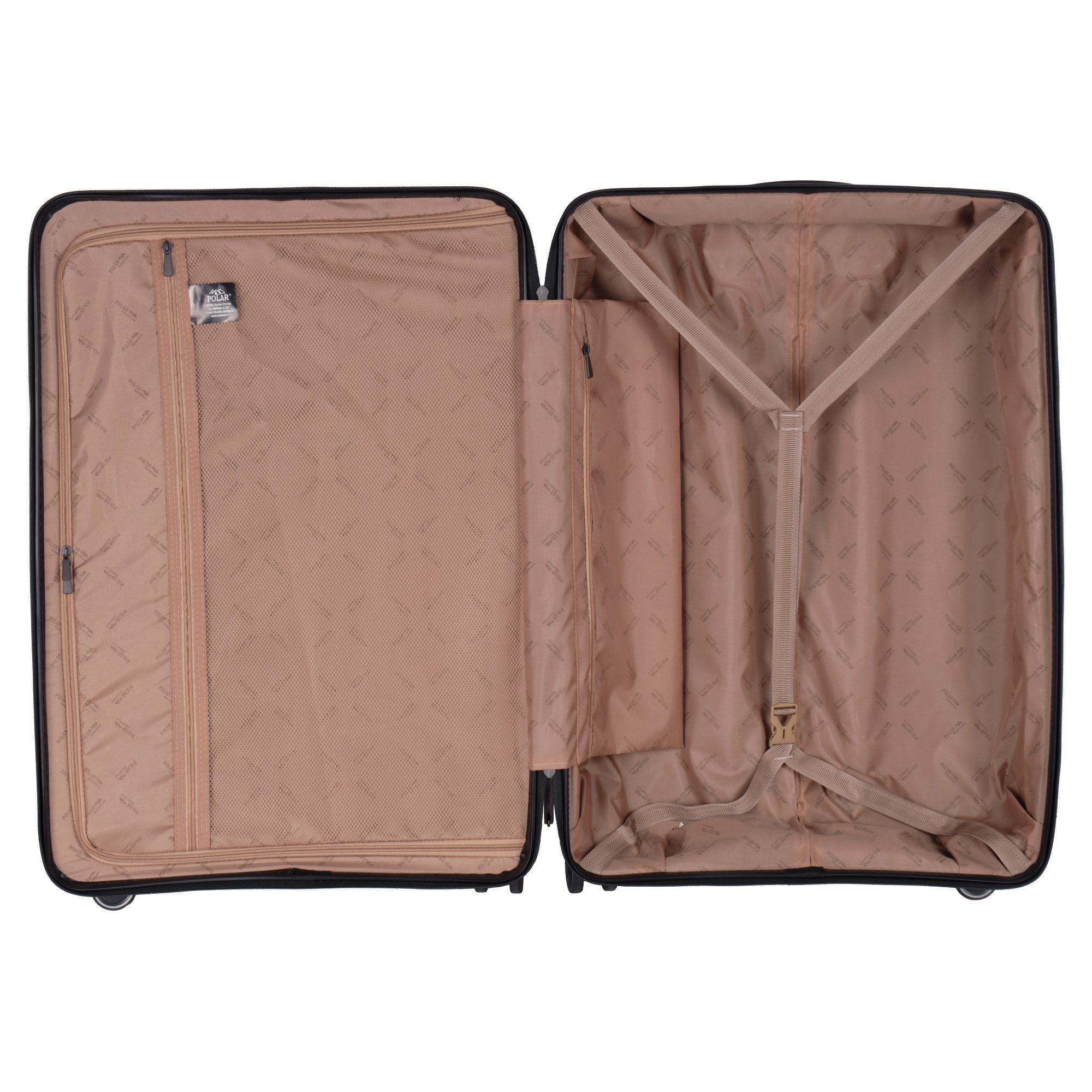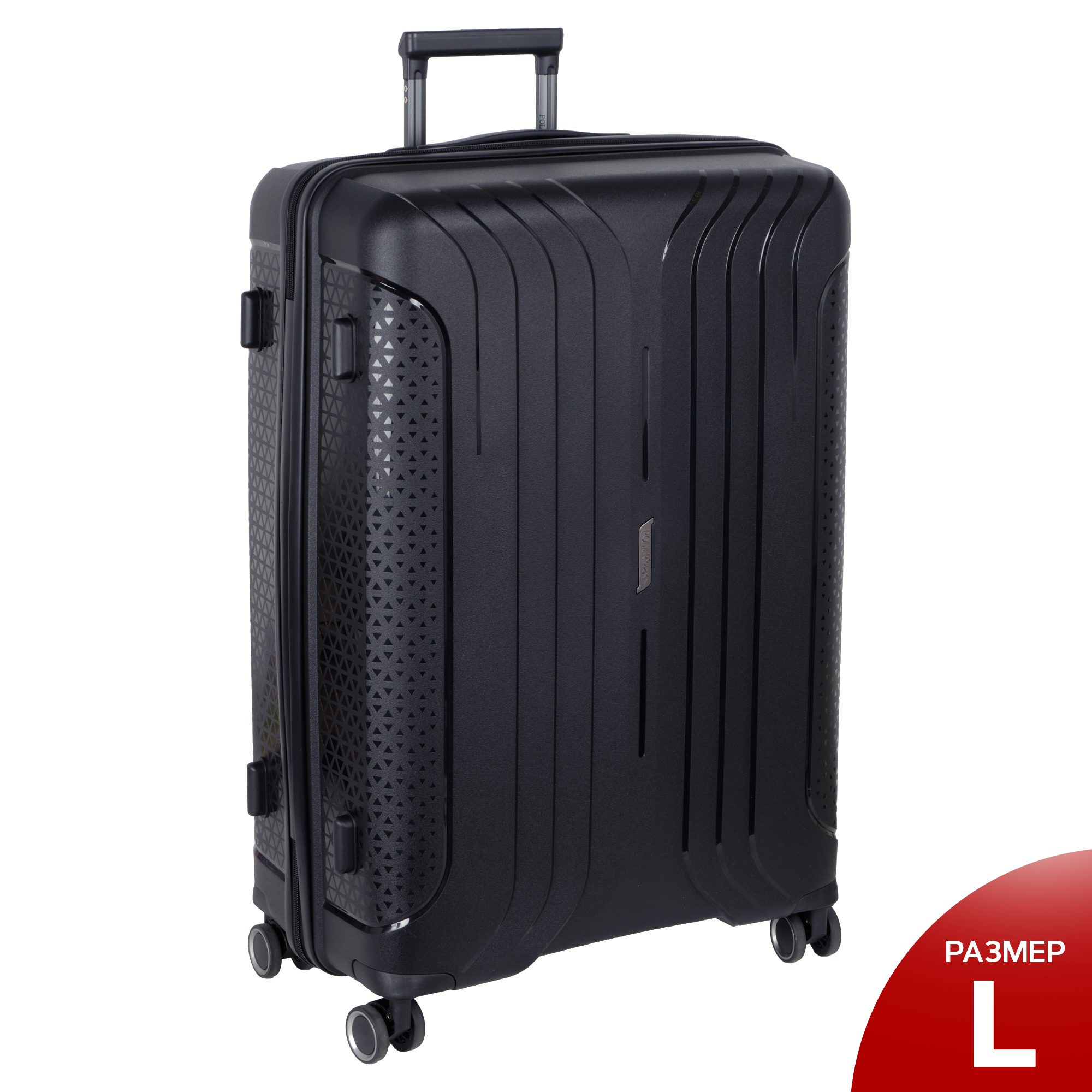 Чемодан фирмы Polar на четырех прорезиненных колесиках. Чемодан выполнен из PP-пластика (Полипропилен). Полипропилен обладает высокой прочностью, эластичностью и высокой ударостойкостью. Внутри подкладка из полиэстра. Одна секция чемодана с креплением резинками для одежды. Вторая секция застегивается на молнию для удобства упаковки вещей. Есть кодовый замок TSA.