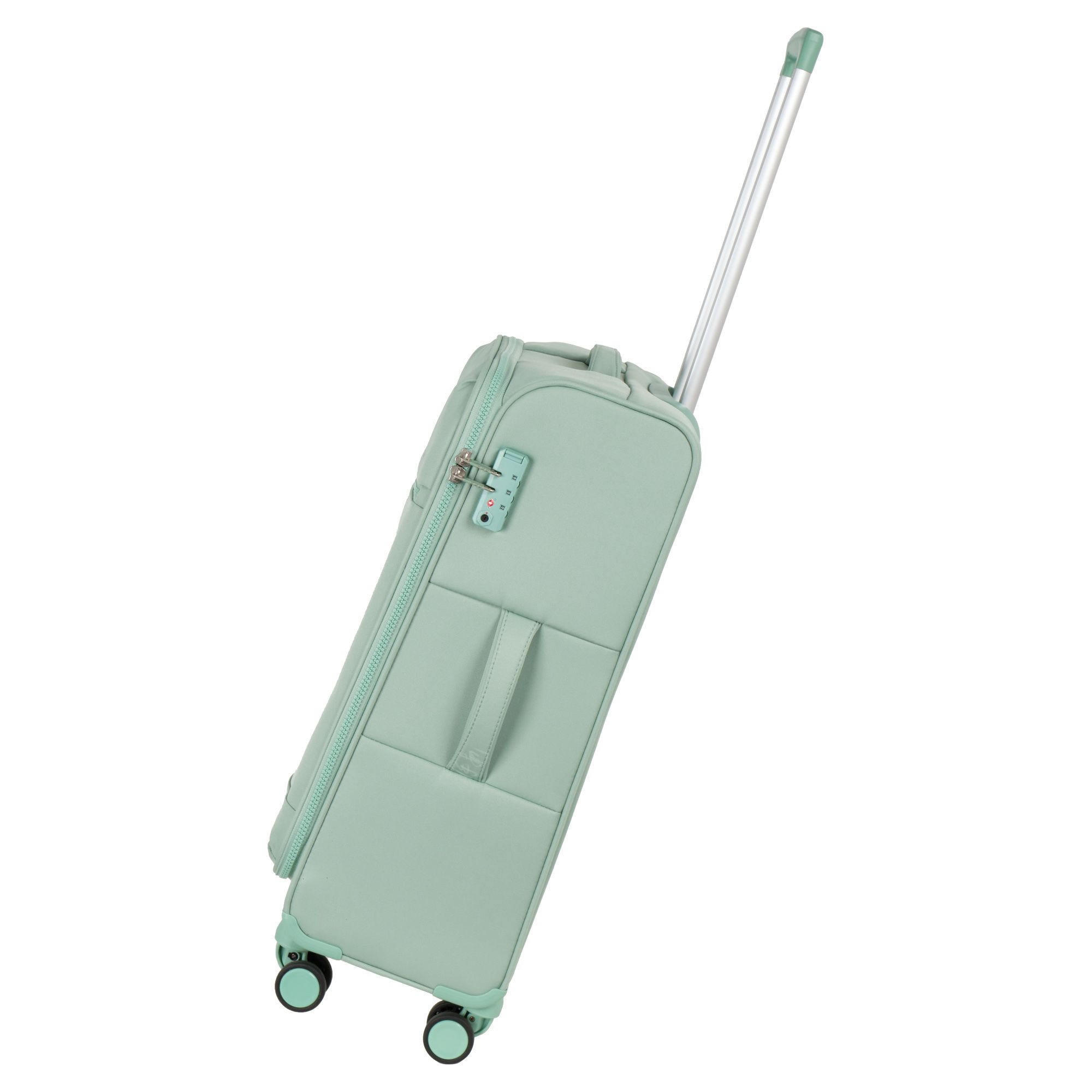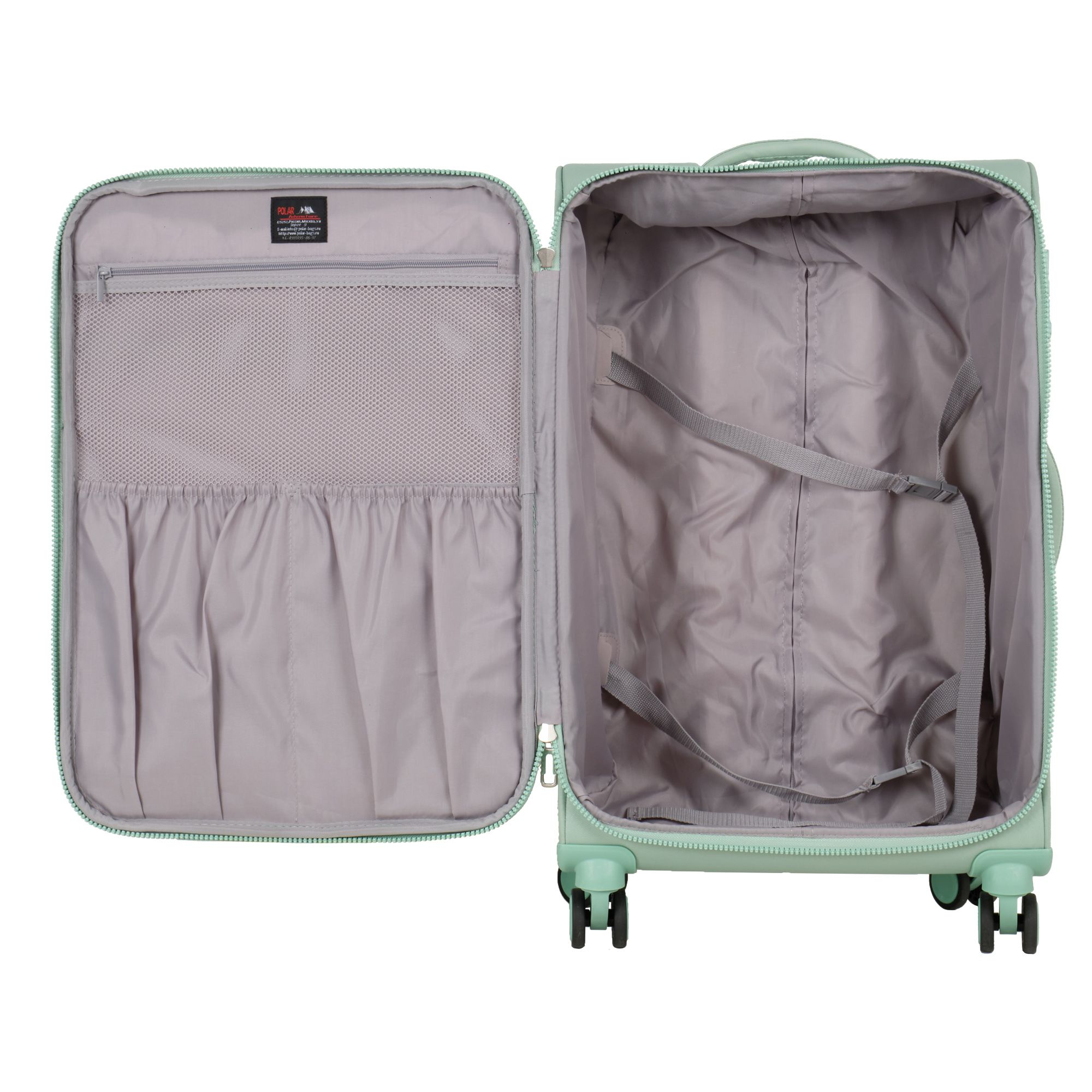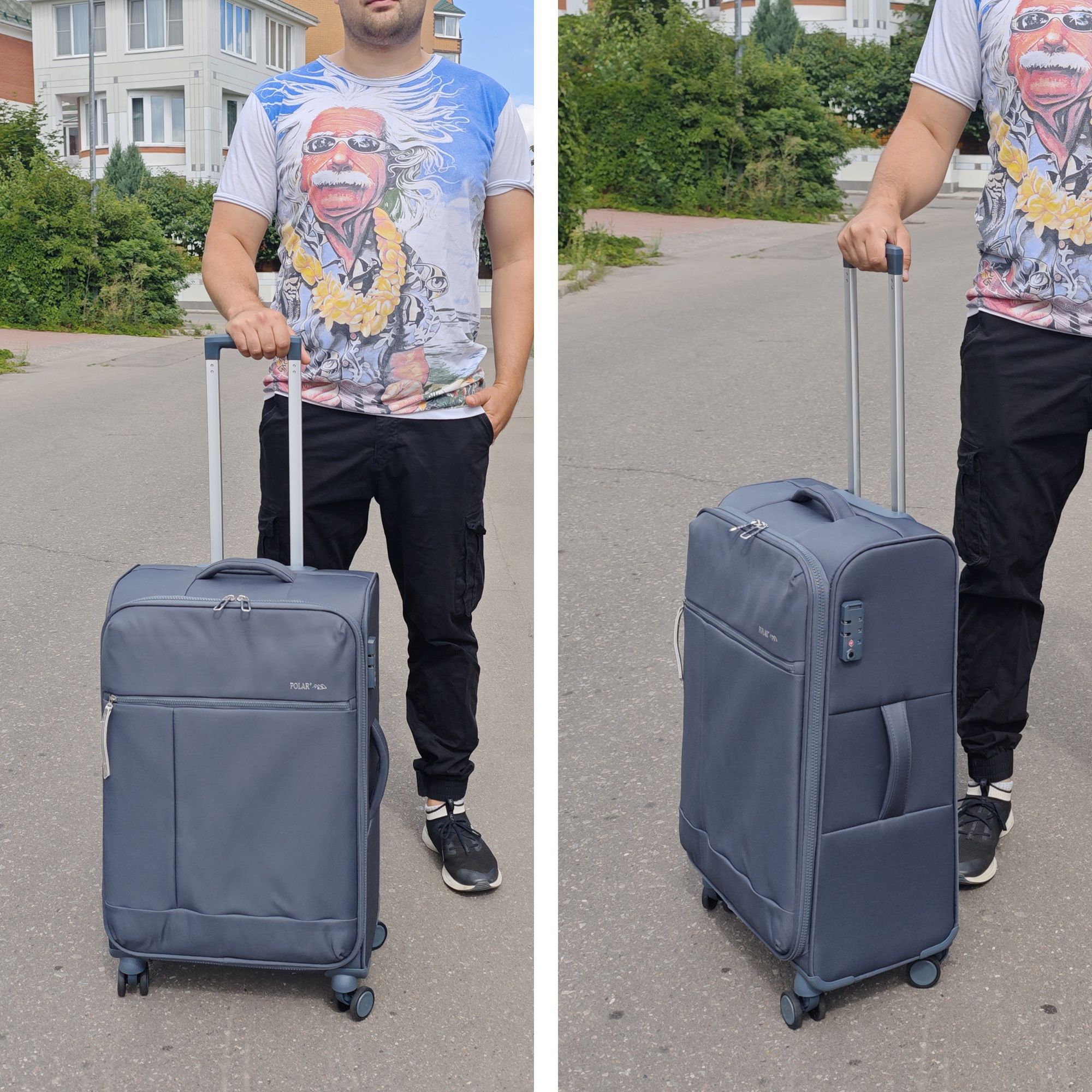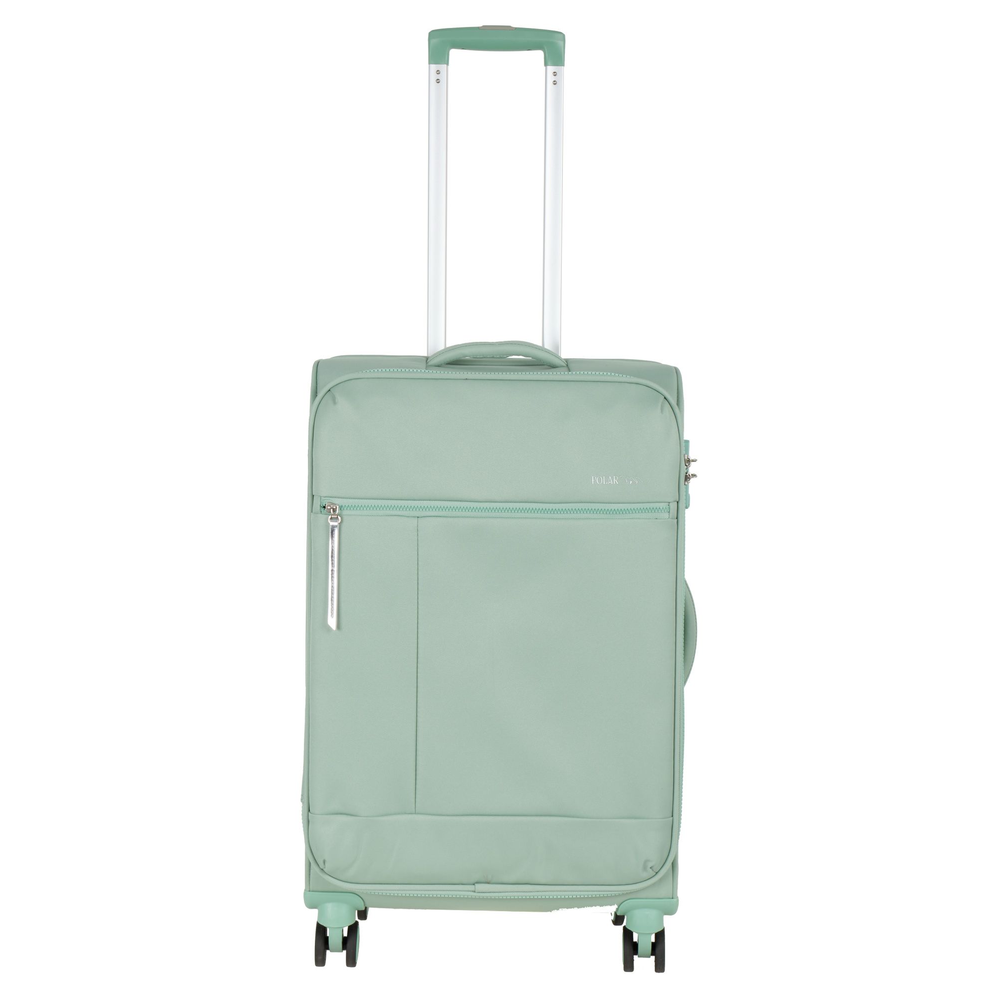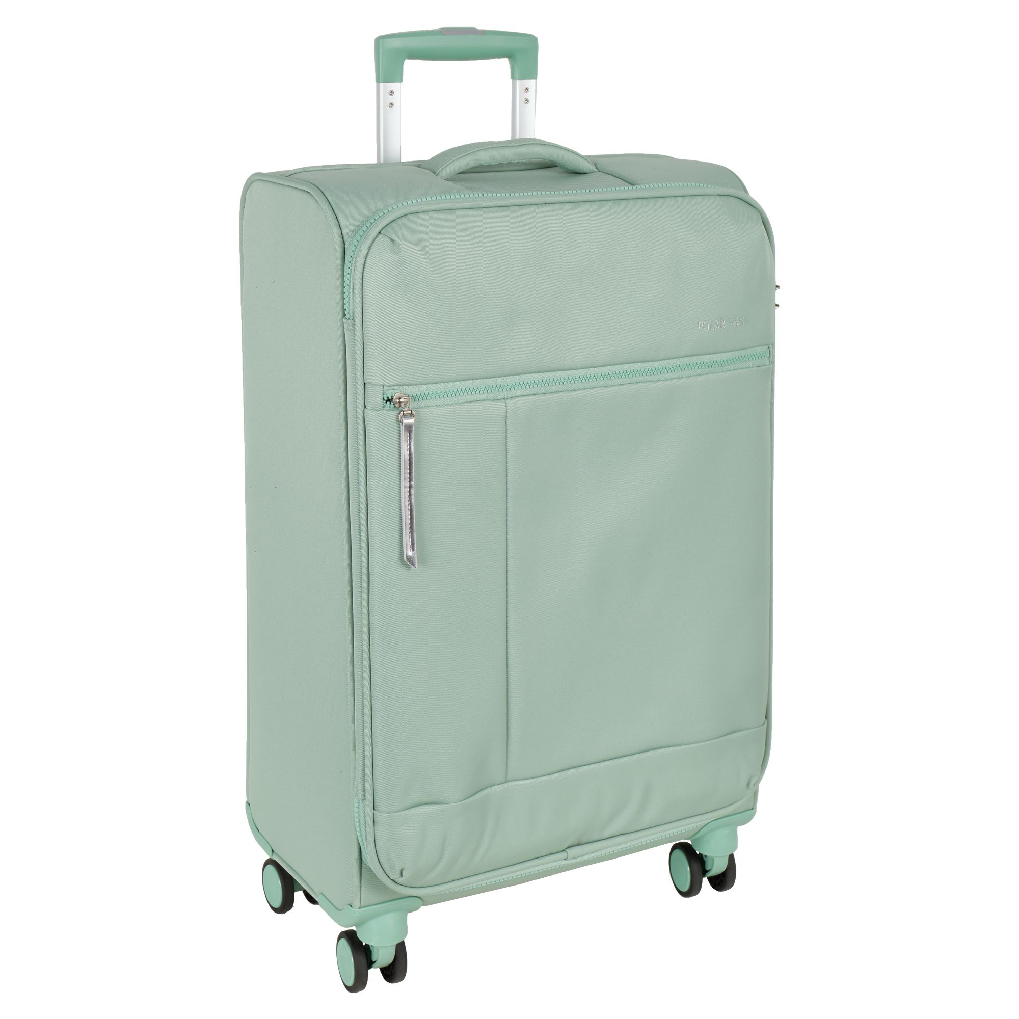 Новый облегченный чемодан фирмы Polar с отделкой колес, тележки , молнии в цвете. Чемодан закрывается по периметру на двухстороннюю широкую молнию. Сверху удобная ручка, есть боковая ручка. Бесшумные и прочные двойные вращающиеся колеса  360 градусов для легкого перемещения и хорошей балансировки. Встроенный кодовый замок TSA, снаружи на передней стенке вместительный карман на молнии. Выдвижная ручка, максимальная высота которой составляет 105 см.