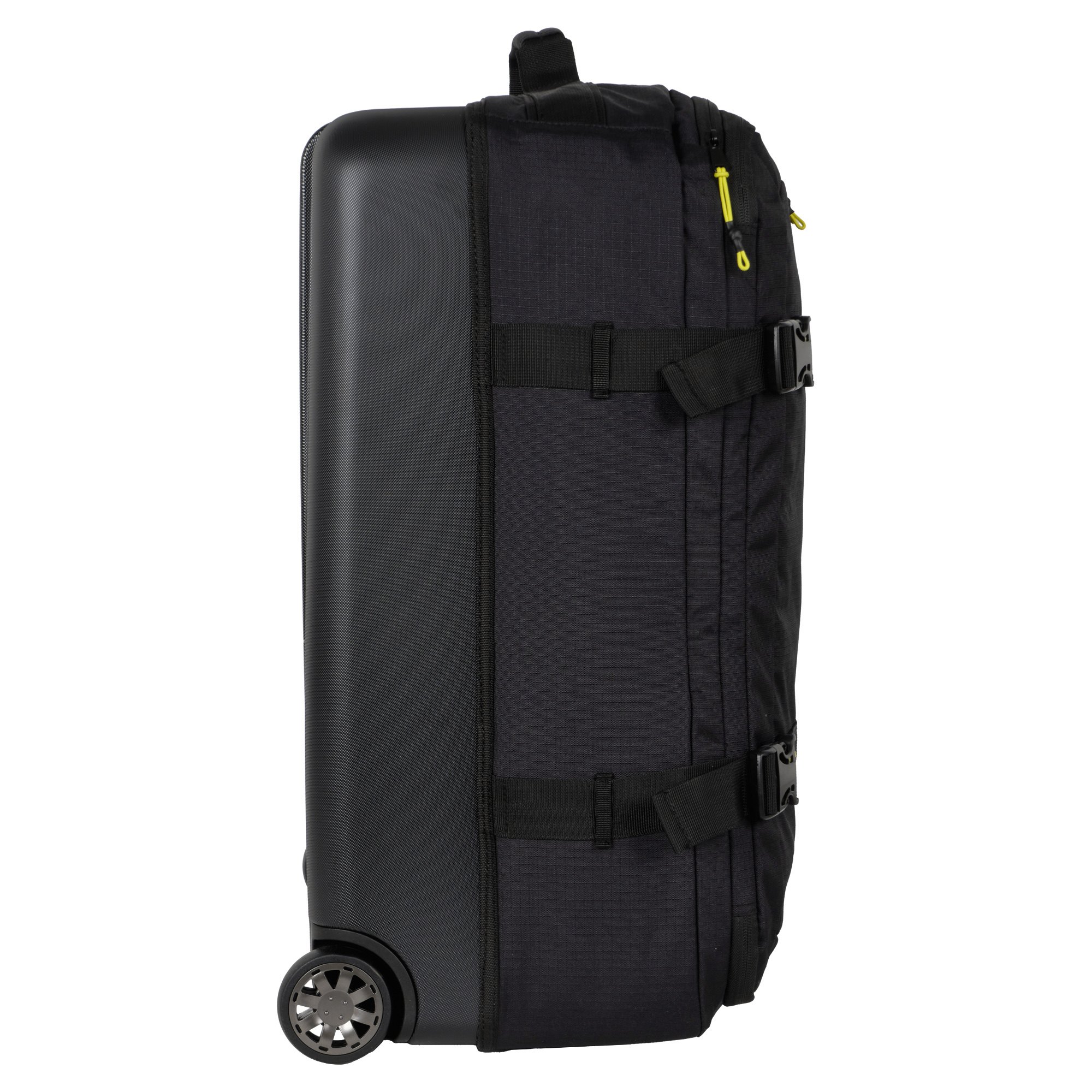 Внутри-основное отделение с прижимными ремнями, карман на молнии и сетчатый карман. На передней стенке два кармана на молнии. Чемодан закрывается на надежную молнию и карабины. Стильный чемодан модной расцветки имеет в наличии две ручки для переноски сбоку и сверху чемодана, а также выдвижную ручку- тележку.