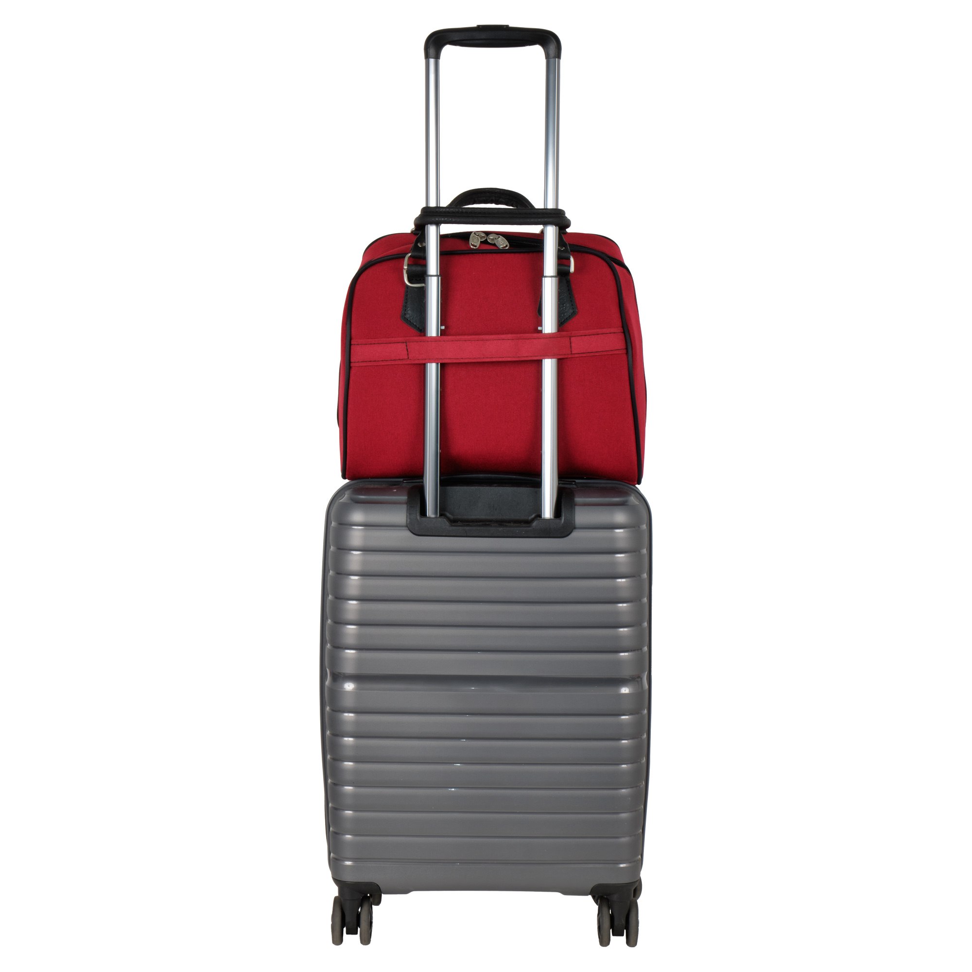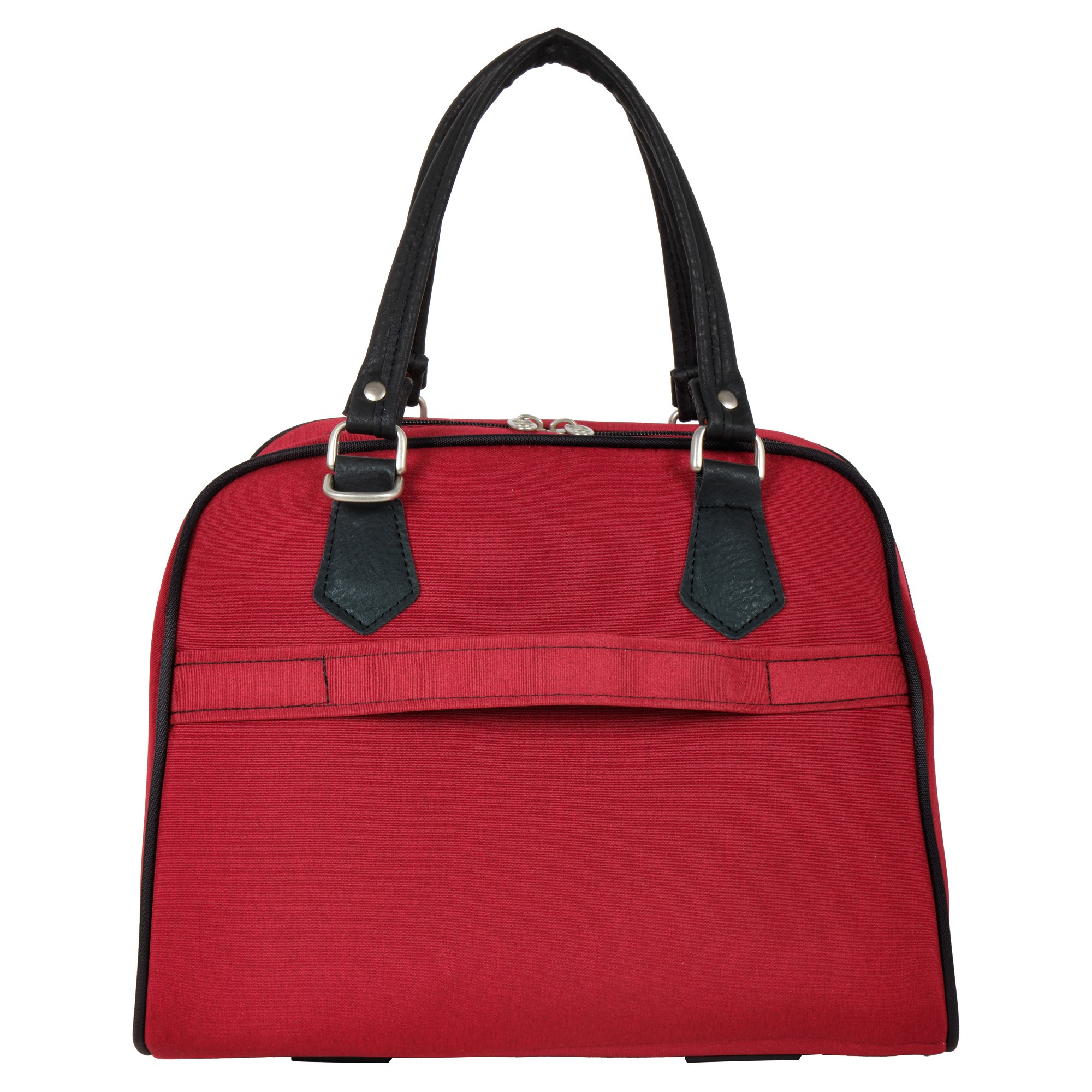 На задней стенке сумки предусмотрено крепление на ручку чемодана, но если вы застегнете молнию, то получите дополнительный карман.
