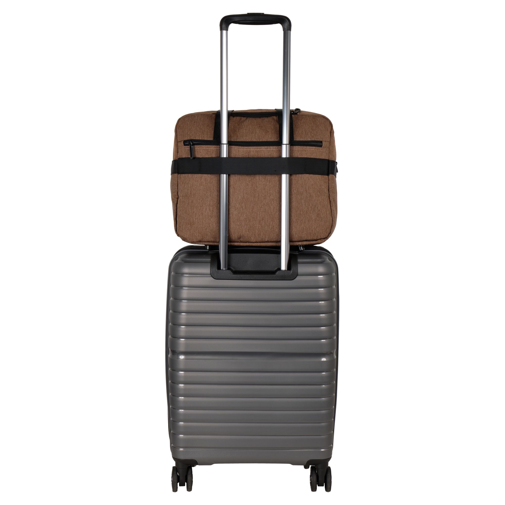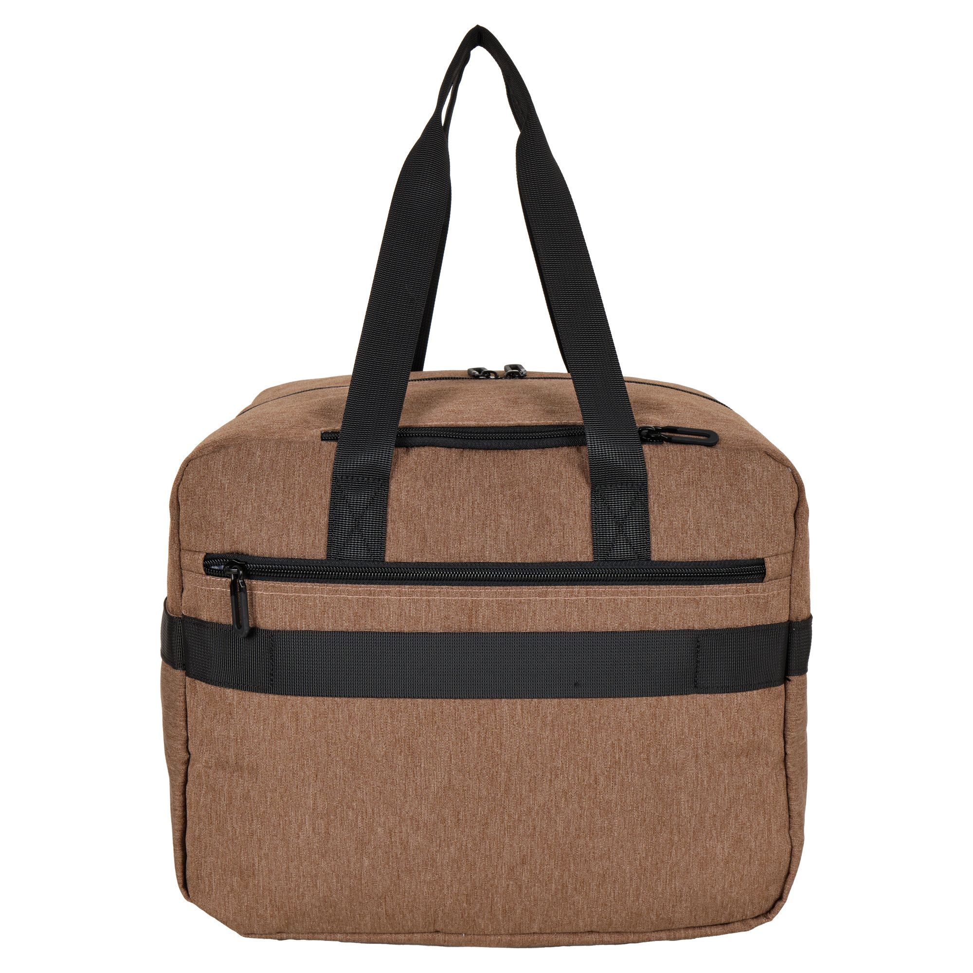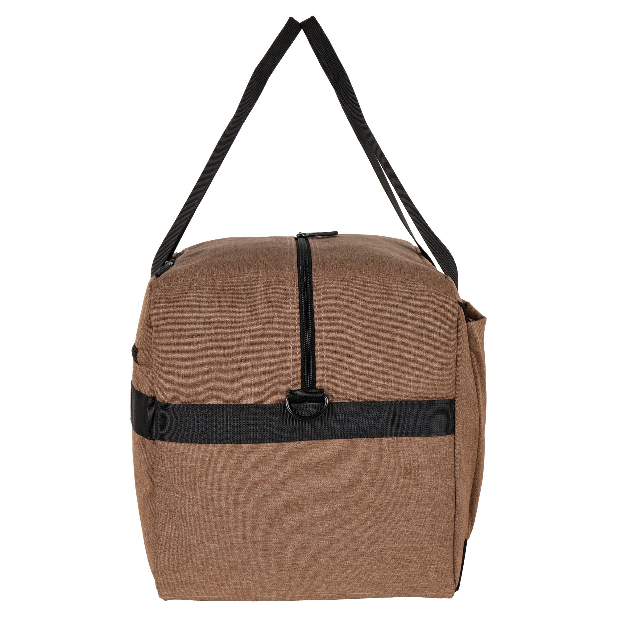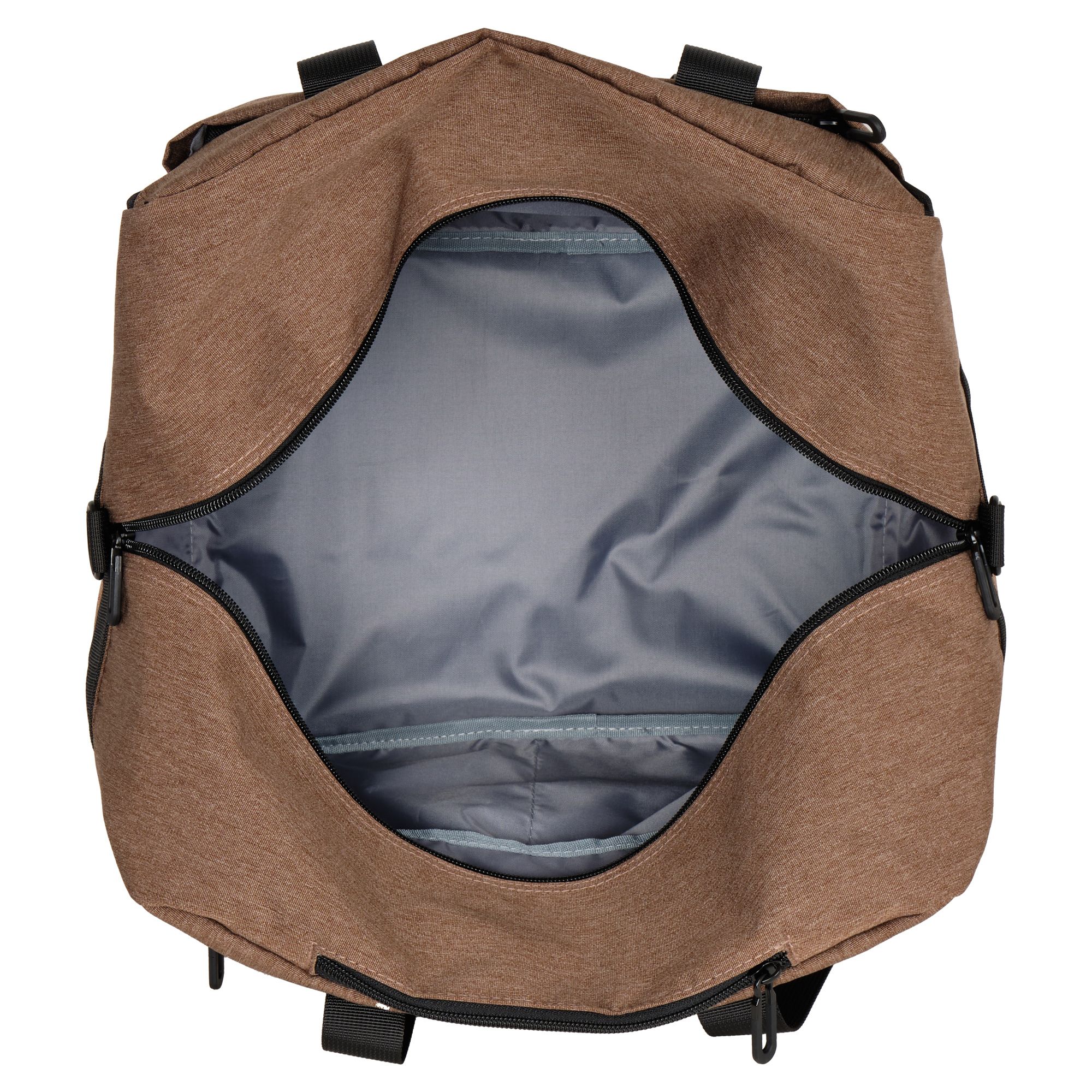 Модель имеет одно основное отделение свободного назначения, внутри карман органайзер, которое закрывается на молнию. Спереди и сзади  большие карманы на молнии. У сумки есть две ручки для переноски в руке высотой 27 см и длинный отстегивающийся ремень  123 см, который регулируется по длине. Есть ремень для крепления на чемодан. На дне сумки пластиковые ножки, чтобы дно оставалось чистым.