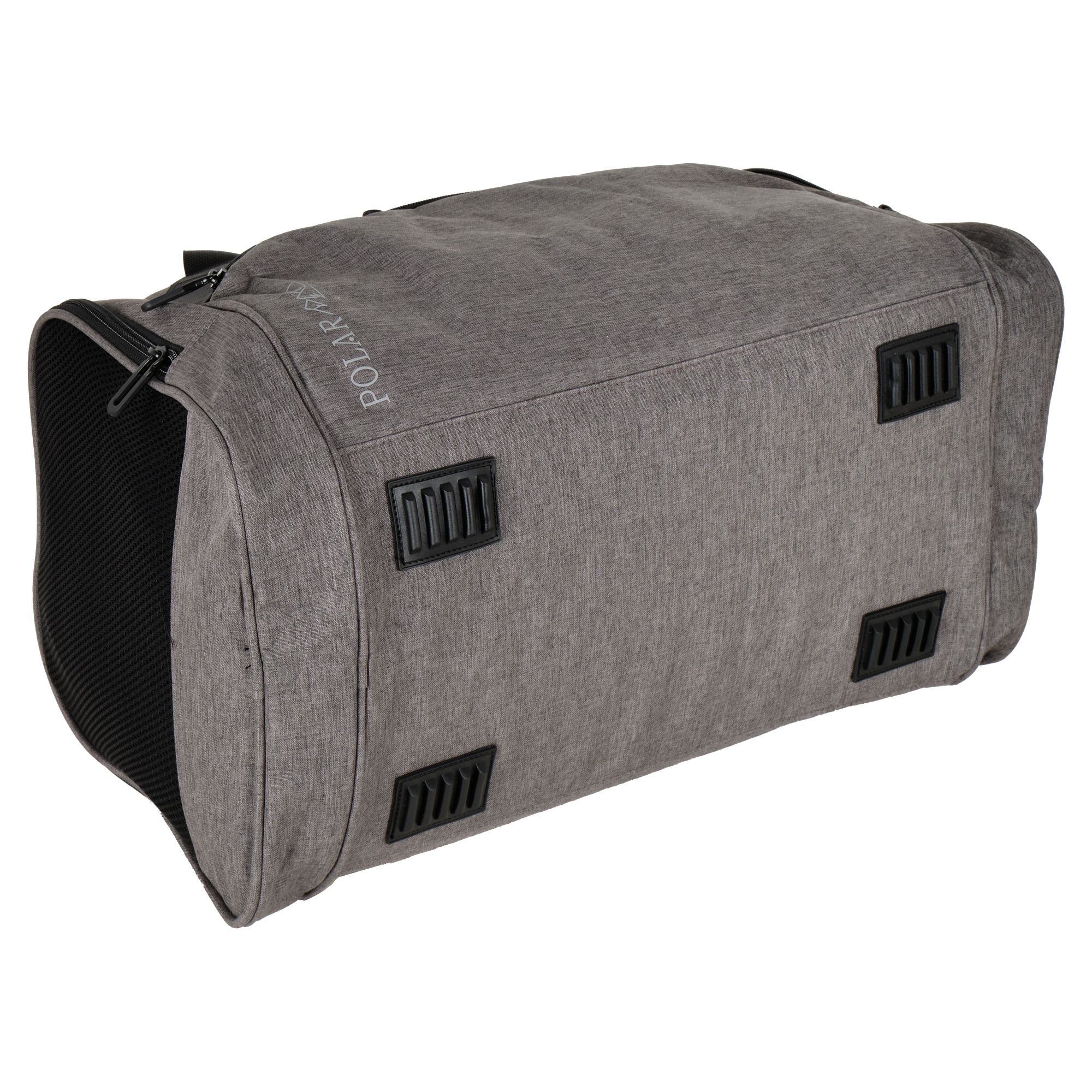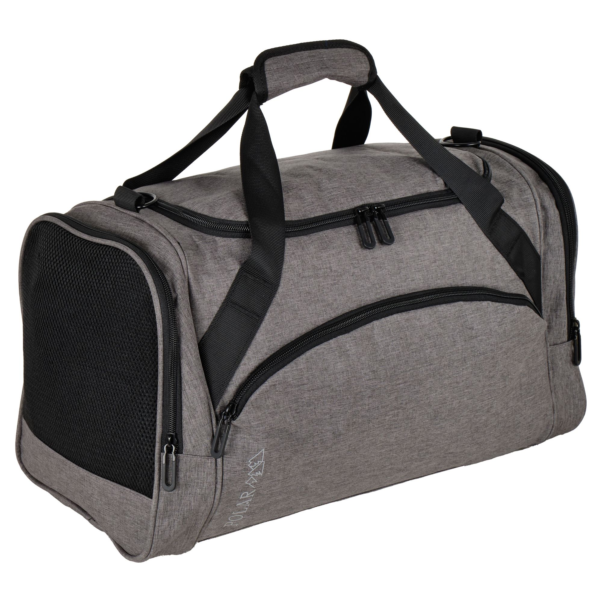 Очень легкая и удобная дорожная сумка фирмы Polar. Состоит из одного большого вместительного отделения, внутри карман на молнии. Спереди сумки карман на молнии и два боковых, один из них сетчатый карман для обуви. В дорожную сумку легко помещаются спортивная форма, обувь или вещи для поездки. Сумку удобно носить через плечо длина ремня 142 см. Высота ручек 17 см. На дне сумки пластиковые ножки, чтобы дно оставалось чистым.