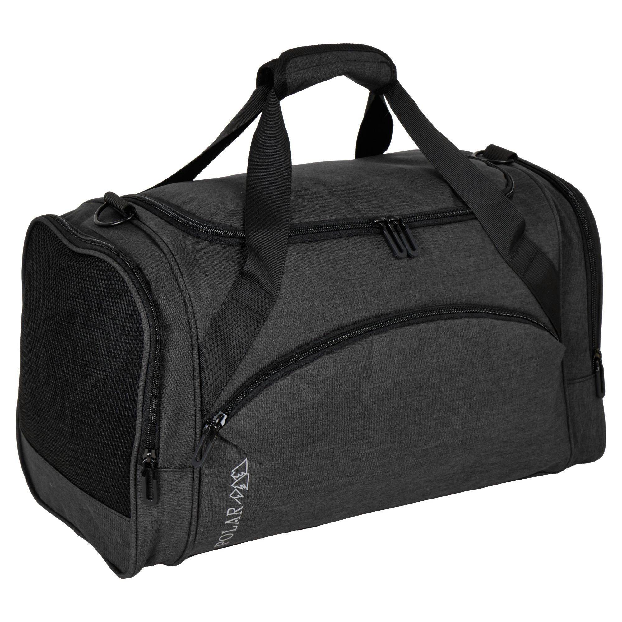 Очень легкая и удобная дорожная сумка фирмы Polar. Состоит из одного большого вместительного отделения, внутри карман на молнии. Спереди сумки карман на молнии и два боковых, один из них сетчатый карман для обуви. В дорожную сумку легко помещаются спортивная форма, обувь или вещи для поездки. Сумку удобно носить через плечо длина ремня 142 см. Высота ручек 17 см. На дне сумки пластиковые ножки, чтобы дно оставалось чистым.