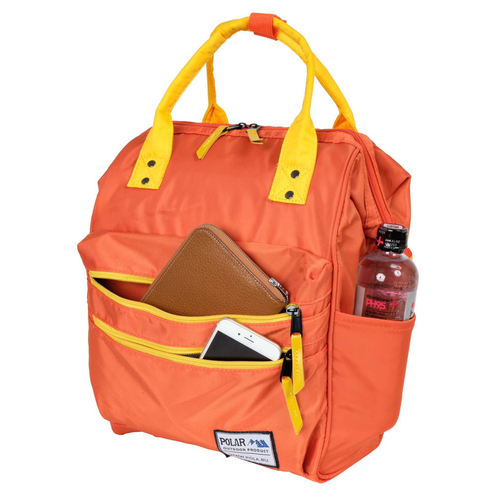 Городской рюкзак фирмы Polar выполнен из полиэстера. Представлен в модной, яркой цветовой гамме. Модель имеет вместительное каркасное отделение, закрывающееся на двухстороннюю молнию. Внутри рюкзака, есть два небольших кармана на молнии и открытый. Спереди два кармана на молнии. По бокам карманы для бутылки с водой или зонтика. На спинке рюкзака есть вертикальная молния для быстрого доступа к вещам. Модель имеет две ручки высотой 10 см для переноски и лямки, регулируемый по длине 90 см.