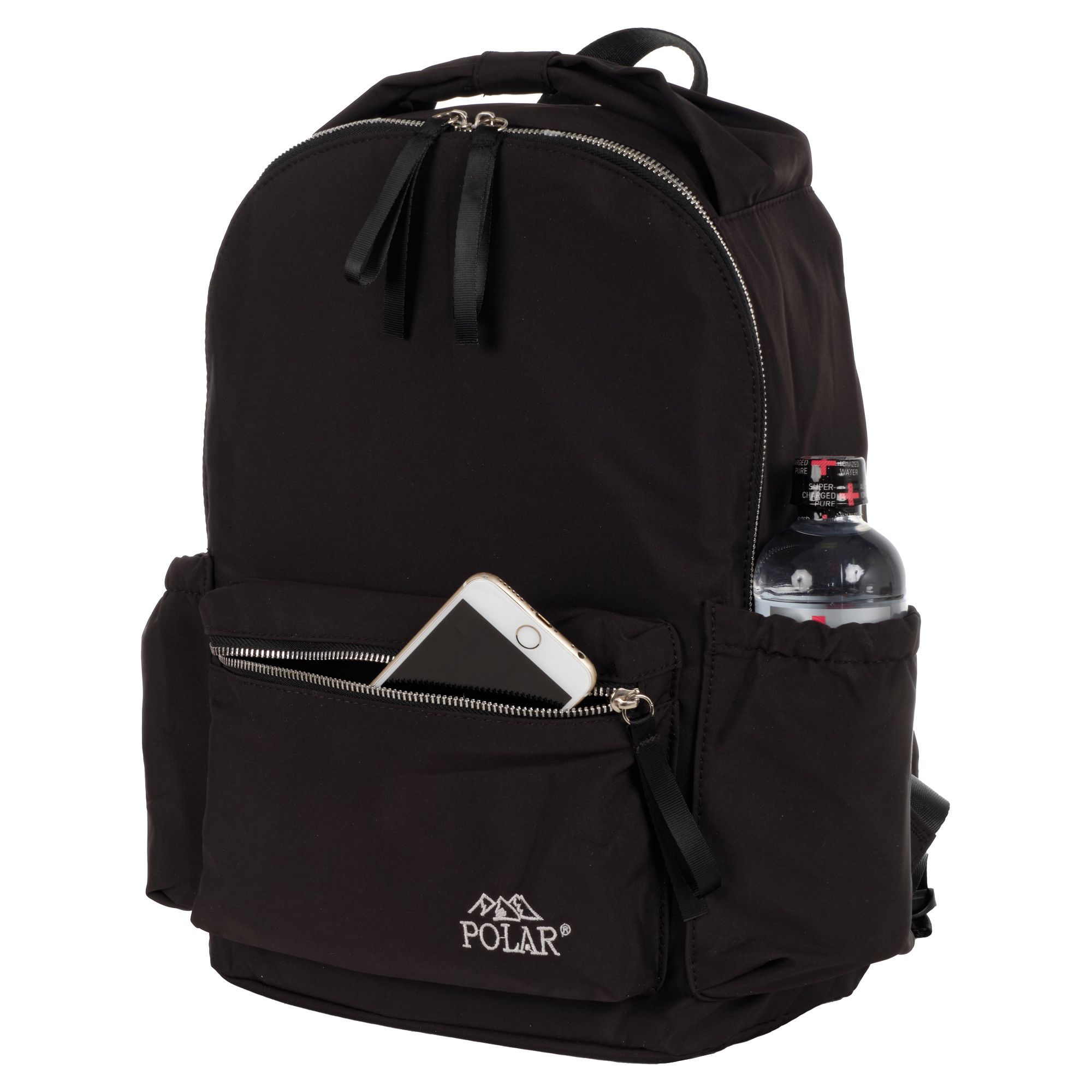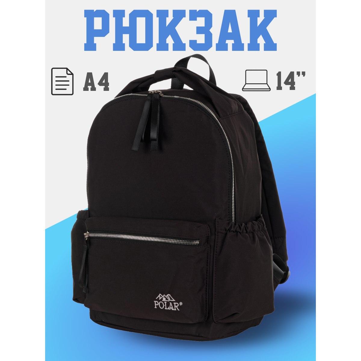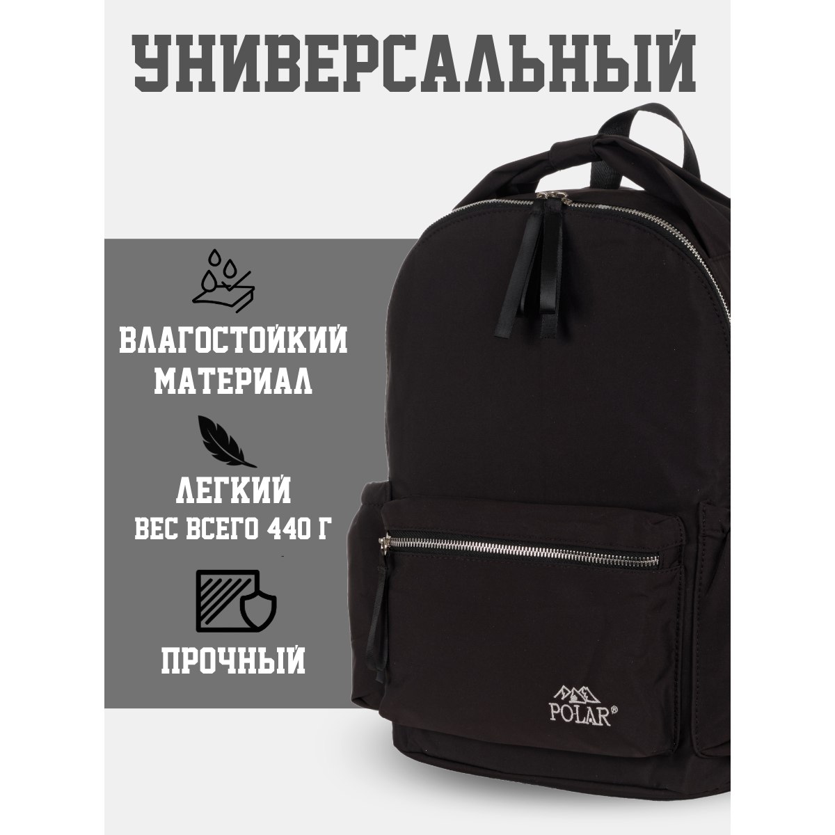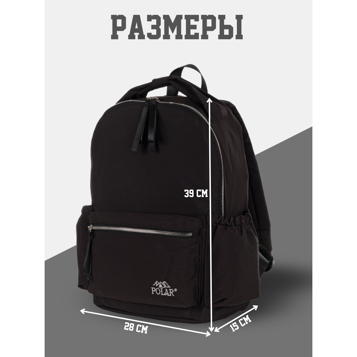 Городской рюкзак фирмы Polar имеет мягкую поролоновую спинку и мягкие лямки. Рюкзак состоит из одного отделения, которое закрывается на металлическую молнию. Внутри отделения один сетчатый карман на молнии. Спереди объемный карман для небольших предметов. По бокам два кармана на резинке. Сзади потайной небольшой кармашек. Максимальная длина лямок 93 см. Высота ручки 8 см.