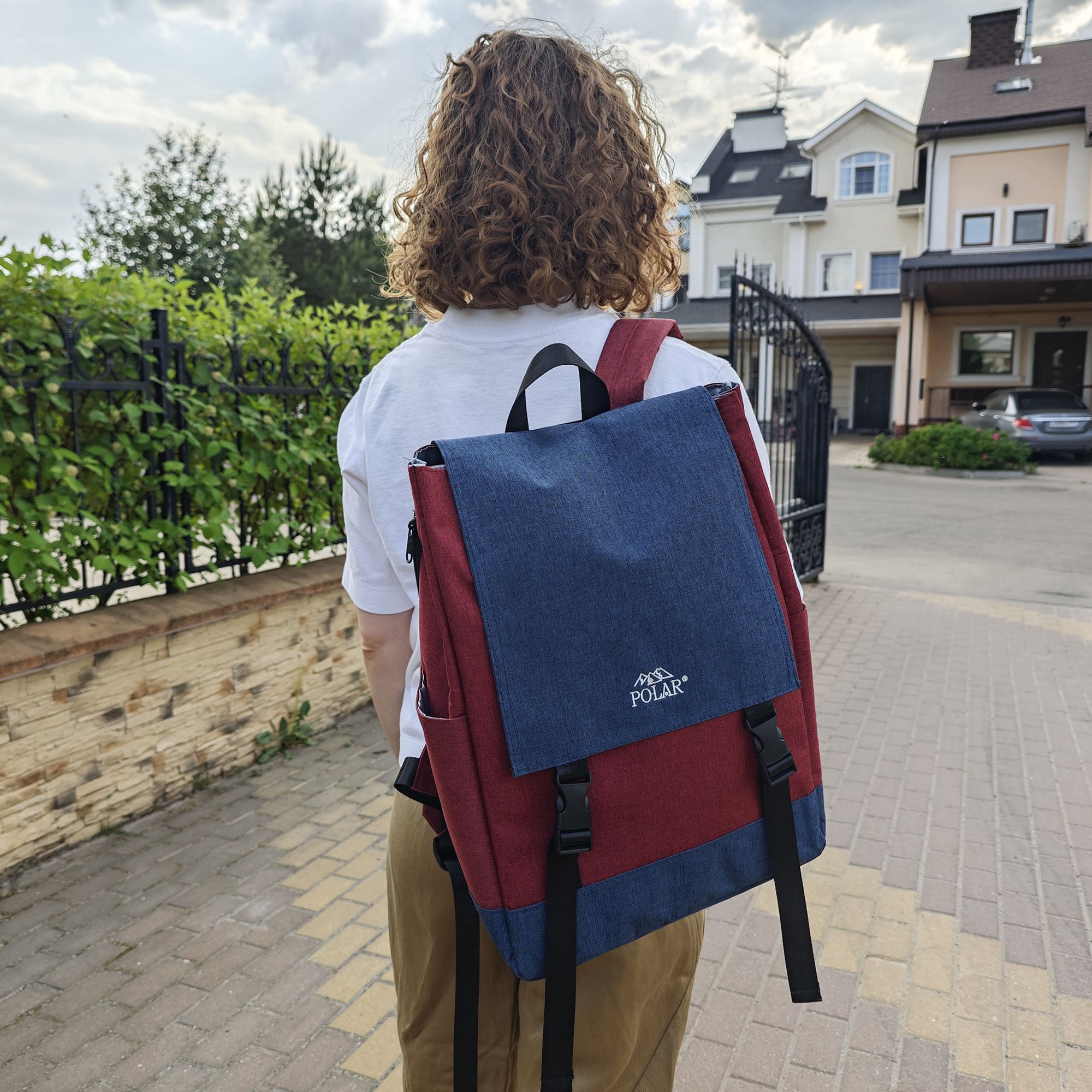 Стильный рюкзак фирмы POLAR для прогулок и учебы, путешествий и спорта, работы, школы, института с верхними клапанами на удобной пряжке. Такая конструкция позволяет менять объем рюкзака, когда вы захотите увеличить его основное отделение за счет клапана на застежке.  Так же верхний клапан — это дополнительная защита ваших вещей от краж и дождя. Рюкзак выглядит очень современно. Материал рюкзака с водо- и грязеотталкивающей пропиткой.  Внутри один большой карман для документов формата А4, планшета или ноутбука до 15" и два небольших кармана. В основное отделение рюкзака можно попасть через молнию на спинке рюкзака. По бокам расположены два открытых кармана. Длина лямок 93 см, ширина 5,5 см.