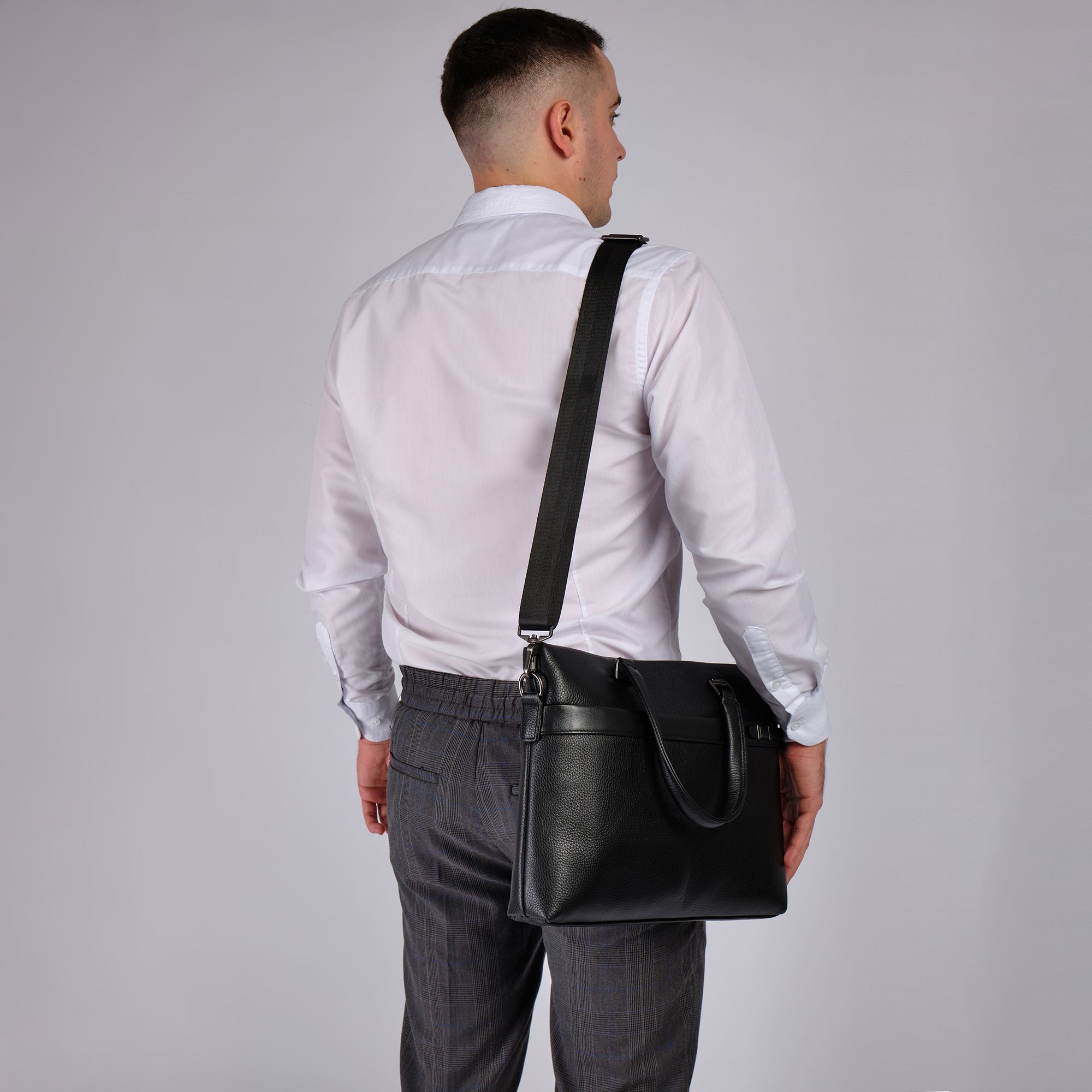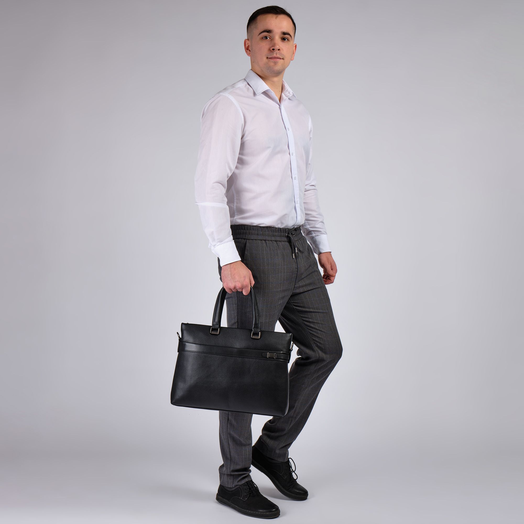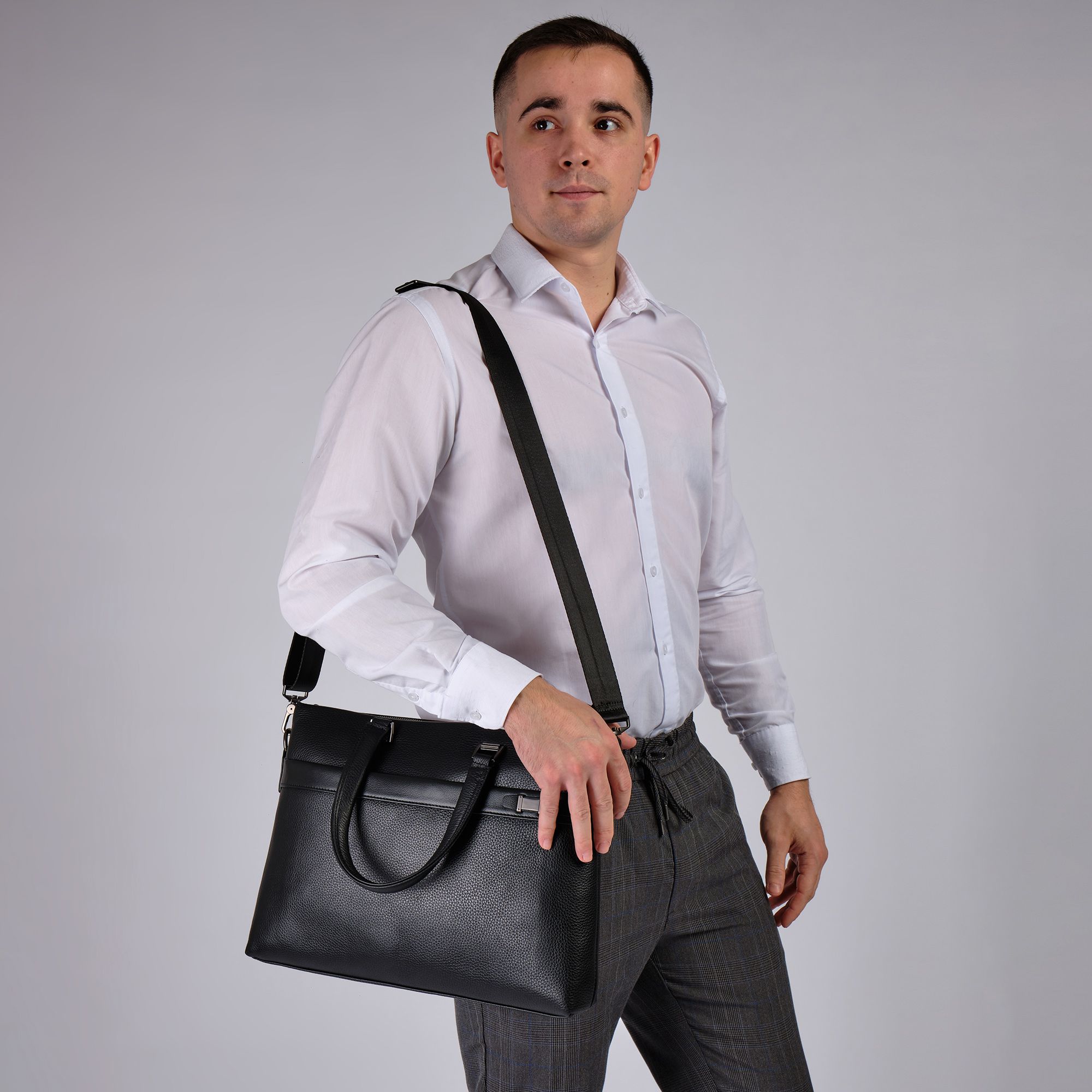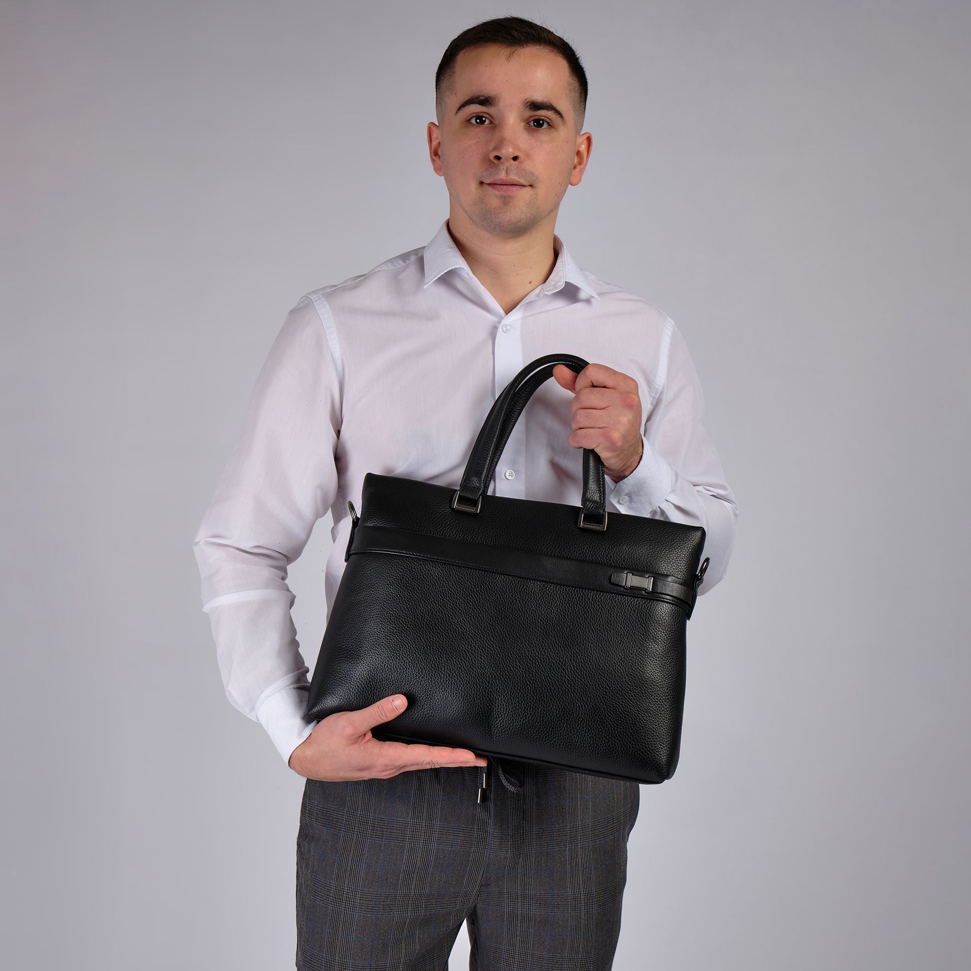 Мужской портфель фирмы Polar из высококачественной натуральной кожи. Черный цвет подчеркивает его классический вид, а также делает возможным легко сочетать его с любым стилем одежды. Подходит для деловых встреч, офисной работы, для учебы в институте и командировок. Портфель имеет одно основное отделение, которое закрывается на металлическую молнию. Внутри есть отделение для электронных устройств или ноутбука с диагональю до 13,3 и открытый кармашек. Модель вмещает формат A4. На передней и задней стенке сумки есть отделения, которое закрывается на магнитную кнопку. Сзади карман на молнии. Высота ручек 18 см, в комплекте есть регулируемый наплечный ремень, максимальная длина 153 см.