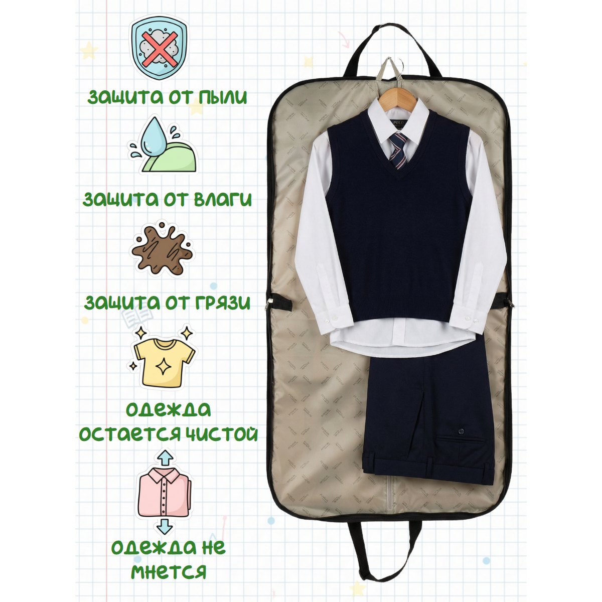Портплед–чехол для одежды фирмы Polar изготовлен из легкого полиэстера .Внутри объемное отделение для бережного хранения костюмов, платьев, рубашек или других вещей, которых надо уберечь от сминания. Предназначен для перевозки самой разнообразной одежды в поезде, автобусе или в салоне самолета. Снаружи портпледа вы найдете вместительный карман, куда можно положить различные аксессуары. Есть контактная метка в которую можно вложить карточку с контактной информацией владельца. Портпледы с яркими расцветками.