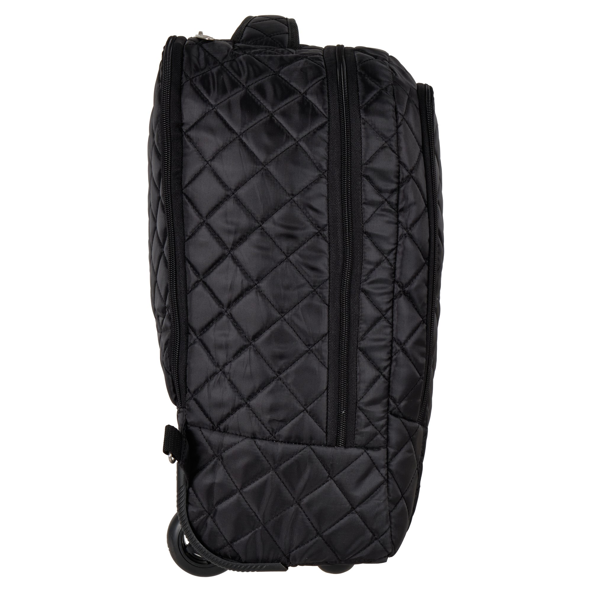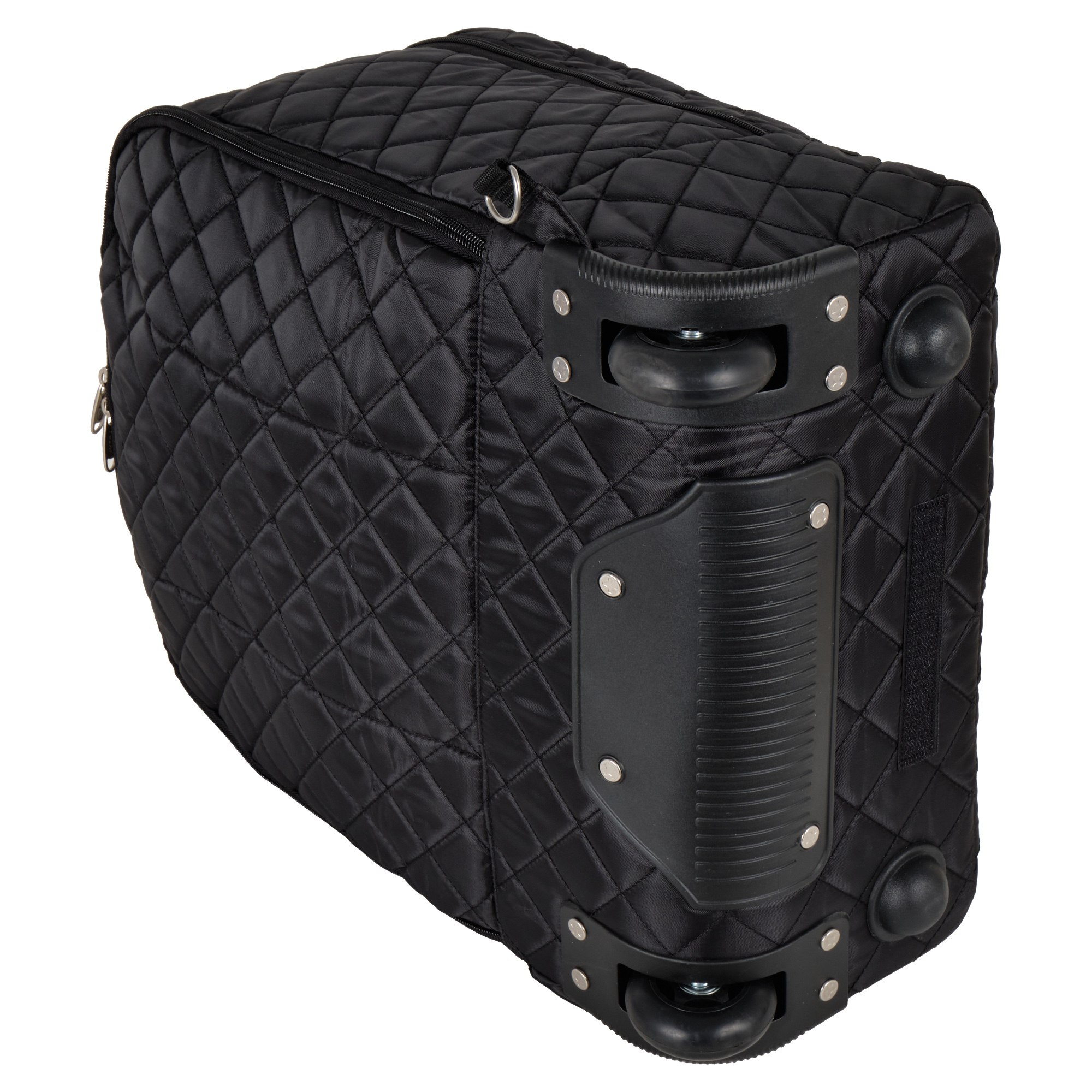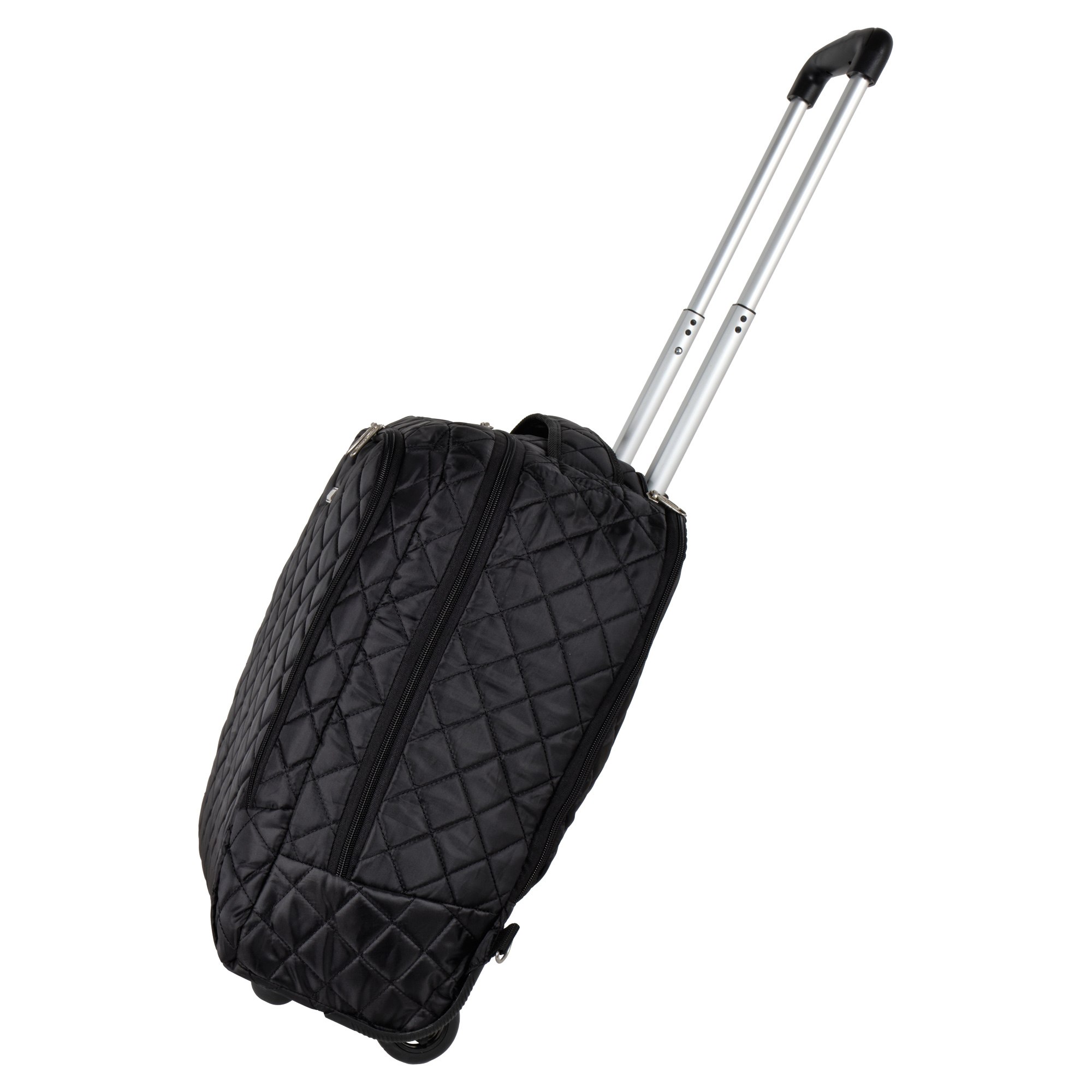 Колеса прорезиненные, дно дополнительно защищено от истирания. Сумка устойчиво стоит на ножках. Модель подходит под требования для ручной клади в большинство авиакомпаний с ограничениями по размерам 50X40X20 см, а линейный размер (сумма трех измерений равен 106 см).