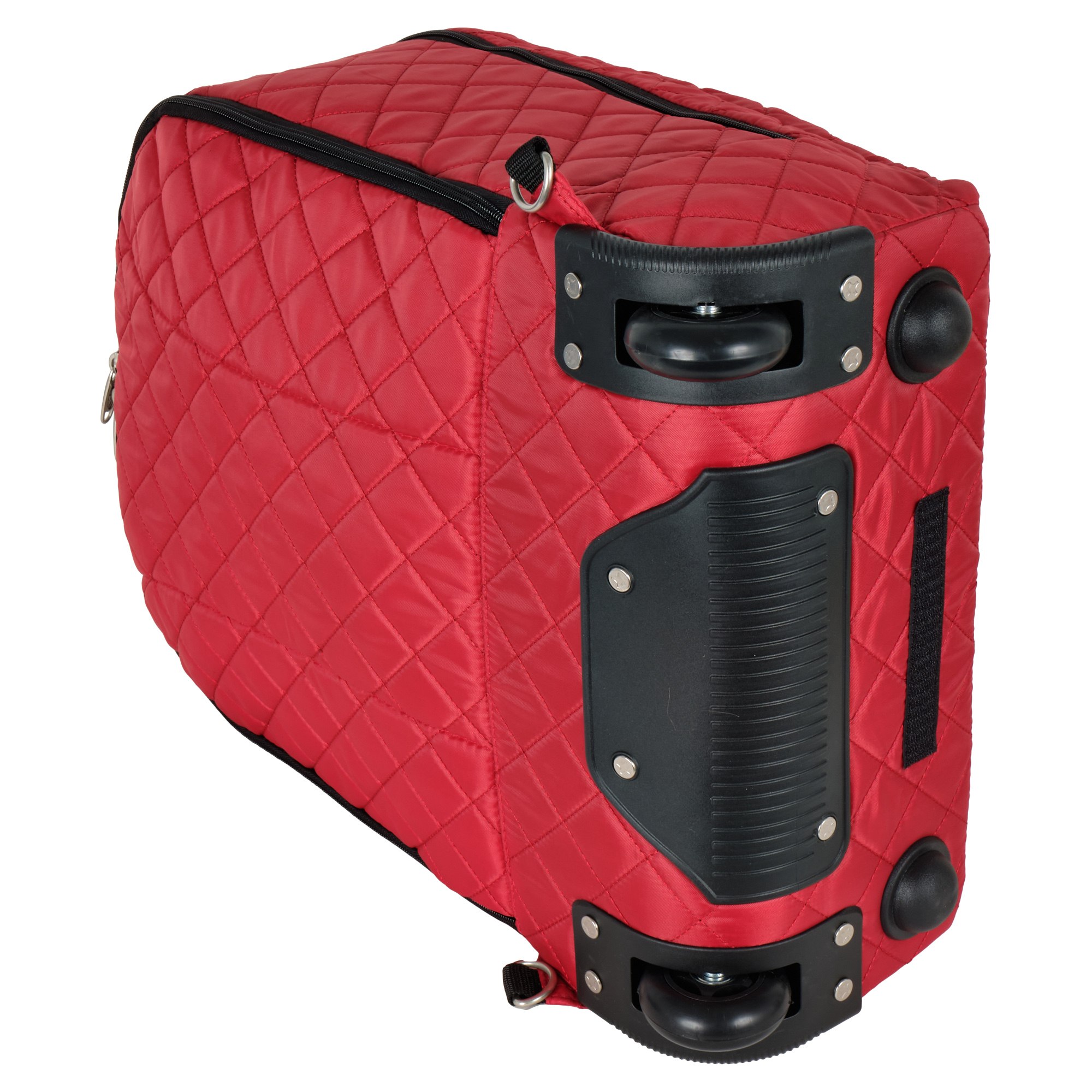 Колеса прорезиненные, дно дополнительно защищено от истирания. Сумка устойчиво стоит на ножках. Модель подходит под требования для ручной клади в большинство авиакомпаний с ограничениями по размерам 50X40X20 см, а линейный размер (сумма трех измерений равен 106 см).