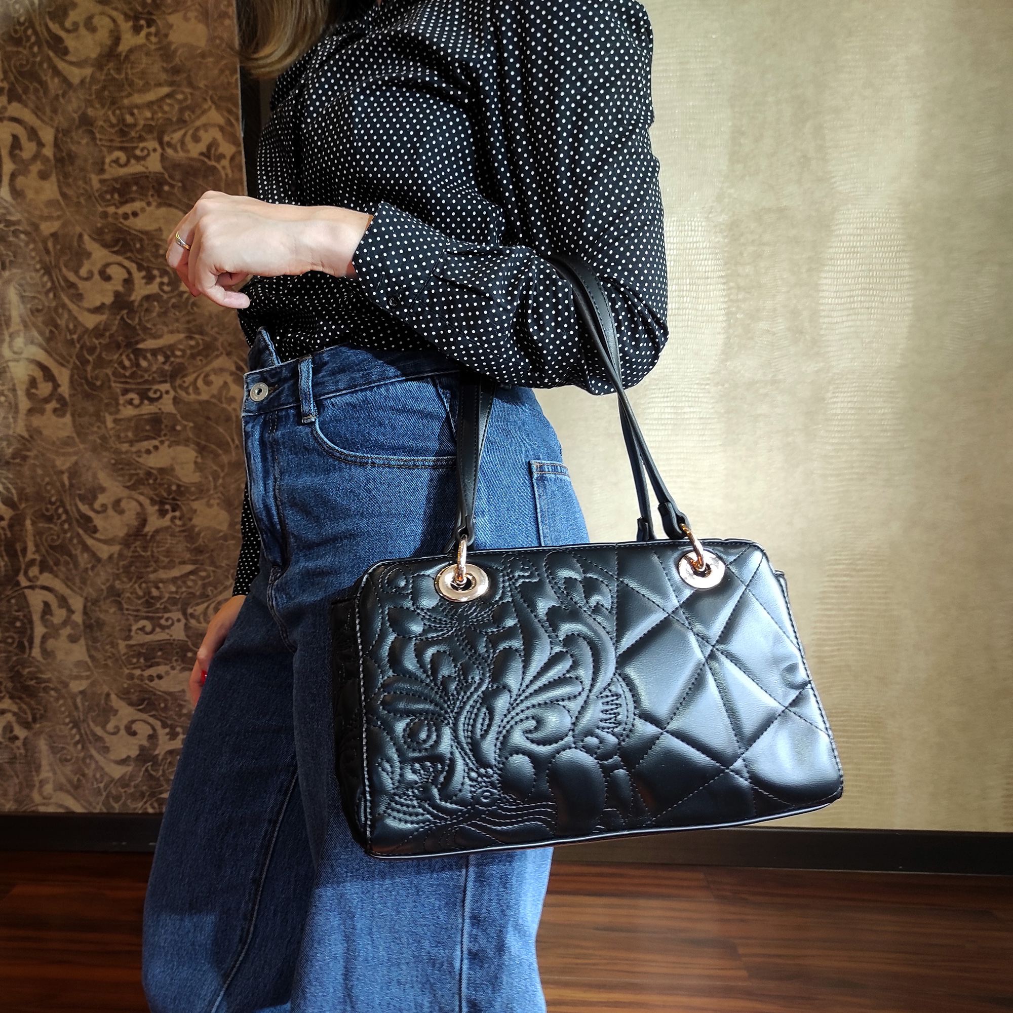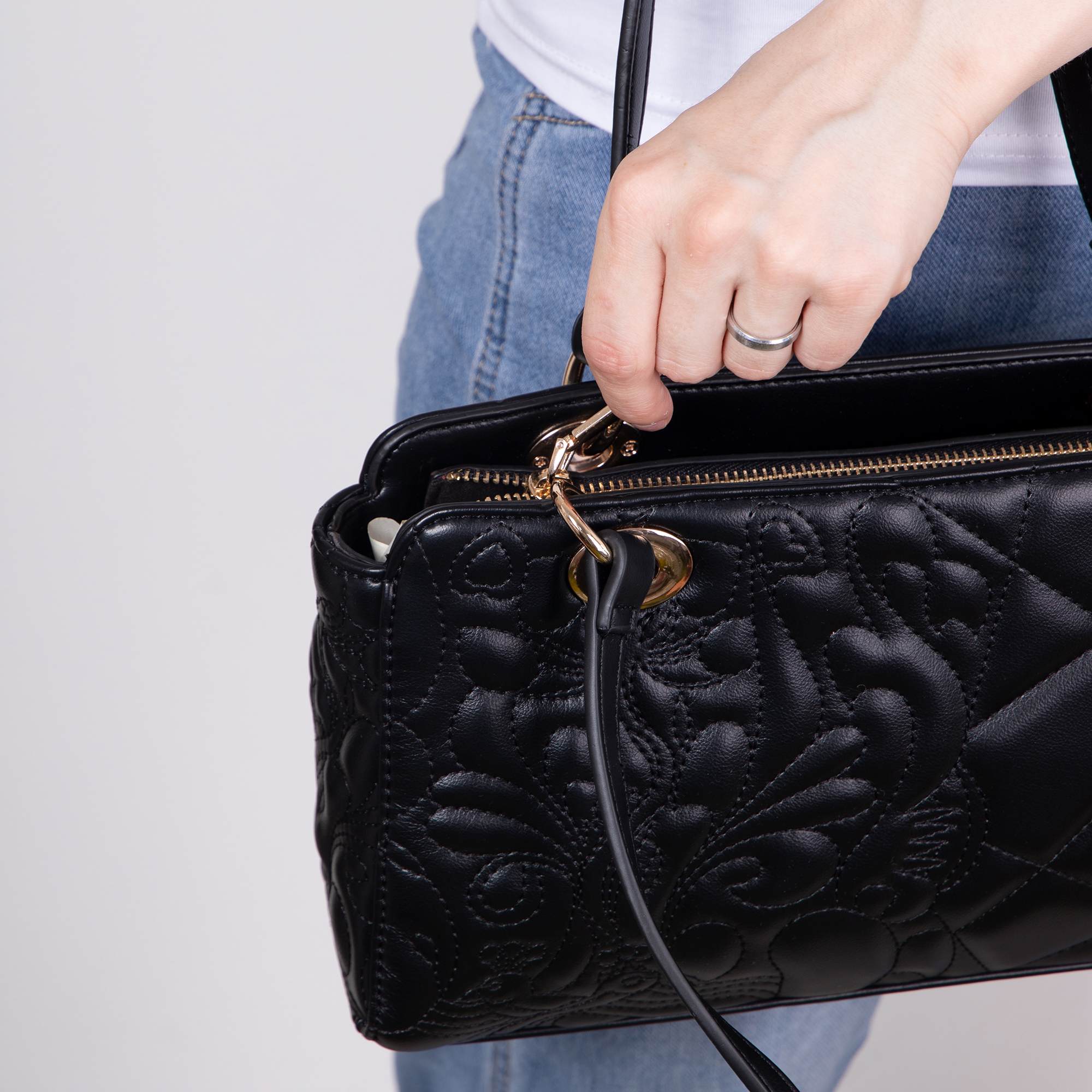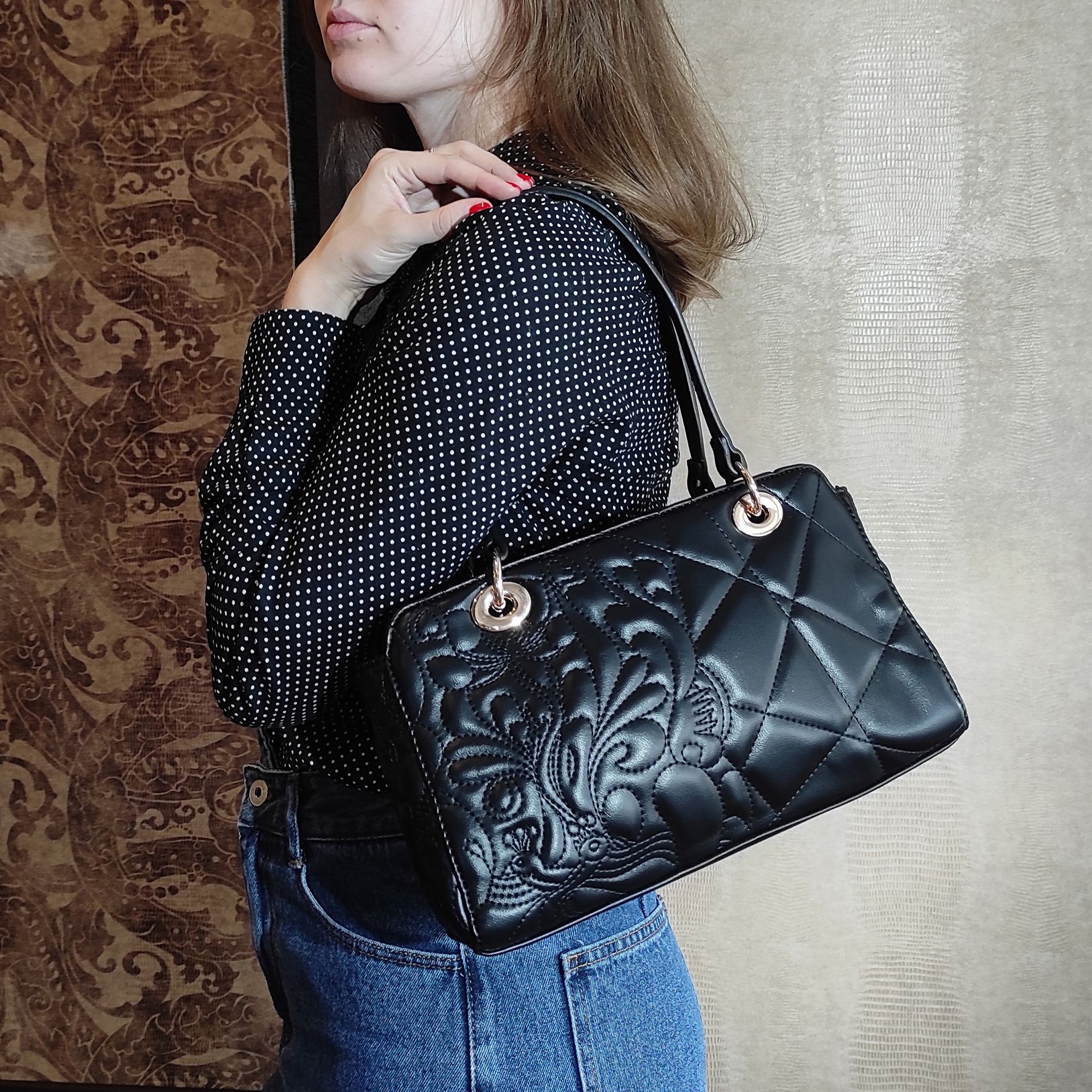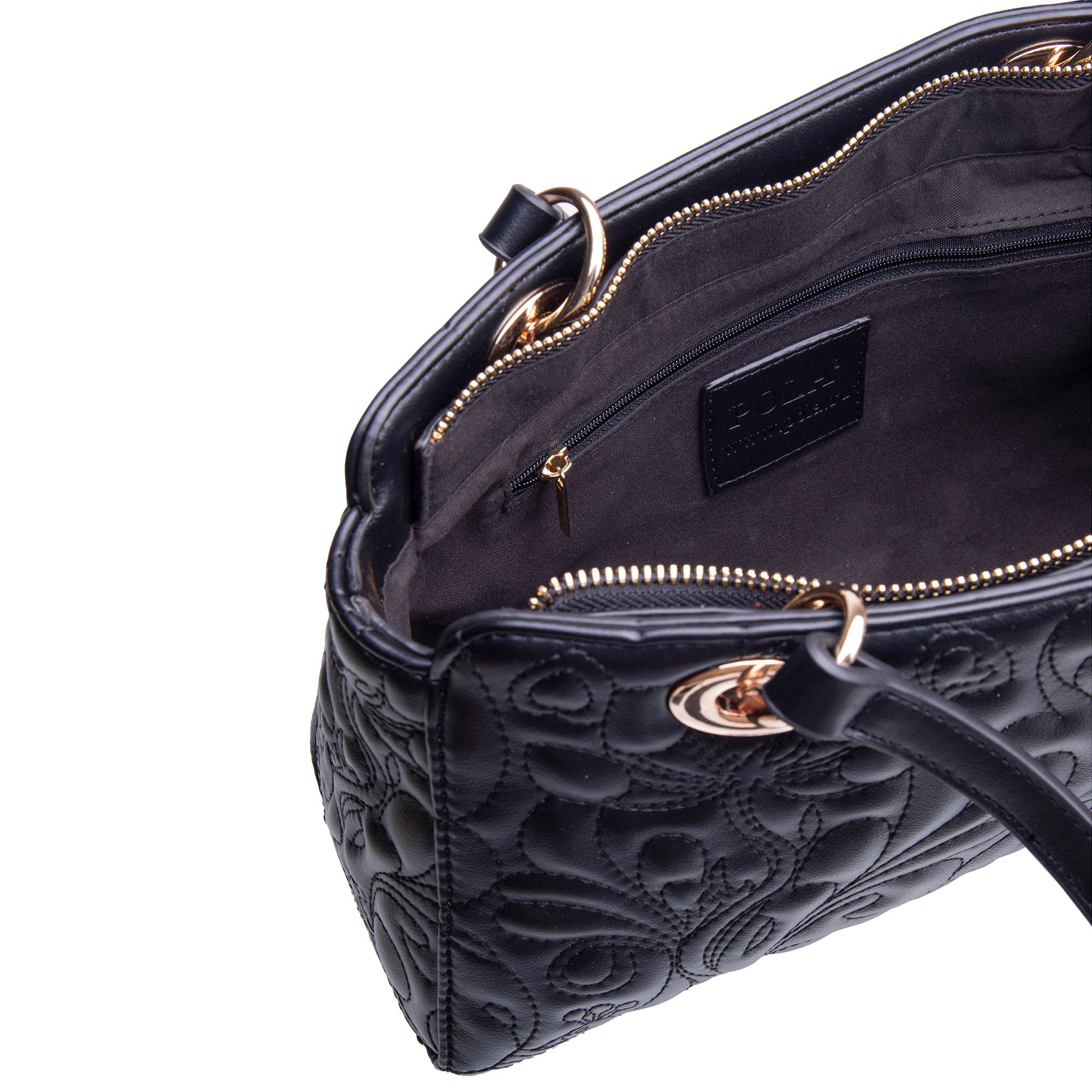 Женская сумка фирмы Pola выполнена из экокожи и по всему периметру украшена рельефной отстрочкой. Основное отделение закрывается на металлическую молнию, внутри есть карман на молнии и один открытый карман для мелочей. Сзади сумки присутствует врезной карман на молнии. Сумку можно переносить с помощью двух ручек, высота которых составляет 25 см. Данная модель очень элегантна и великолепно подходит для ежедневного использования. Цвет фурнитуры-золото.