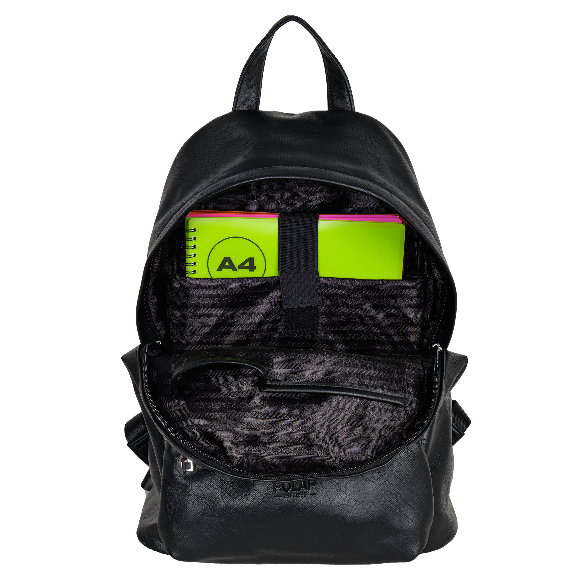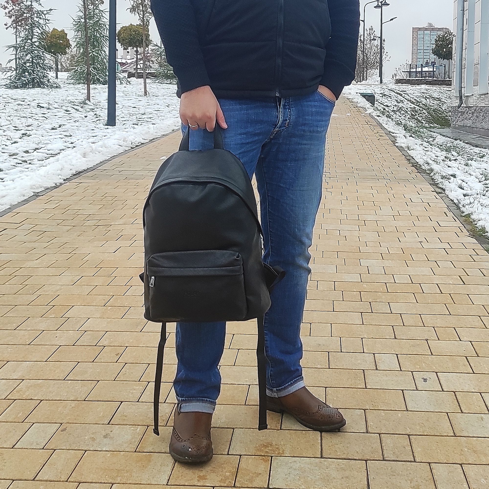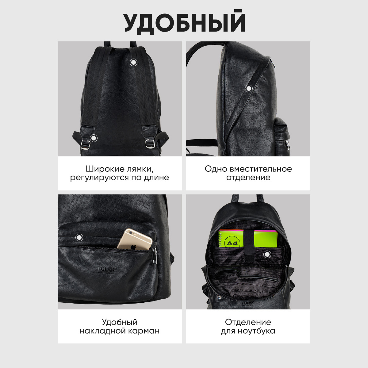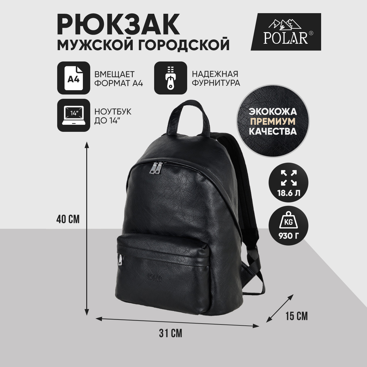 Городской рюкзак фирмы Polar из экокожи с отделением для ноутбука состоит из одного вместительного отделения и закрывается на молнию. Внутри расположены два открытых кармана и один на молнии, также отделение для ноутбука диагональю до 14. размеры отсека для ноутбука 33 x 23 x 2. Спереди рюкзака расположен небольшой накладной карман на молнии. Лямки регулируются по длине максимальная 93 см. Сверху расположена ручка высотой 9 см. Рюкзак свободно вмещает формат А4.