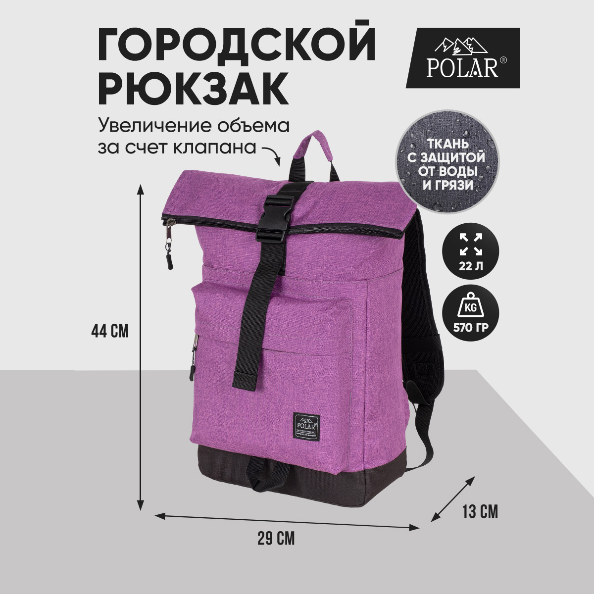 Стильный рюкзак фирмы POLAR для прогулок и учебы, путешествий и спорта, работы, школы, института с верхним клапаном на удобной пряжке. Такая конструкция позволяет менять объем рюкзака, когда вы захотите увеличить его основное отделение за счет клапана на застежке. Так же верхний клапан — это дополнительная защита ваших вещей от краж и дождя. Рюкзак выглядит очень современно. Он универсален и очень надежный, подходит как для мужчин, так и для женщин. Материал рюкзака с водо- и грязеотталкивающей пропиткой. Эргономические лямки с сетчатыми уплотнителями делают этот рюкзак очень комфортным в использовании и снимают лишнюю нагрузку. Регулирующая грудная стяжка с удобным фиксатором. Основное отделение закрывается на молнию и регулирующую застежку с клапаном на пряжке. Внутри один большой карман для документов формата А4, планшета или ноутбука до 15" и небольшой карман на молнии. Есть накладной карман на молнии для карточек, ключей. Длина лямок 82 см, ширина 7,5 см.