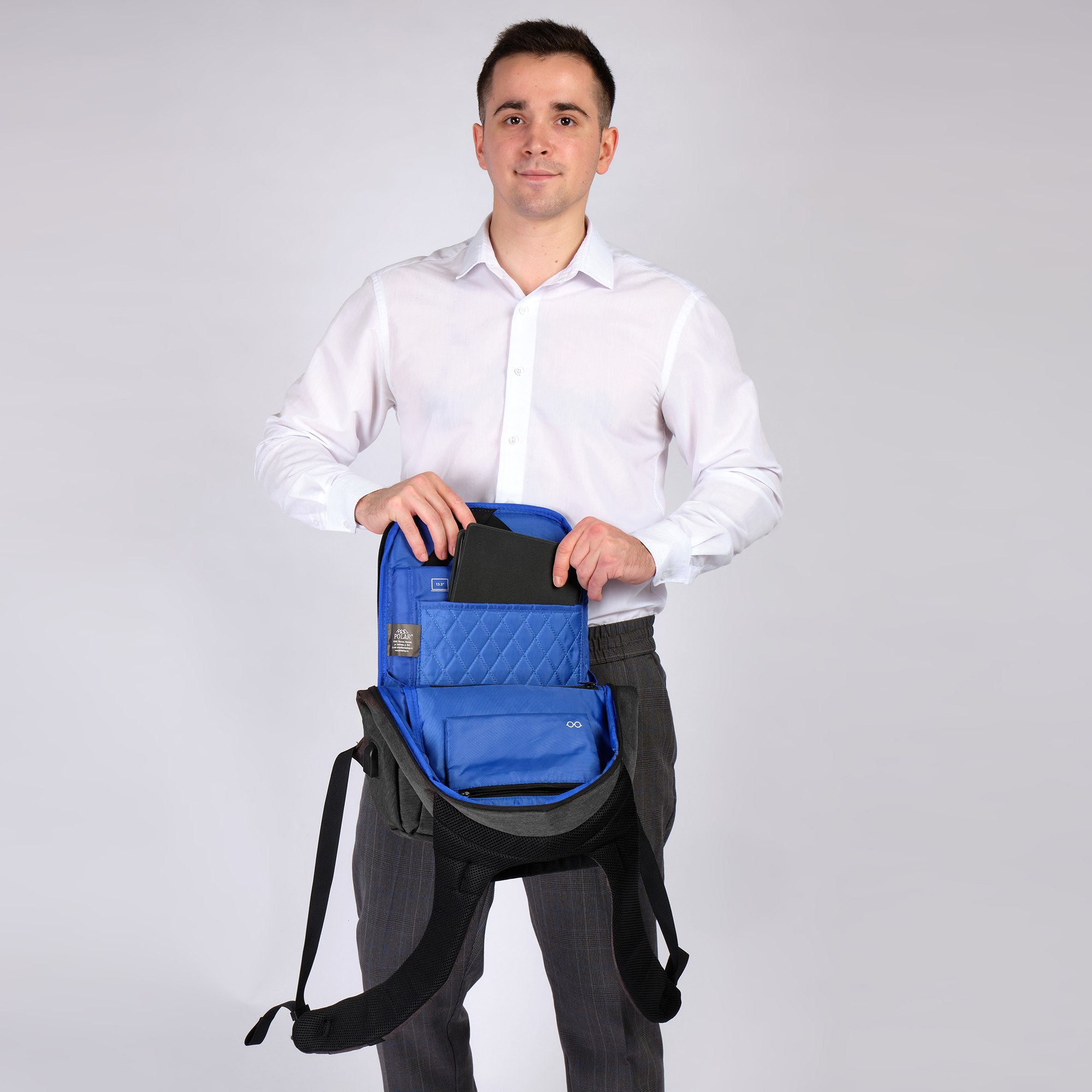 На спинке рюкзака есть открытый отдел для ноутбука с диагональю до 13,3 дюйма, над ним — карман для планшета или электронной книги. Размеры отсека для ноутбука 24 x 30 x 3.5, а отсека для планшета 24 x 22 x 1.