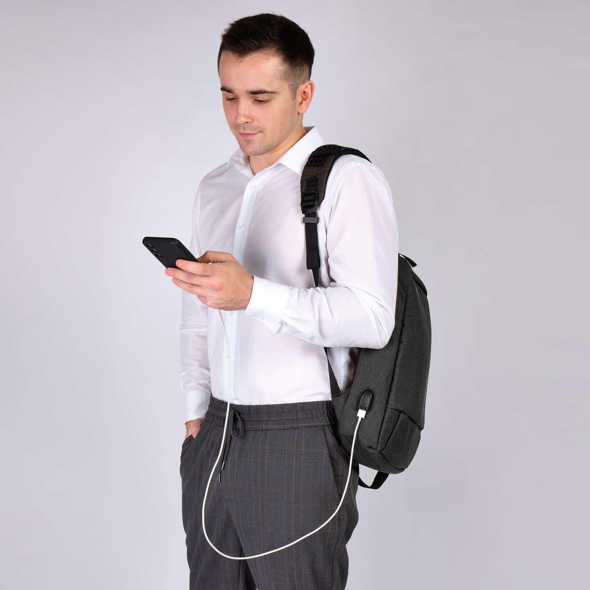 Сверху подвешен карман для очков из микрофибро, также есть два потайных кармана на молнии. Потайной карман на молнии, предназначен для внешнего аккумулятора. Рюкзак оснащен USB-кабелем и и USB - портом. Теперь, если у Вас сел телефон во время поездки, внешний USB – порт позволит с легкостью подзарядить ваш гаджет в дороге.