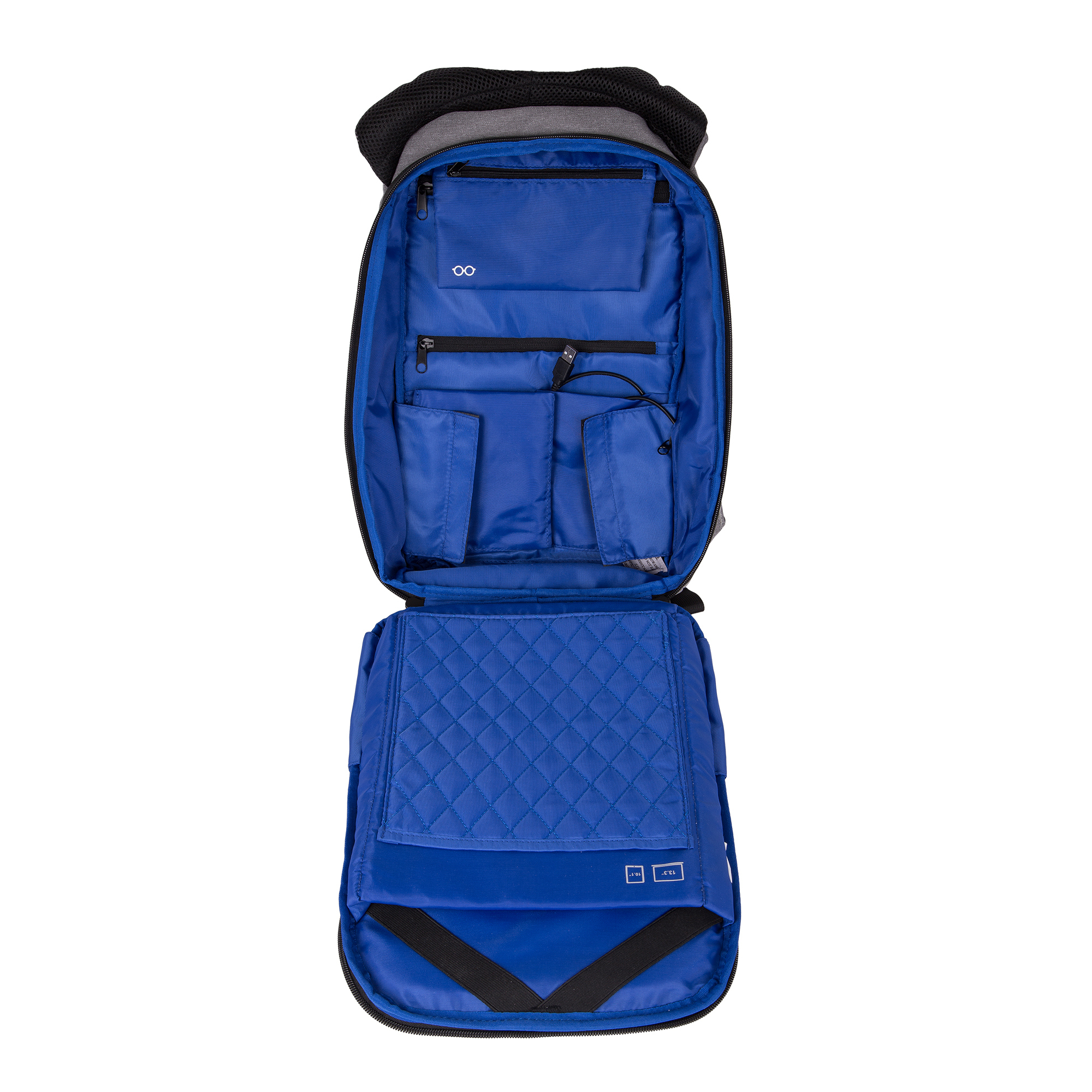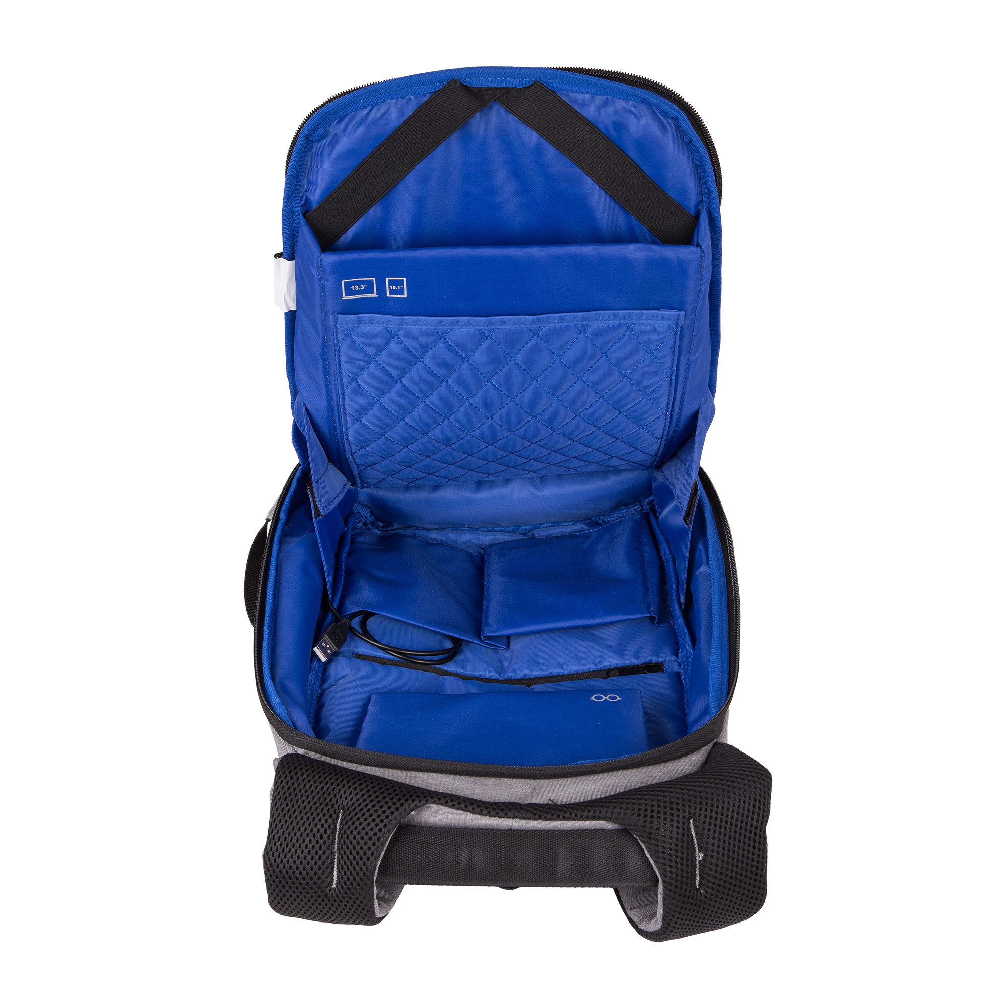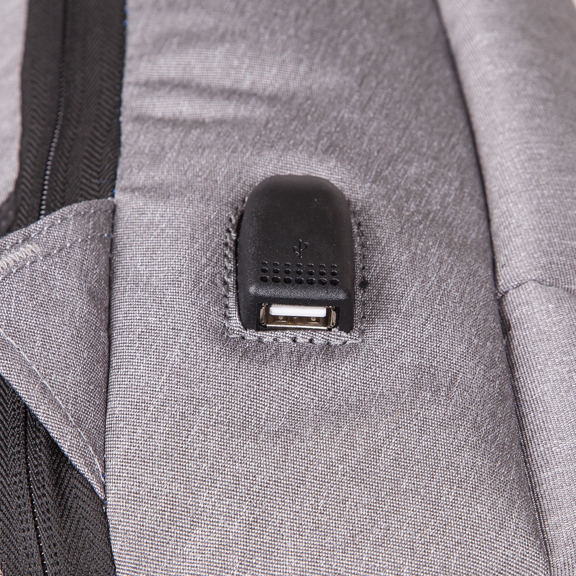 Сверху подвешен карман для очков из микрофибро, также есть два потайных кармана на молнии. Потайной карман на молнии, предназначен для внешнего аккумулятора. Рюкзак оснащен USB-кабелем и и USB - портом. Теперь, если у Вас сел телефон во время поездки, внешний USB – порт позволит с легкостью подзарядить ваш гаджет в дороге.