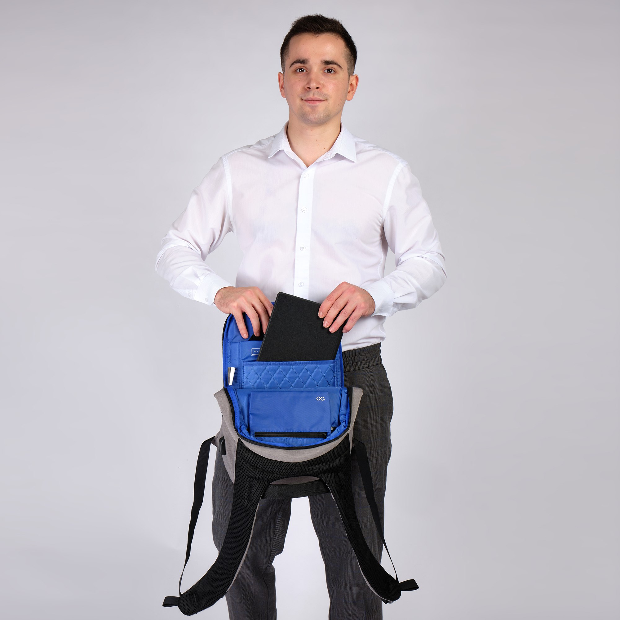 На спинке рюкзака есть открытый отдел для ноутбука с диагональю до 13,3 дюйма, над ним — карман для планшета или электронной книги. Размеры отсека для ноутбука 24 x 30 x 3.5, а отсека для планшета 24 x 22 x 1.