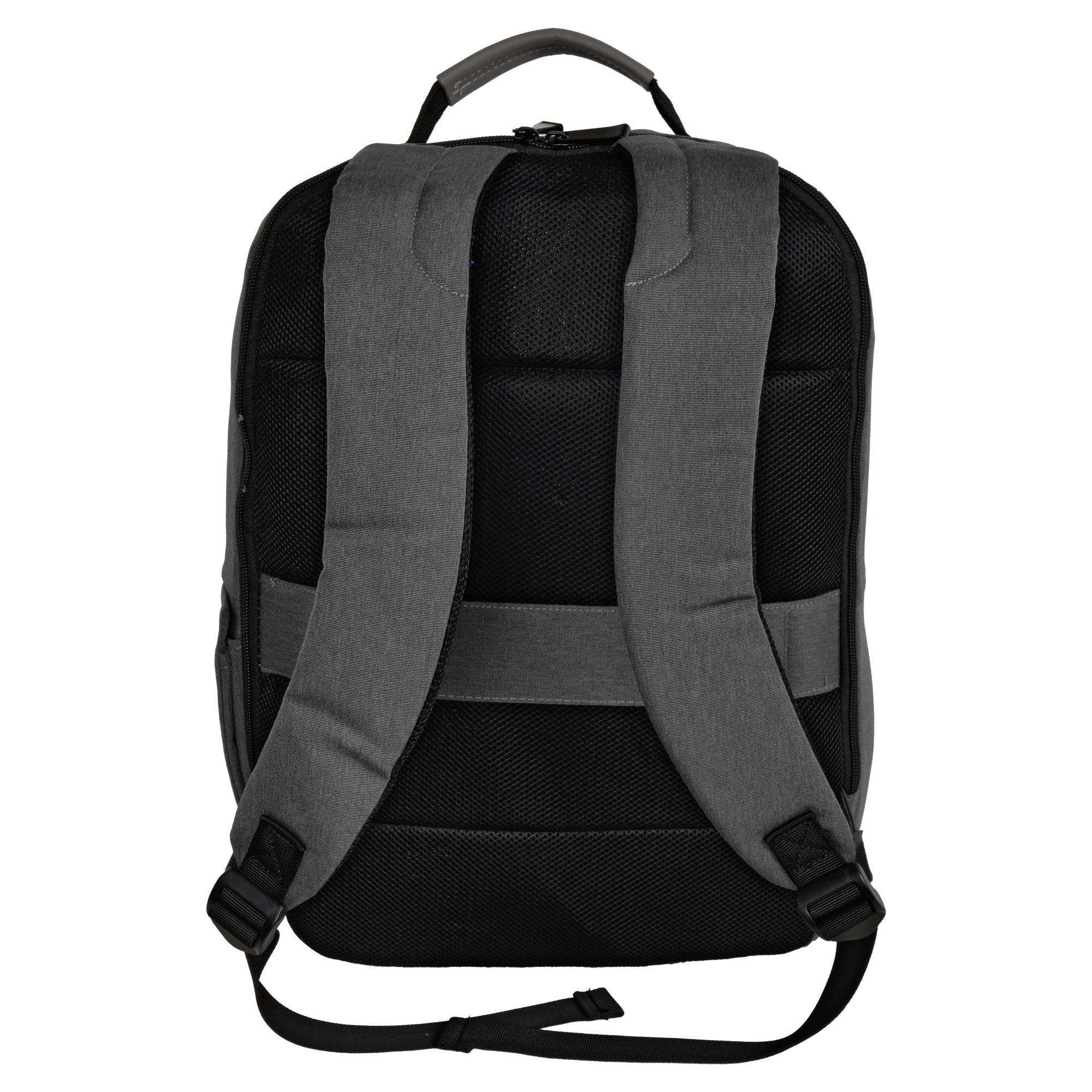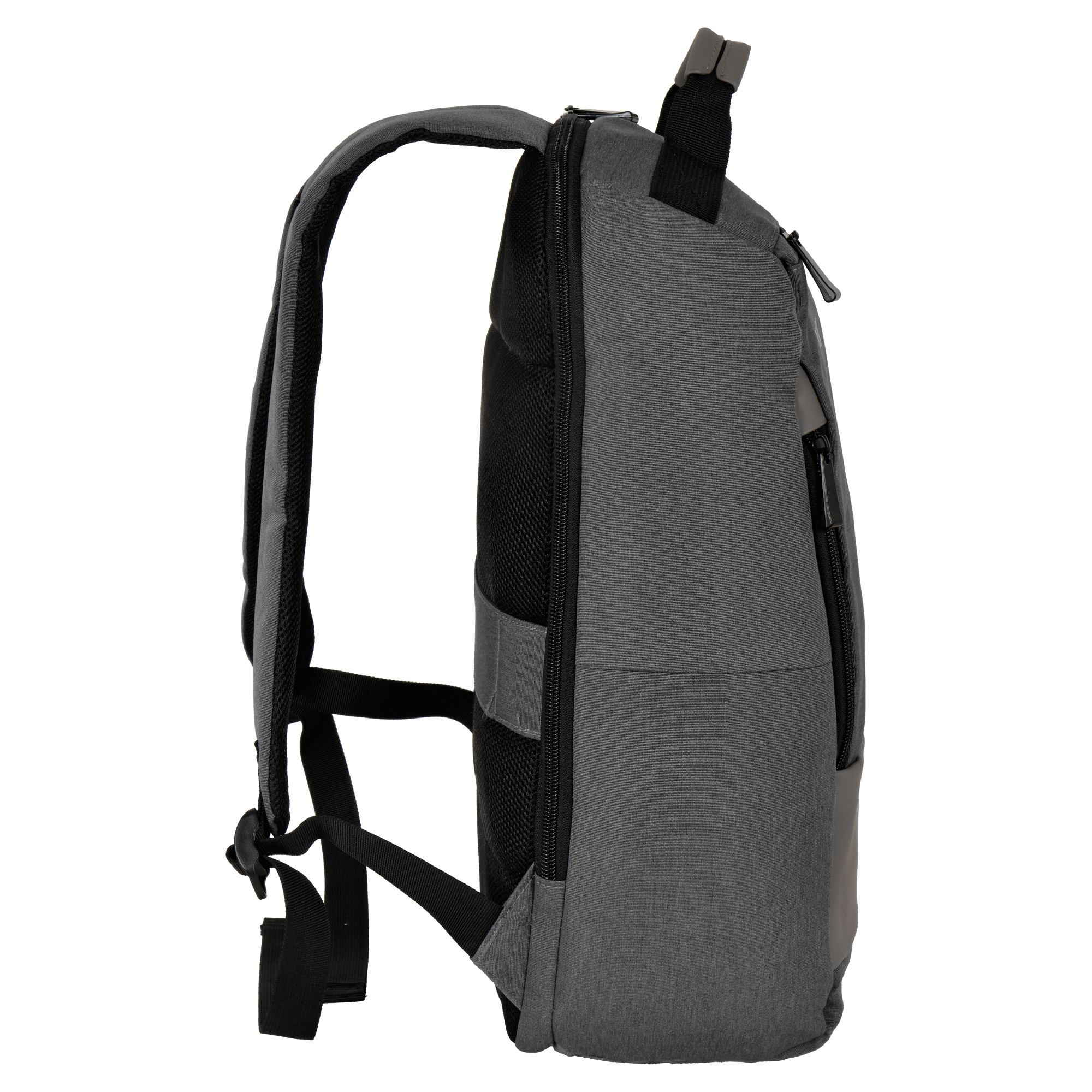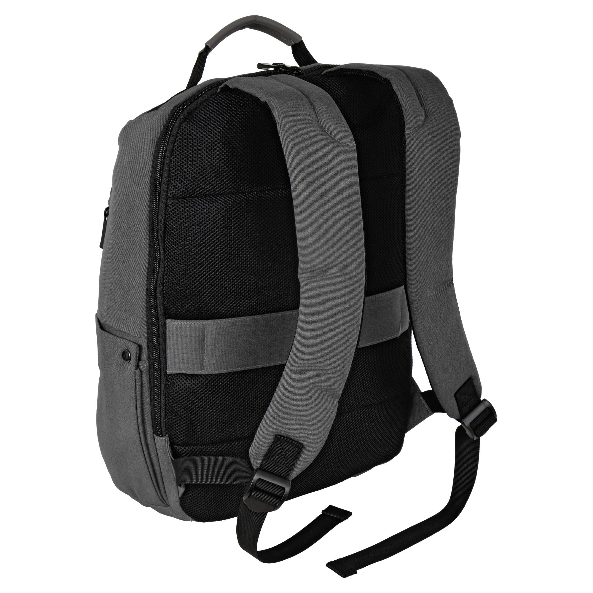 Рюкзак имеет одно основное отделение, которое закрывается на потайную молнию, внутри которого есть карманы для ноутбука диагональю до 14” и планшета, несколько открытых карманов и карман на молнии. На передней стенке рюкзака, с обеих сторон есть боковые карманы на молнии и фронтальный карман для мелких вещей, которые должны быть под рукой. Сбоку есть открытый карман на кнопке для бутылки воды или зонта. Спинка рюкзака выполнена из мягкого вентилируемого материала, благодаря этому с рюкзаком комфортно ходить целый день. Также на спинке пришита лента, с помощью которой удобно крепить рюкзак на выдвижной ручке чемодана, а это дополнительный комфорт для путешественников.