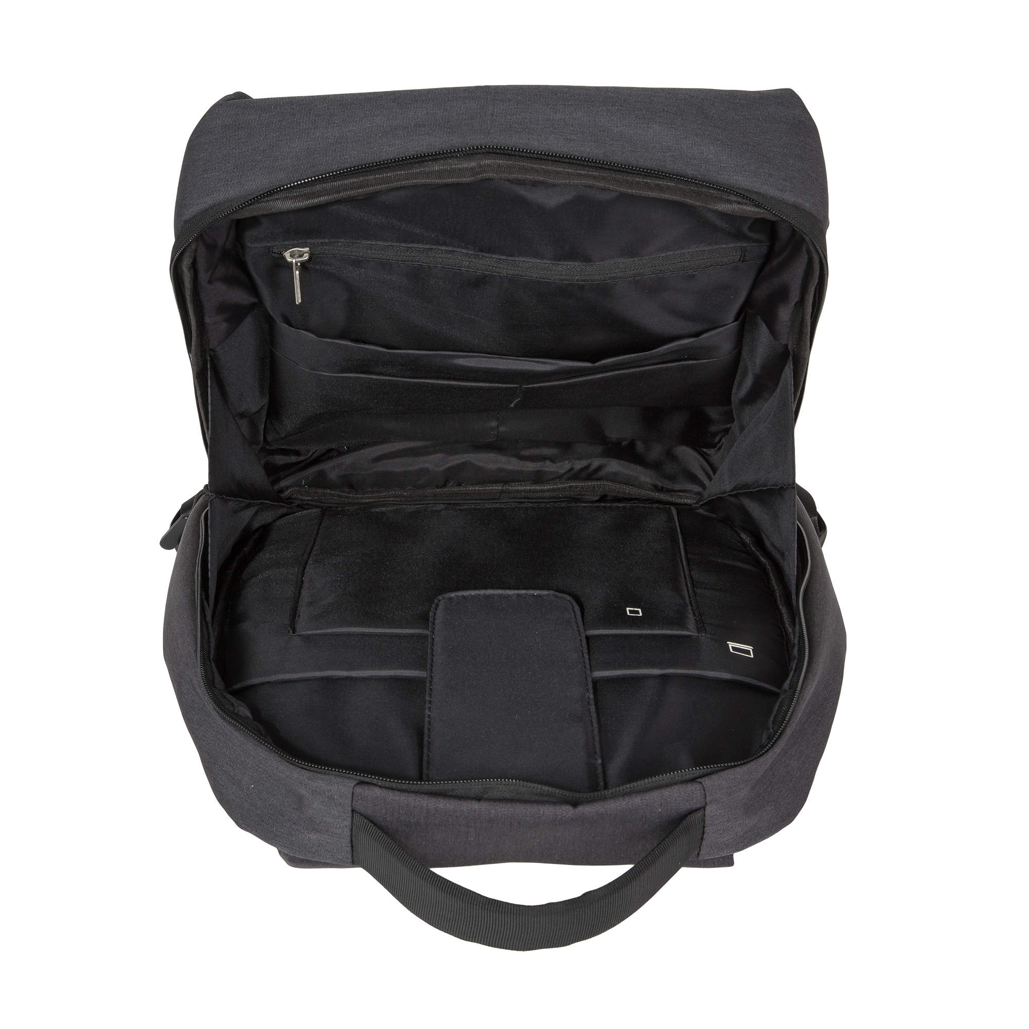 Также на передней стенке есть прорезной карман на молнии, внутри которого множество открытых карманов.