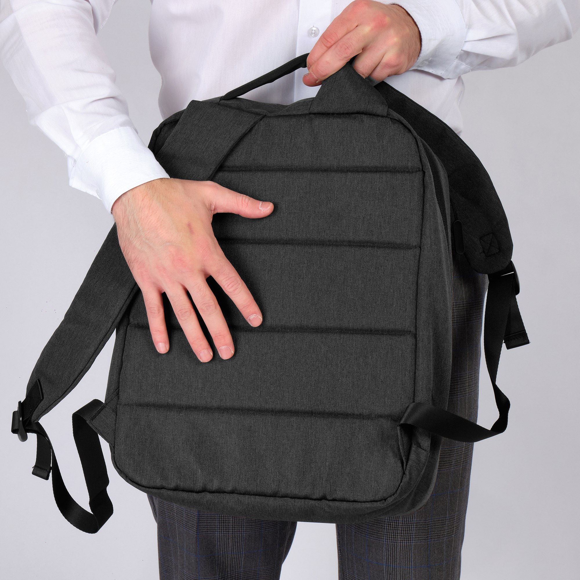 Стильный городской рюкзак с отделением для ноутбука прекрасно подходит для ежедневного использования. Минималистичный дизайн этого рюкзака создан специально для деловых людей или студентов и идеально подходит для повседневного ношения. Рюкзак имеет одно основное отделение, внутри которого есть карманы для ноутбука с диагональю до 14” размер отсека 38 х 28 х 2 и планшета, несколько открытых карманов и потайной карман на молнии.