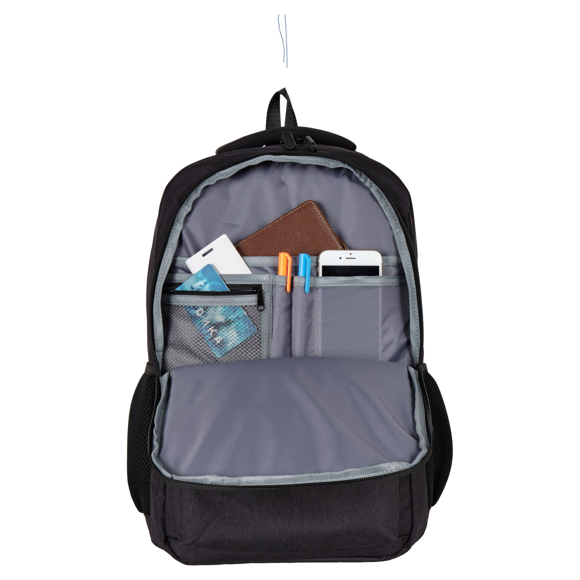 На спинке рюкзака есть открытый отдел для ноутбука с диагональю до 17 дюймов, над ним — карман для планшета или электронной книги. Размеры отсека для ноутбука 28 x 41 x 3.5, а отсека для планшета 24 x 21 x 1.
