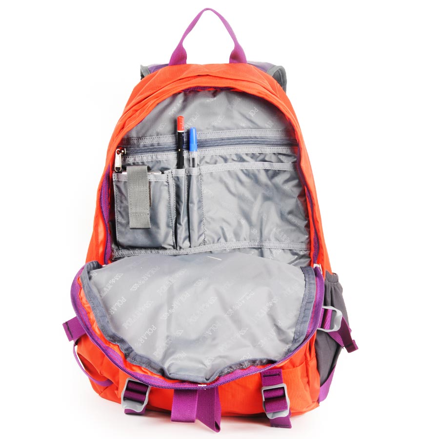 Два отдела. В основном отделе есть открытый карман. Внутри второго отдела имеется карман на молнии и отделение для канцелярских принадлежностей (ручка, маркер). Жесткая ортопедическая спинка с поролоновыми вставками под сеткой для лучшего воздухообмена. По бокам находятся один открытый карман и карман на молнии. Также у рюкзака имеются стяжки по бокам и на дне для регулирования объема, а грудные стяжки фиксируют его удобное положение. Лямки регулируются стяжками .