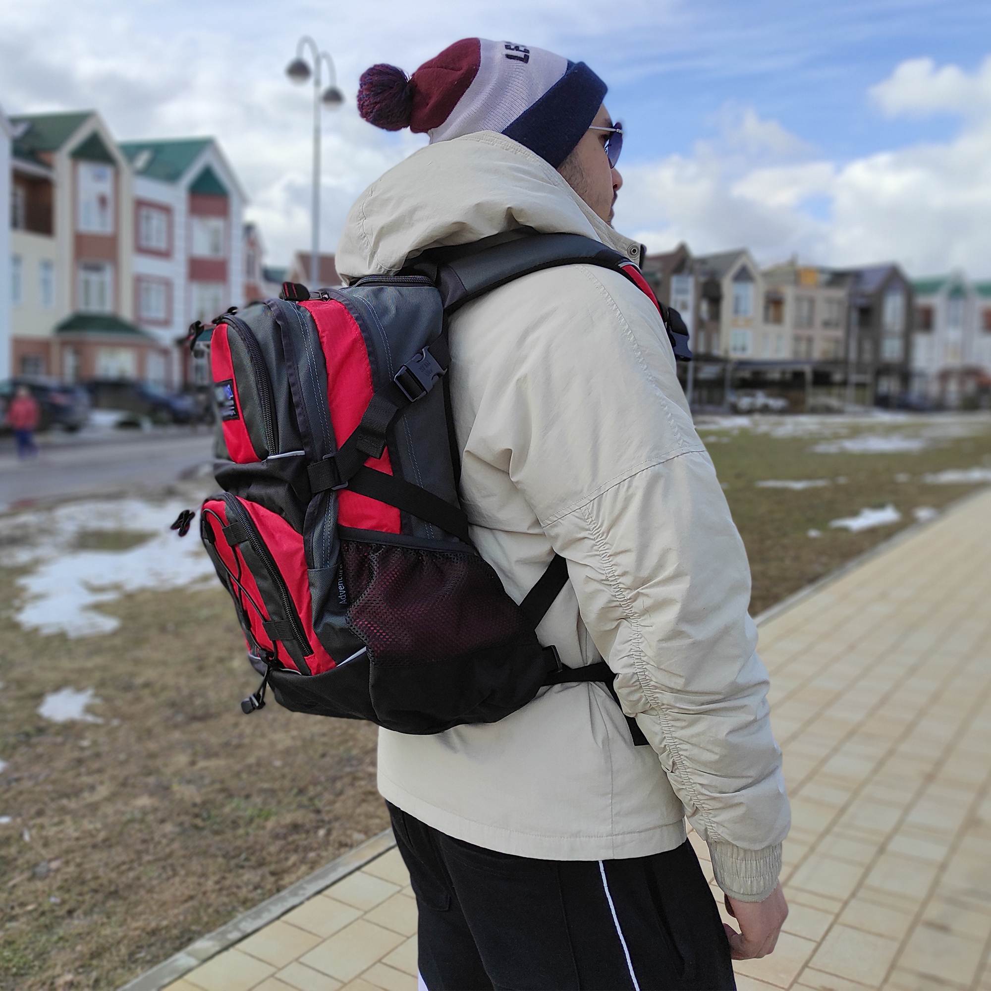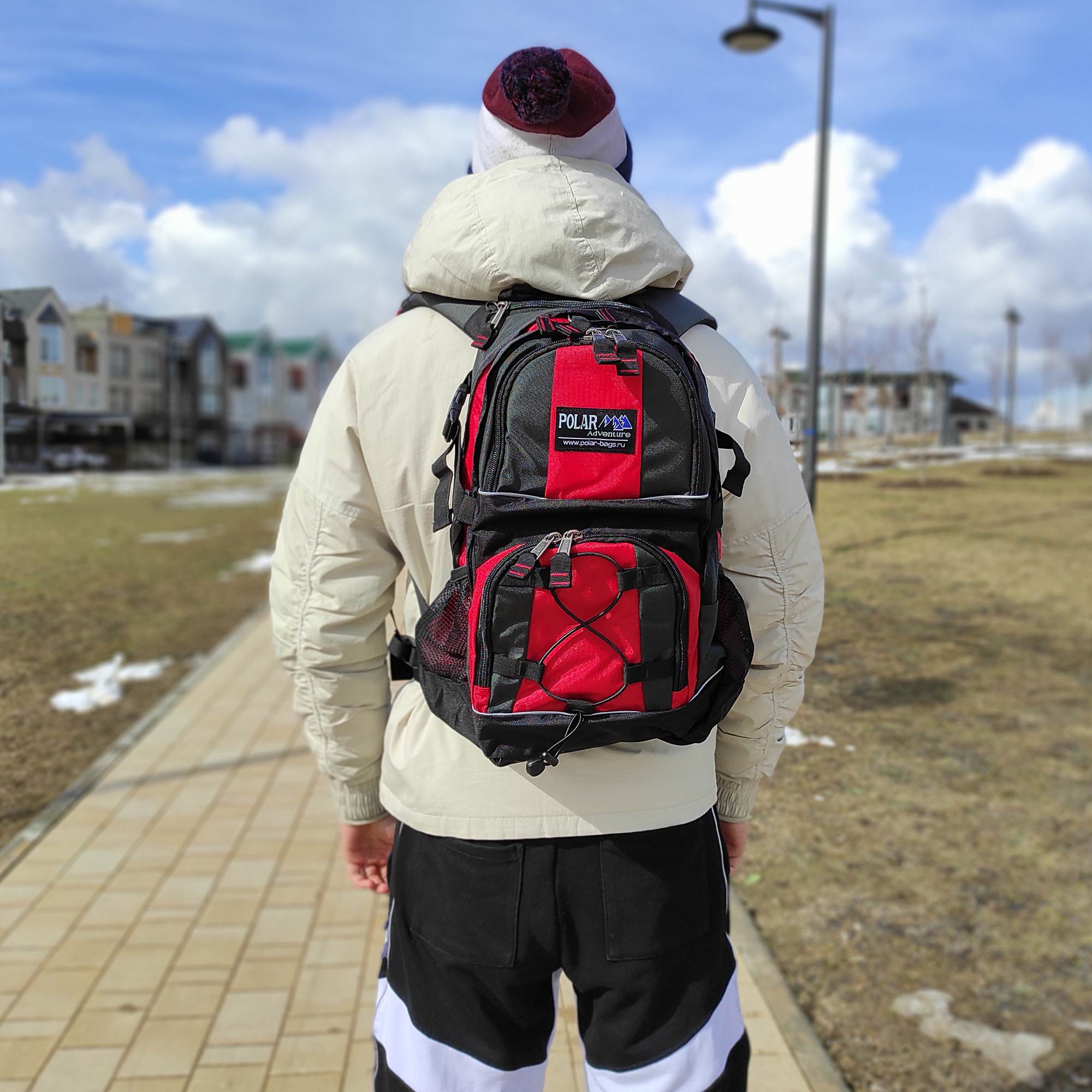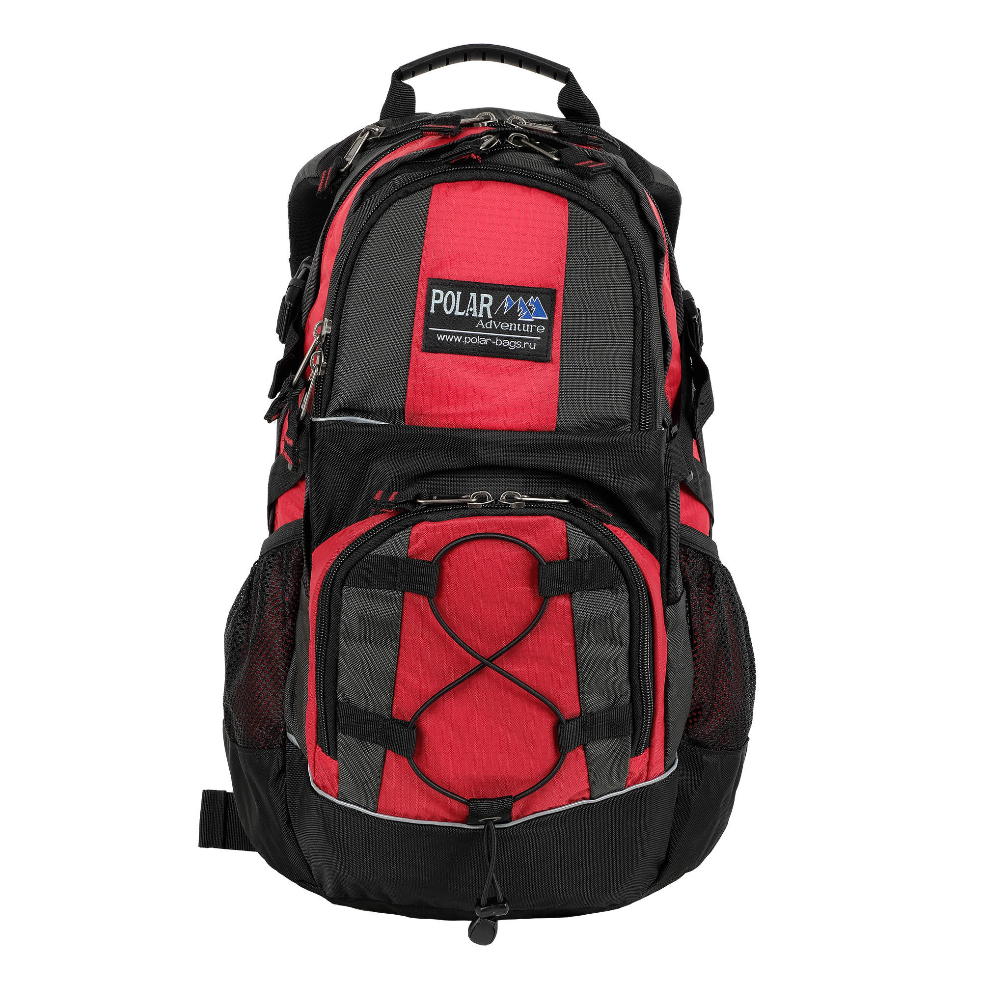 Материал полиэстер с водоотталкивающей пропиткой. Жесткая ортопедическая спинка с поролоновыми вставками по форме спины под сеткой для лучшего воздухообмена. Удобные лямки с дополнительными крепежами фиксаторами на талии и в области груди. Дополнительный чехол от дождя, который находится в кармашке рядом с ручкой. Чехол не пришит. 2 больших отделения с крепежами фиксаторами снаружи в форме зигзага. 2 боковых кармана из сетки на резинке. 2 дополнительных кармана с карманами и карабином для ключей внутри. Утягивающая резинка на переднем кармане.