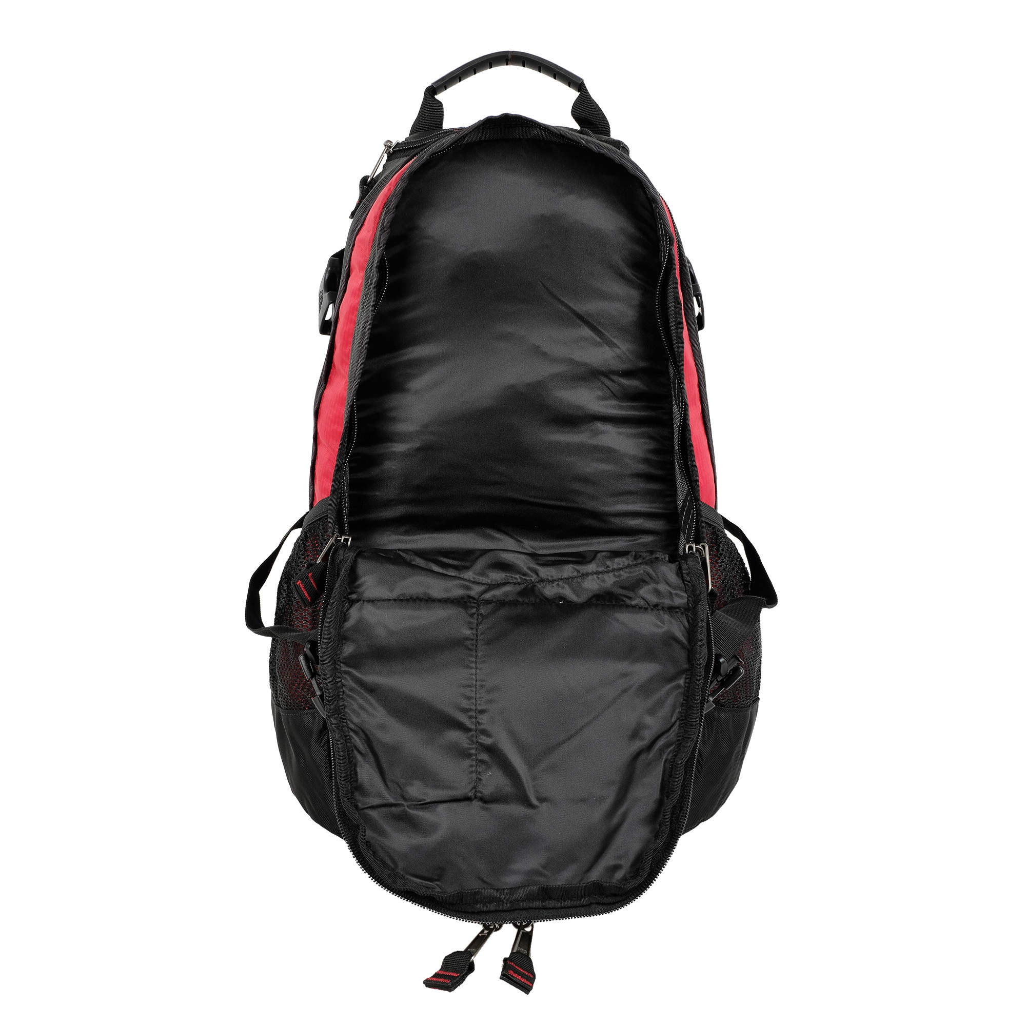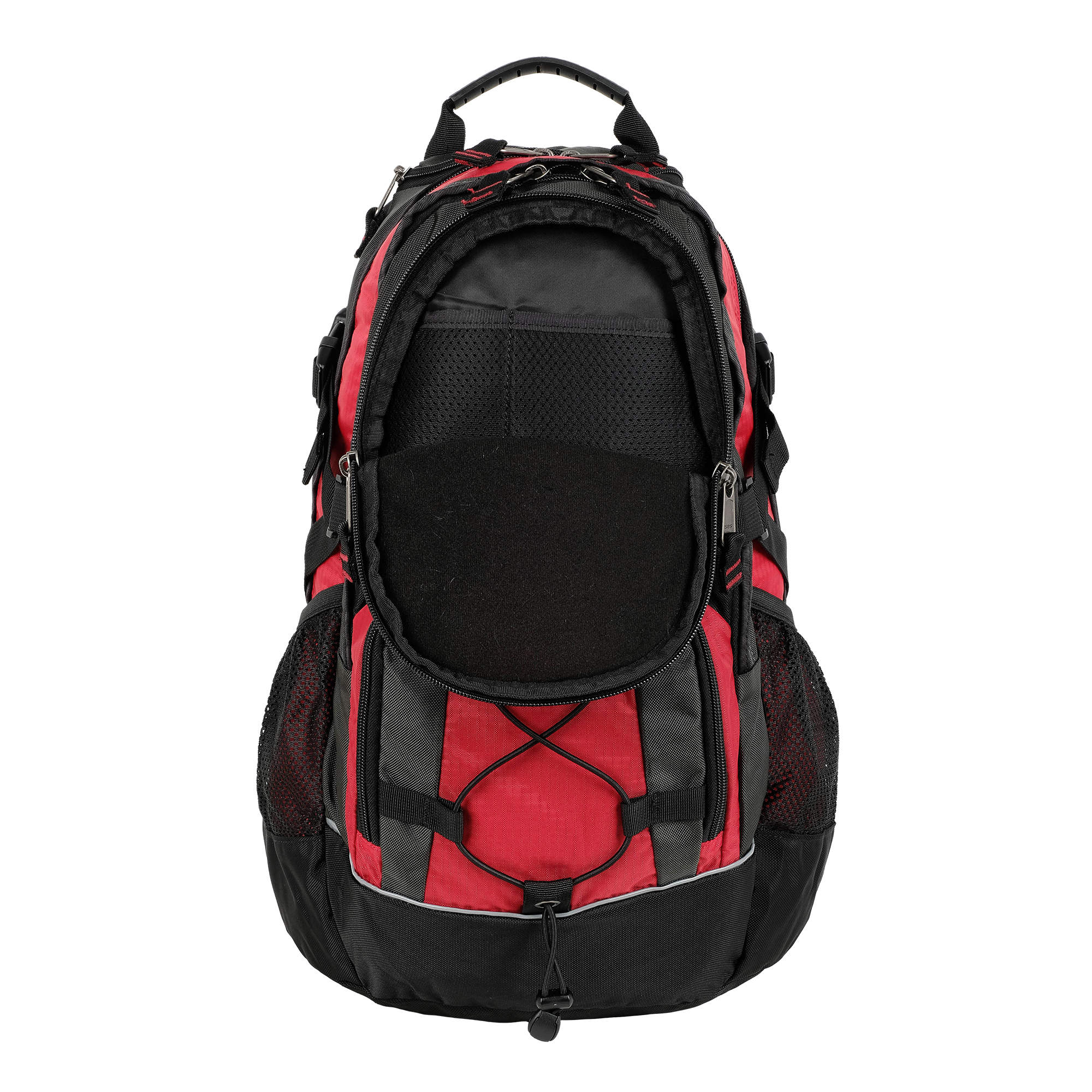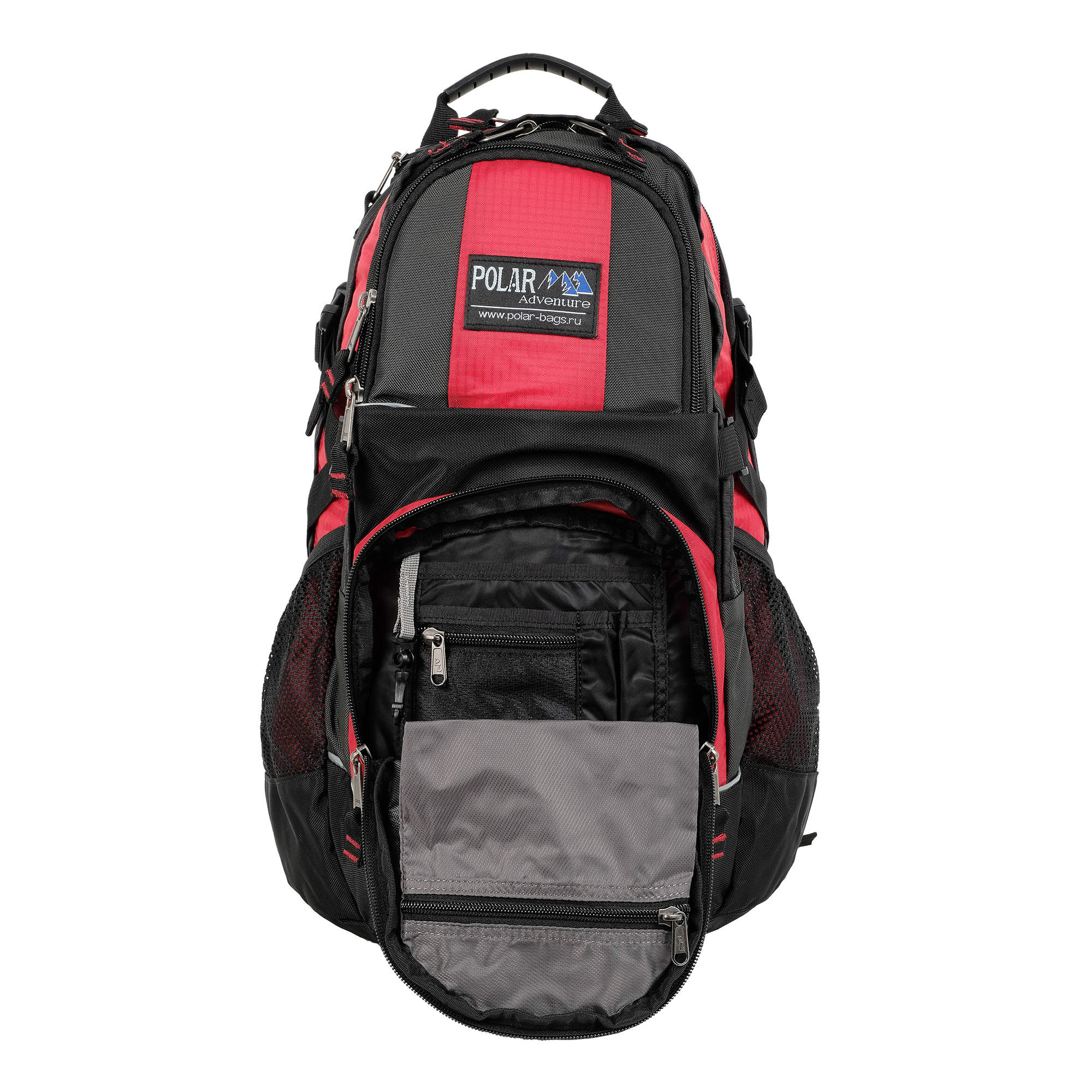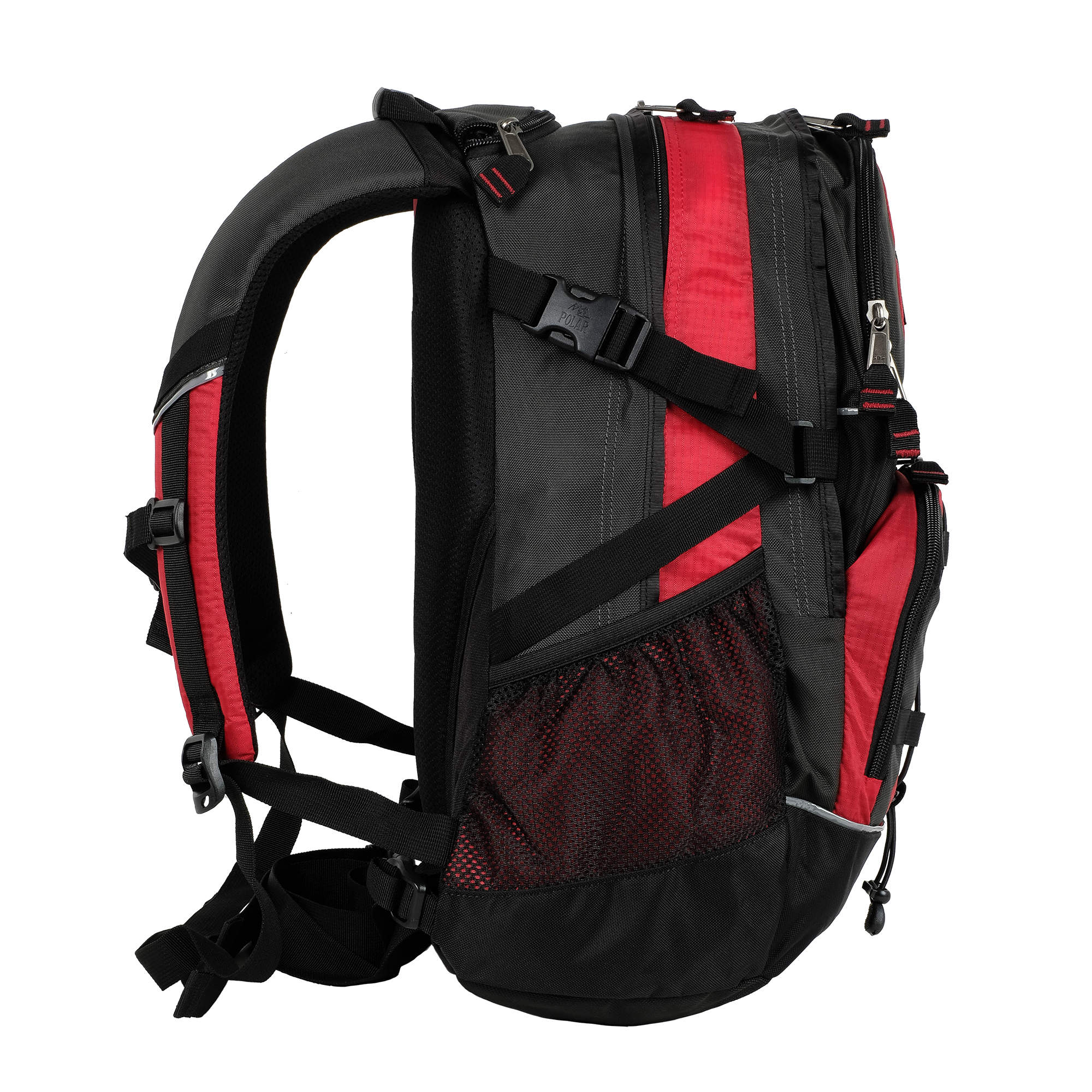 Материал полиэстер с водоотталкивающей пропиткой. Жесткая ортопедическая спинка с поролоновыми вставками по форме спины под сеткой для лучшего воздухообмена. Удобные лямки с дополнительными крепежами фиксаторами на талии и в области груди. Дополнительный чехол от дождя, который находится в кармашке рядом с ручкой. Чехол не пришит. 2 больших отделения с крепежами фиксаторами снаружи в форме зигзага. 2 боковых кармана из сетки на резинке. 2 дополнительных кармана с карманами и карабином для ключей внутри. Утягивающая резинка на переднем кармане.