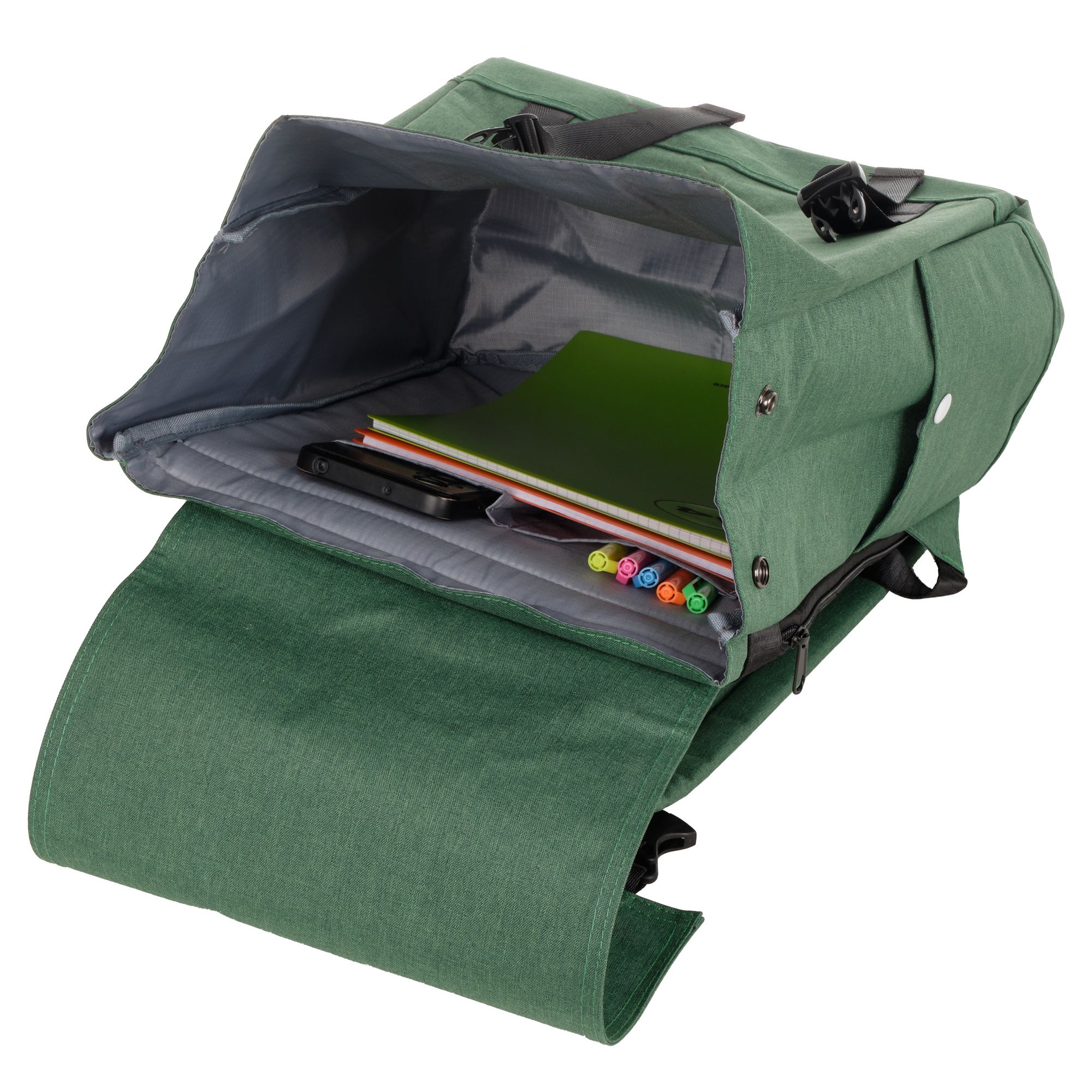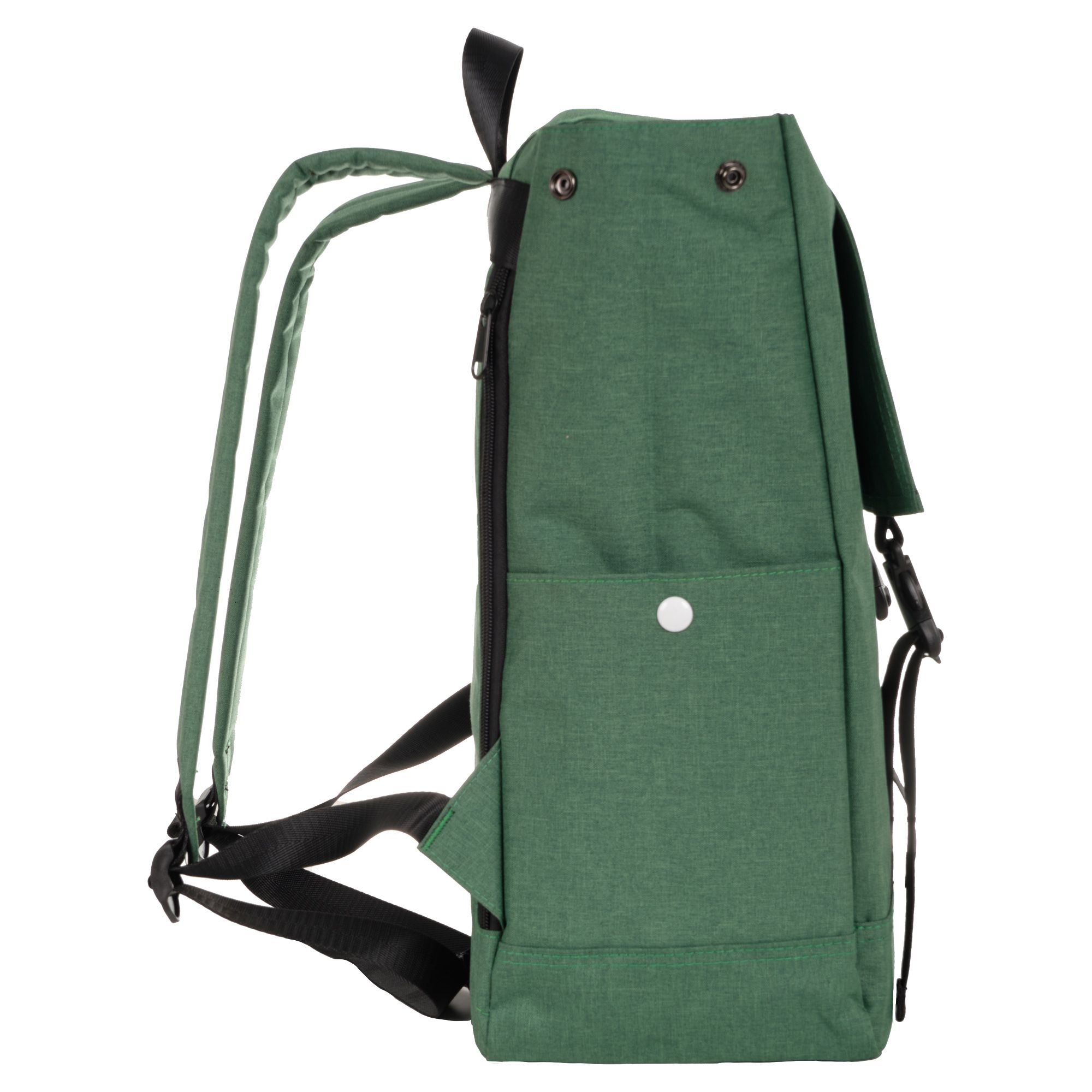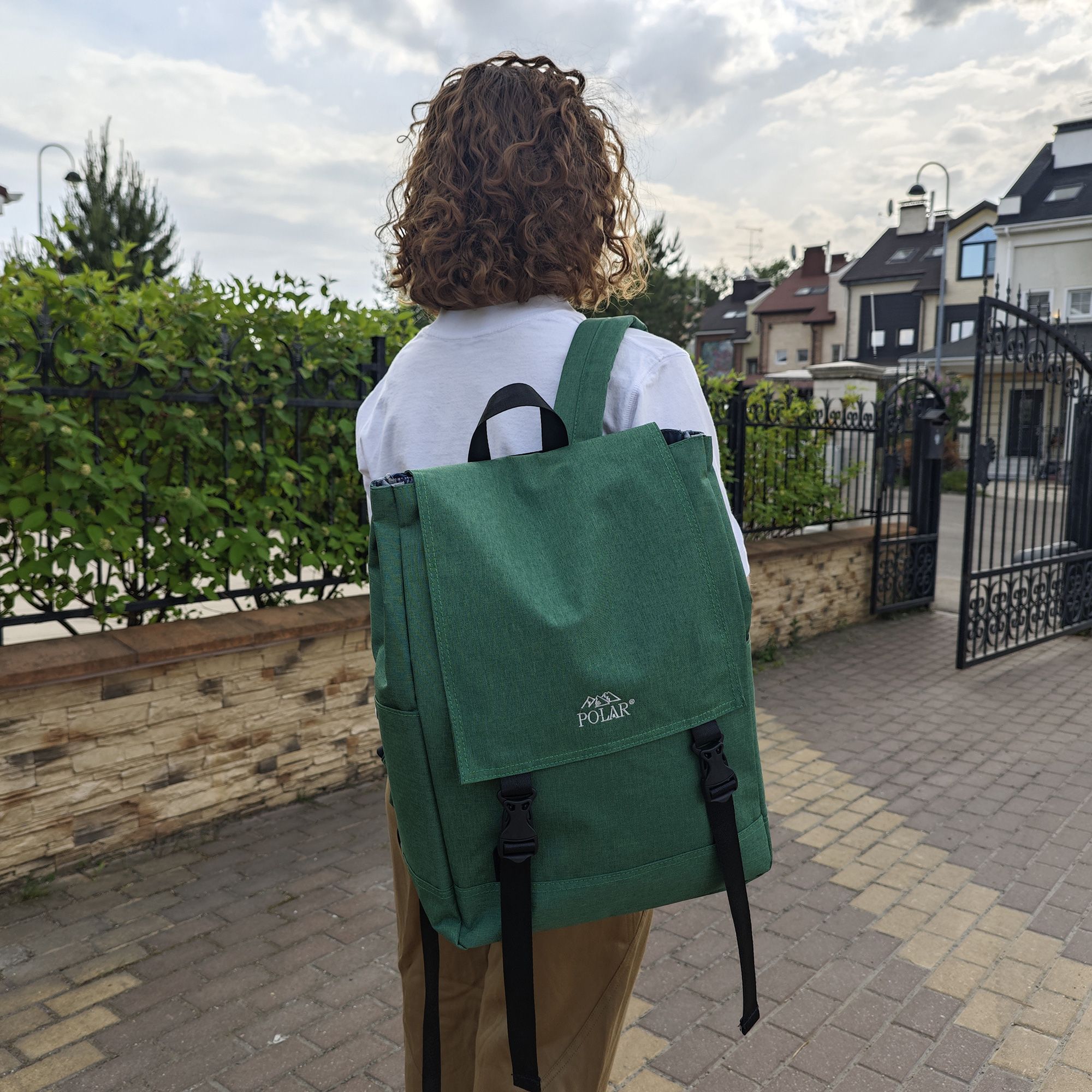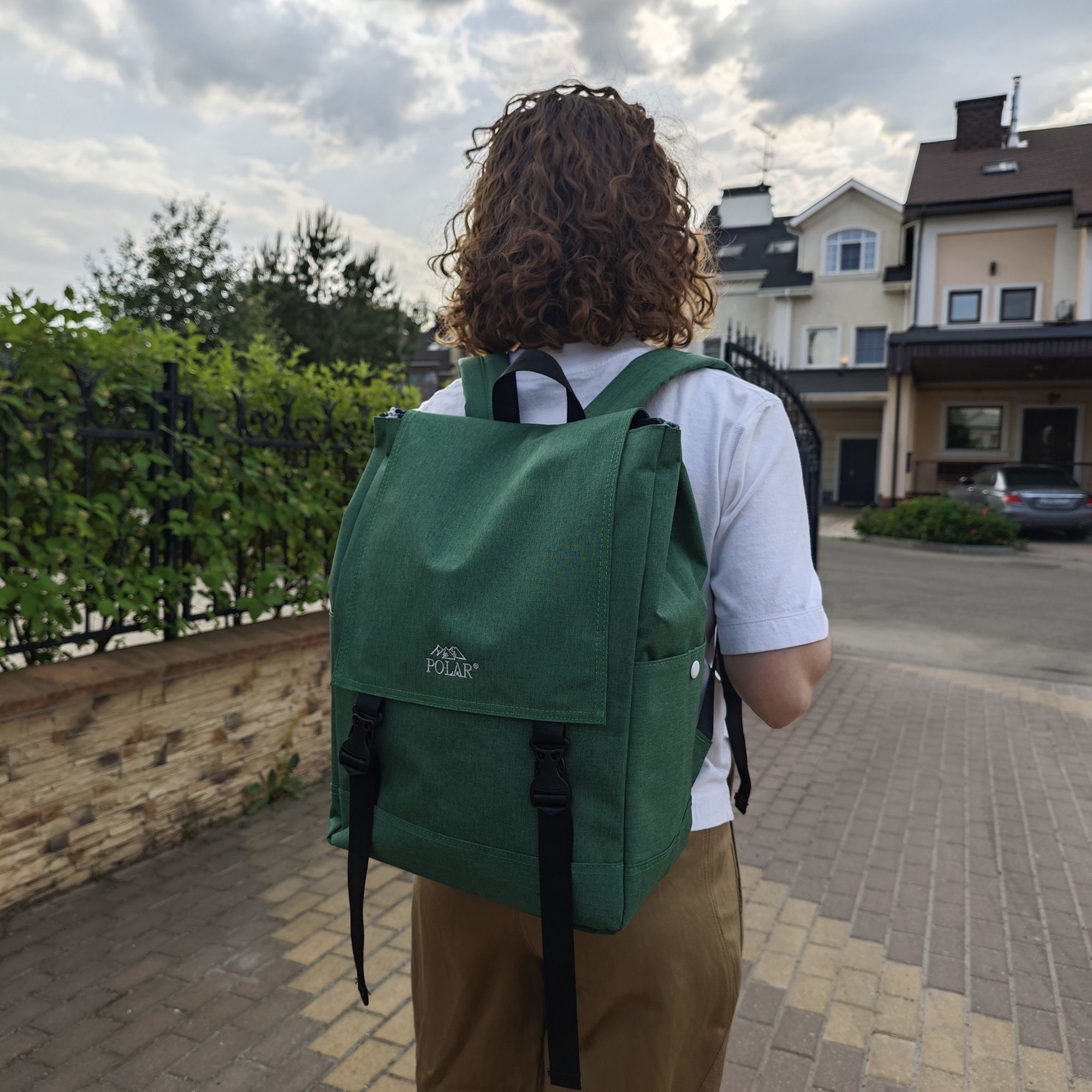 Стильный рюкзак фирмы POLAR для прогулок и учебы, путешествий и спорта, работы, школы, института с верхними клапанами на удобной пряжке. Такая конструкция позволяет менять объем рюкзака, когда вы захотите увеличить его основное отделение за счет клапана на застежке.  Так же верхний клапан — это дополнительная защита ваших вещей от краж и дождя. Рюкзак выглядит очень современно. Материал рюкзака с водо- и грязеотталкивающей пропиткой.  Внутри один большой карман для документов формата А4, планшета или ноутбука до 15" и два небольших кармана. В основное отделение рюкзака можно попасть через молнию на спинке рюкзака. По бокам расположены два открытых кармана. Длина лямок 93 см, ширина 5,5 см.